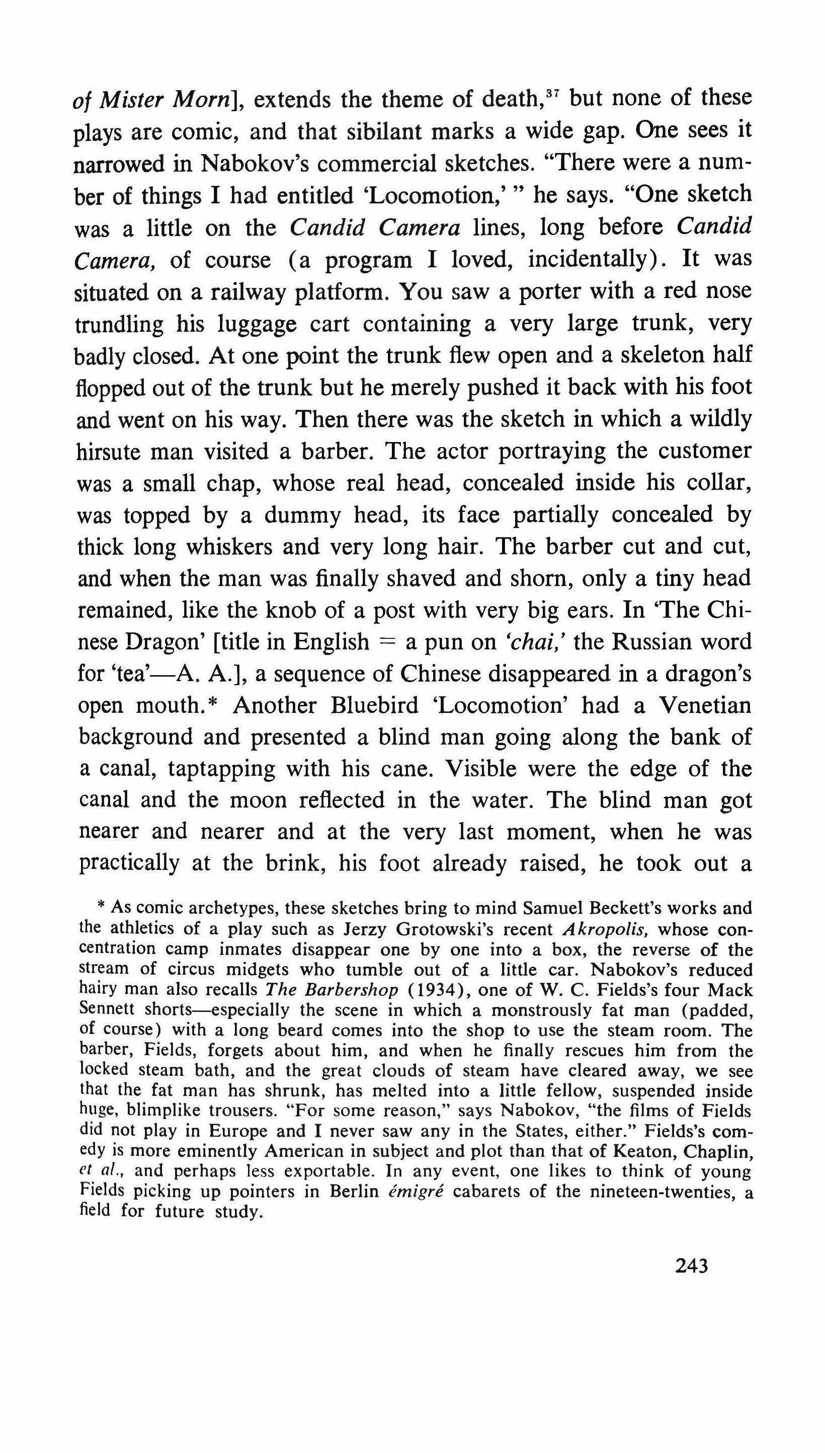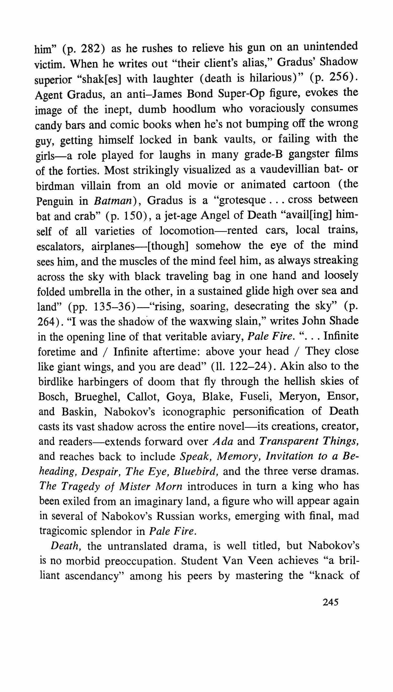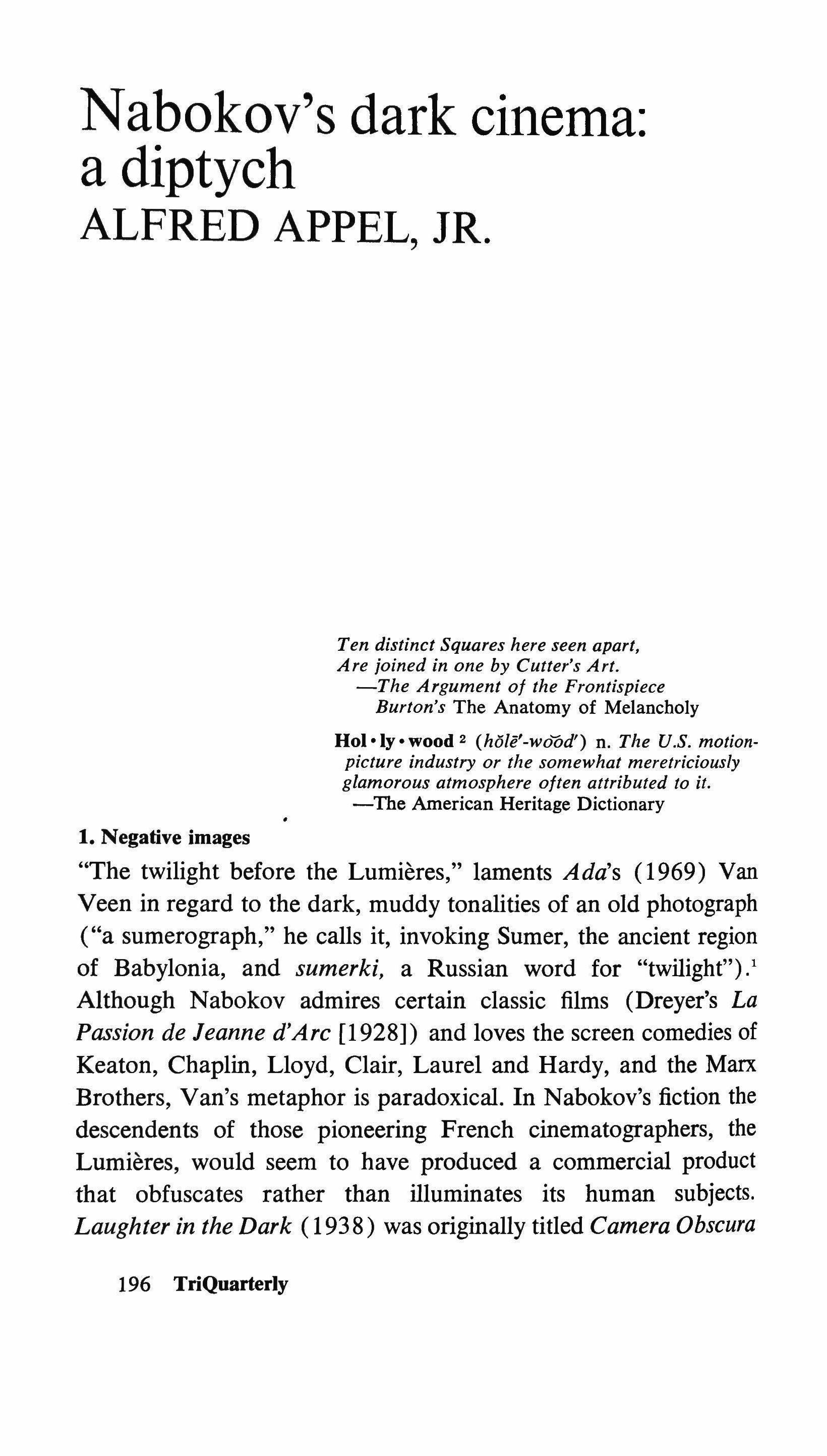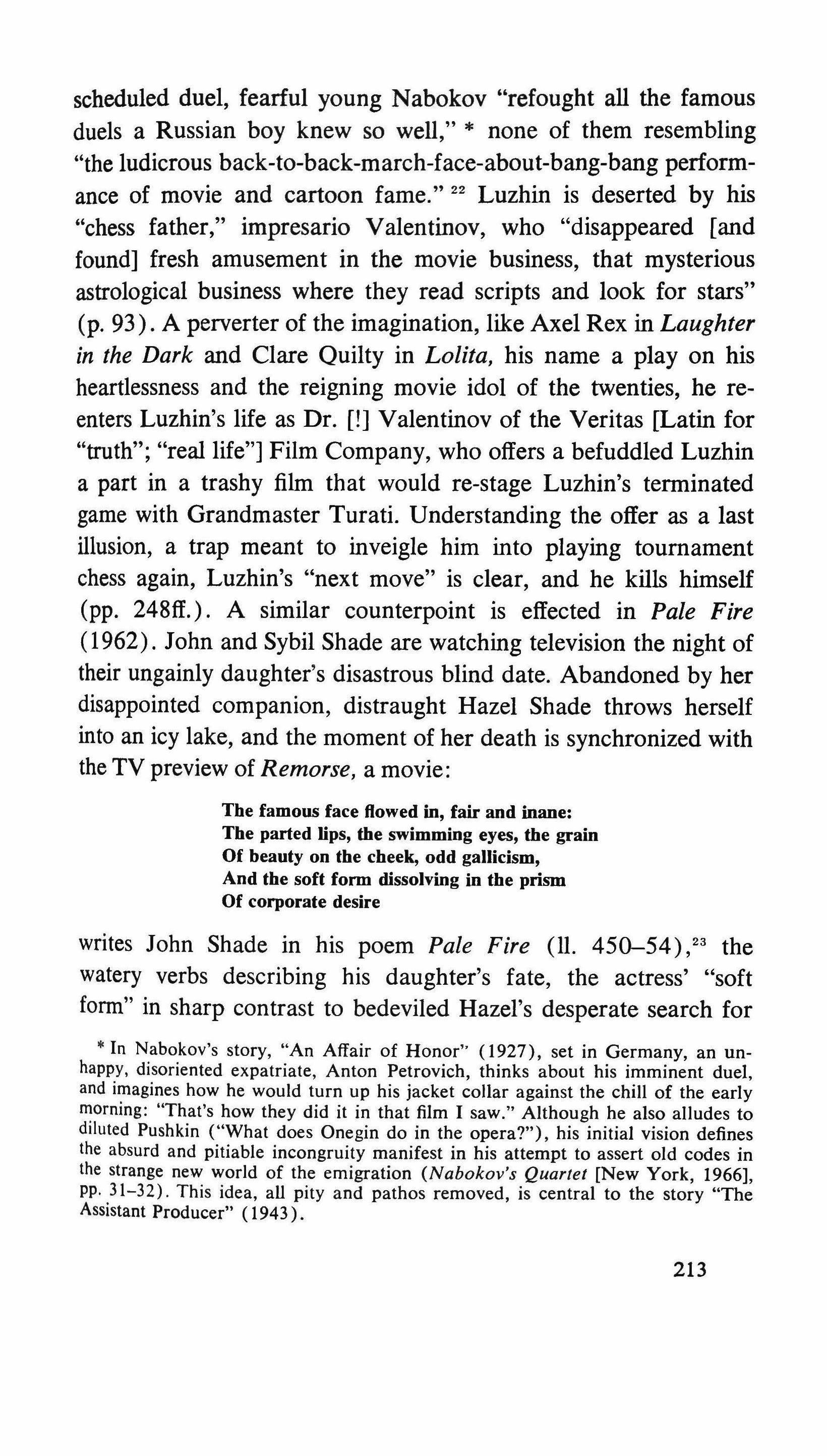 Letters. His Walking to Sleep (poems), The School for Wives (translations from Moliere), and Opposites (poems and drawings for children) have all been published by Harcourt Brace Jovanovich. ALEX M. SHANE has published articles and reviews in the Slavic and East European Journal, Slavic Review, Russian Literature TriQuarterly, and the Modern Language Journal. His The Life and Works of Evgenij Zamjatin was published by the University of California Press in 1968. He is Professor and Chairman of the Department of Slavic Languages and Literatures at the State University of New York at Albany. MIRRA GINSBURG is an editor and translator living in New York. Her recent works include Mikhail Bulgakov's Heart of a Dog (Grove), The Life of Monsieur de Moliere (Funk and Wagnalls), and Yevgeny Zamyatin's We (Viking Press). Her translation of Isaac Bashevis Singer's Altele appeared in TriQuarterly 18. BRANT BASSETI' is a graduate student in the Department of Slavic Languages and Literatures, University of California, Berkeley. L. P. IZHORSKY has spent some time in the Near East. His main occupation is travel. When last heard from, he was in Greece and, with the help of friends, hopes to move soon to an even more intriguing region. THEODORE WEISS has published six collections of poetry, most recently The World Before Us, Poems: 1950-1970 (Macmillan). His The Breath of Clowns and Kings: Shakespeare's Early Comedies and Histories was published by Chatto & Windus, London, and by Atheneum. He is completing a new book of poems, Open Season. CHARTY BASSETT is a graduate student in Russian Literature at the University of California, Berkeley. ALFRED APPEL, JR.'s books include The Annotated Lolita (a McGraw-Hill paperback) and a previous TriQuarterly co-editorship, Nabokov (available as a Clarion paperback). His contribution to this issue is an excerpt from his forthcoming book, Nabokov's Dark Cinema. A Guggenheim Fellow for 1972-73, he is presently on leave from Northwestern University, writing a study of Nabokov and, for relaxation, I Love You, Too: The American Film Noir, 1941-1958. ELIZABETH SHEPARD is a Research Associate at the Center for Slavic and East European Studies, University of California, Berkeley. PARKER TYLER is a poet and critic whose work includes The Divine Comedy of Pavel Tchelitchew (Fleet), for which he received grants from the Chapelbrook, Ford, Ingram-Merrill, and Guggenheim Foundations, and a recent volume of verse, The Will of Eros: