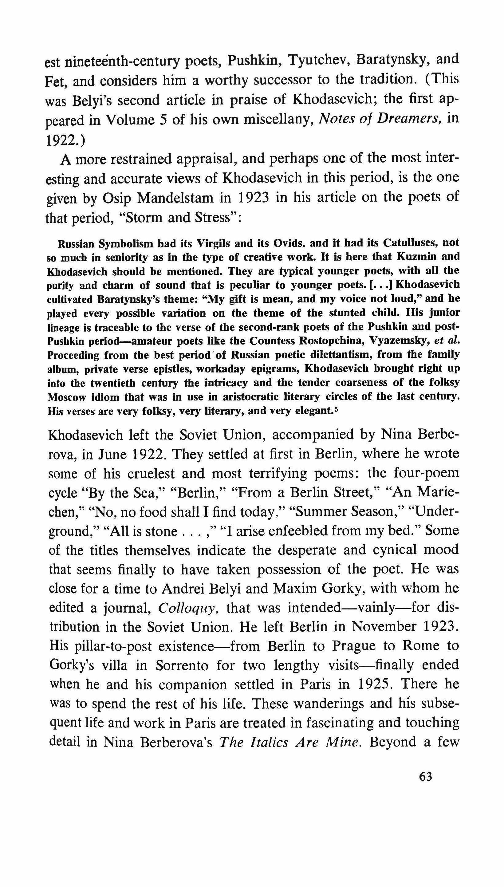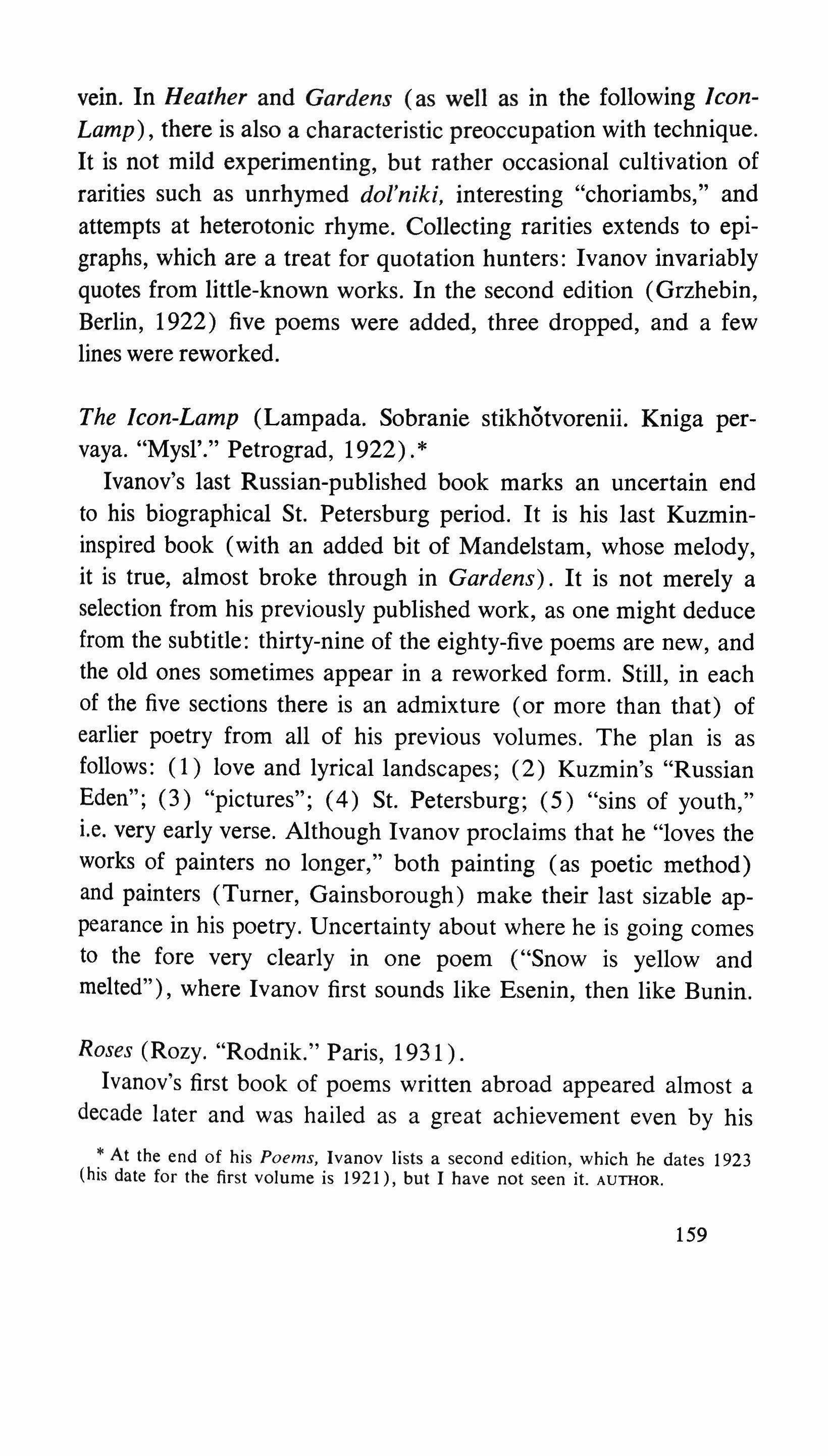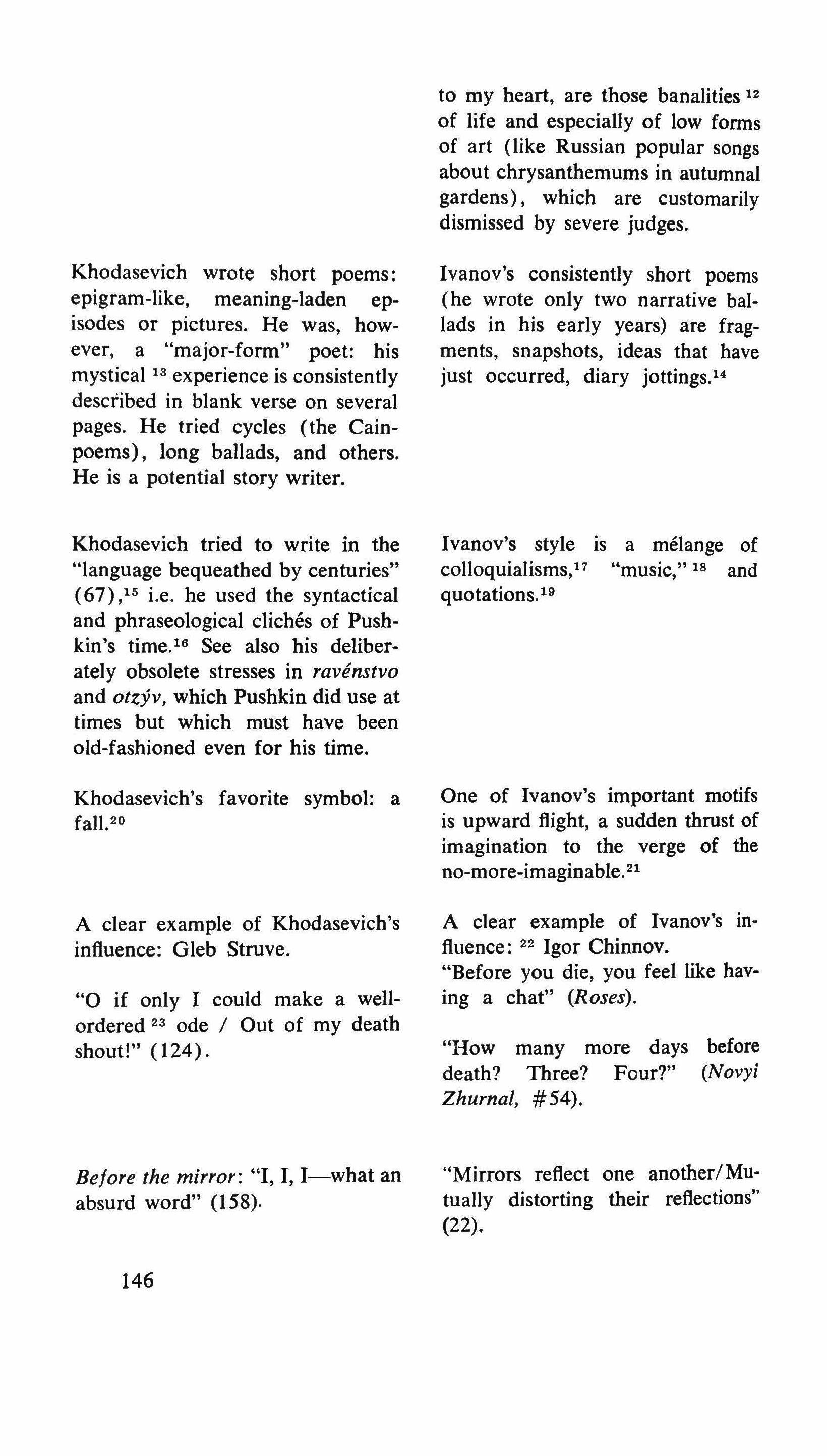 3. "But Poplavsky's surrealistic world is created iIlegitimately, using means borrowed from another art, namely painting (some of the critics have pointed out that Poplavsky is actually a visual rather than a musical poet; his poetry has been compared to Chagall's paintings )." Gleb Struve, Russkaya literatura v izgnanii (Russian Literature in Exile) (New York, 1956), p. 339. The observation is absolutely correct, but why is cross-fertilization between the arts illegitimate? Russian poetry of the twentieth century in particular has a deep-going and highly legitimate symbiotic involvement with both painting (Voloshin, Mayakovsky, Khlebnikov) and music (Belyi, Blok, Kuzmin, Pasternak).