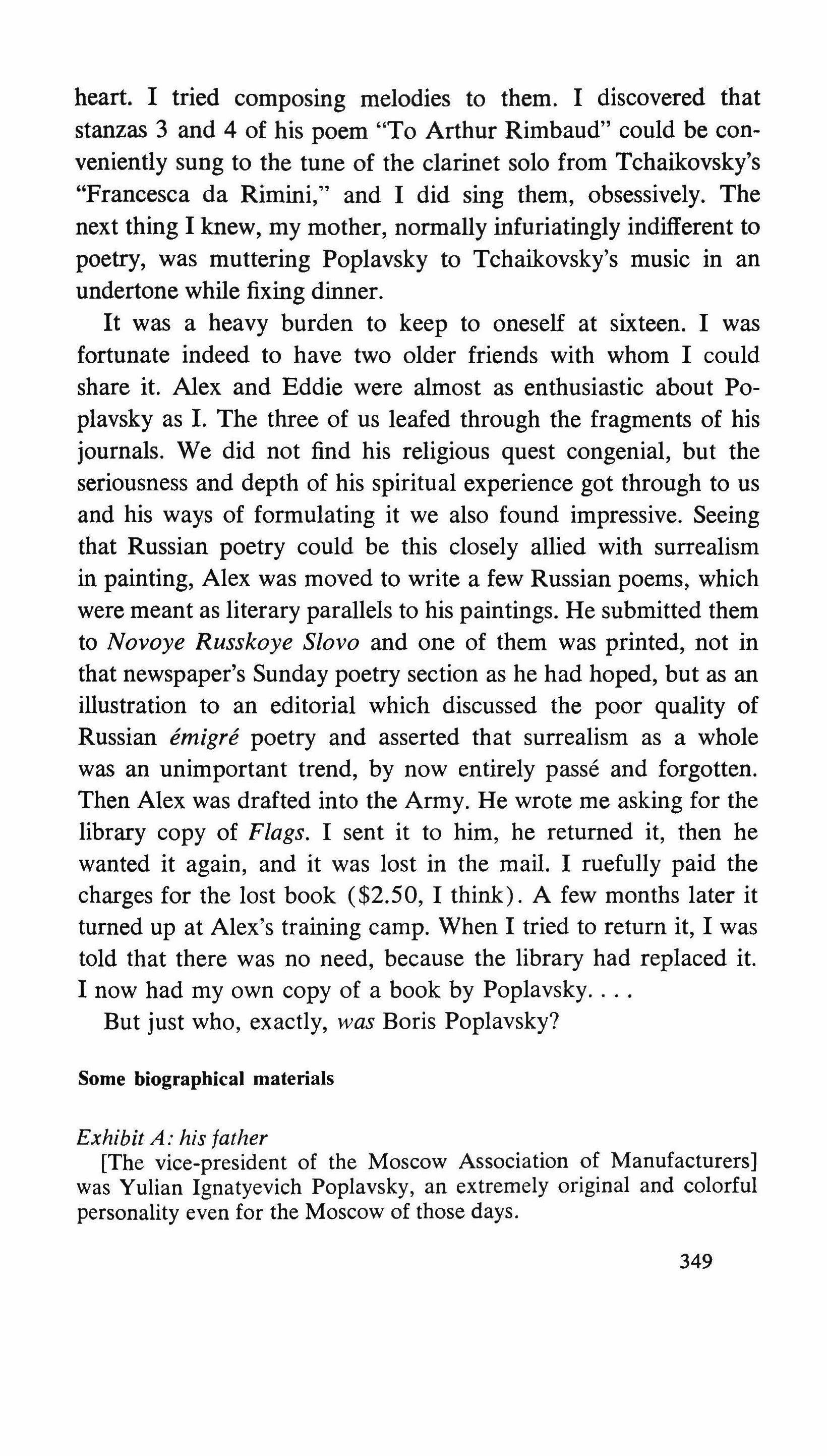 my favorites during my school years in Los Angeles. They let me, and I wrote three brief pieces on Khlebnikov, Pasternak, and Poplavsky; these were translated into German and published in Das Lot, Volume IV, in 1950, with a selection of translated poems by each of these poets. The overindulgent accompanying note identified me as the author of "numerous articles published in American newspapers and magazines," but apart from a few pieces in the college newspaper, this was actually my debut in print. I'm glad it had to do with Poplavsky and that I already then called him the most interesting poet produced by the Russian emigration between the two world wars.