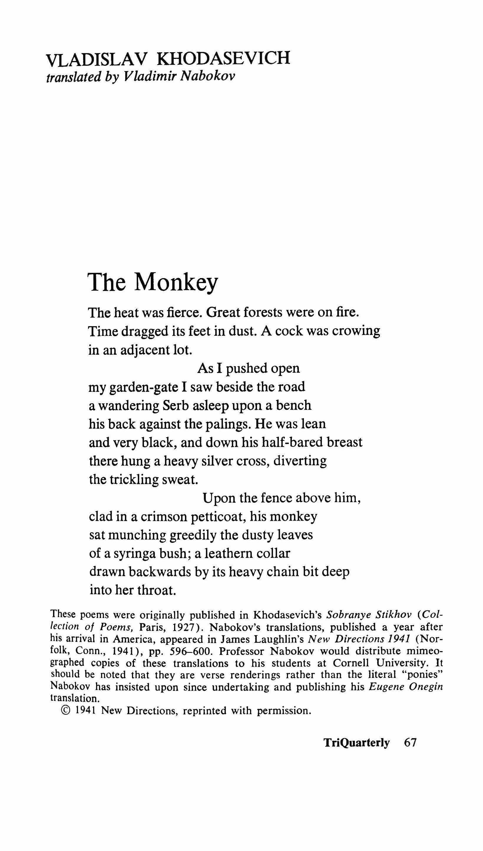 16. "I did not meet Poplavsky who died young, a far violin among near balalaikas. His plangent tonalities I shall never forget, nor shall I ever forgive myself the ill-tempered review in which I attacked him for trivial flaws in his unfledged verse," Speak, Memory (New York, 1951), p. 216. This is repeated, with the addition of a quoted line from Poplavsky's poem "Morella," in Speak, Memory (an expanded version) (New York, 1966), p. 287.