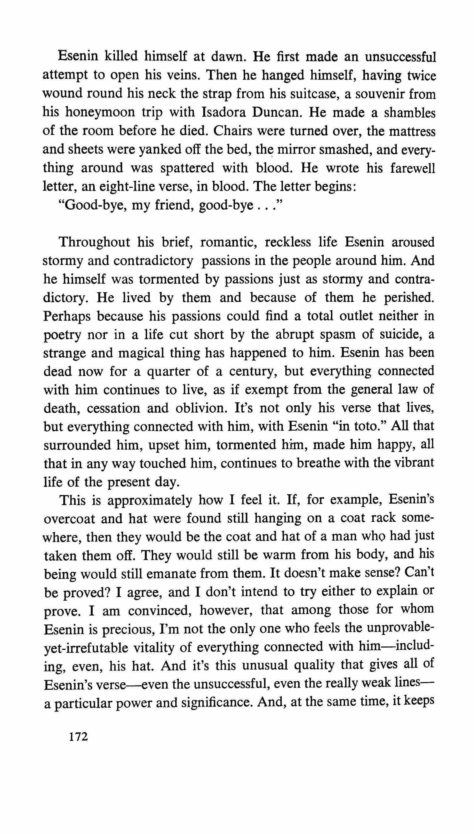 about a thirty-kilogram weight or a chair, held horizontally by its back in his hand, as he laughed at the gloomy, lifeless, unascetic, sentimental, disbelieving Christianity of the Paris emigre poets."