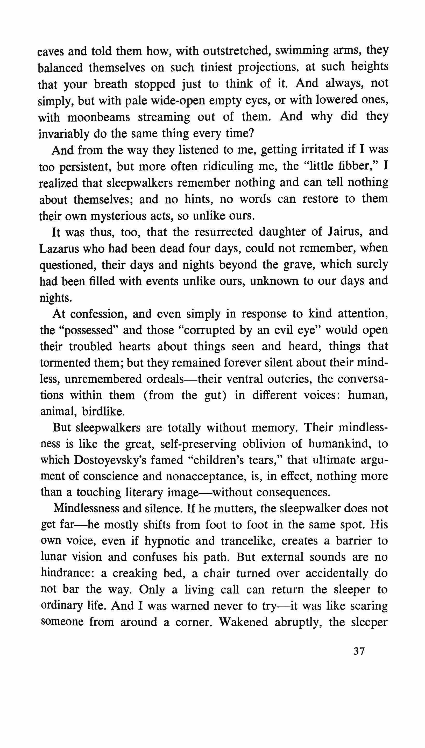 2. "You thought, Oleg, that you could at last do without God, rest from His insatiable demands; and see, now He is doing without you Look, nature is about to enter upon her sad, brief summer triumph and you were asleep, your heavy head full of the hot waters of sleep, and you dreamed of earthly, full-blooded, bearded life. Once again you were insolent to God, Oleg, and tried living without Him, and your face hit the ground, heavily, stupidly, clownishly. You finally awoke from the pain, took a look around, and see, the trees are already in bloom and have hung out their vivid, abundant new leaves. It is summer in the city and again you are face to face with God, whether you want to be or not, like a child that conceived the wish to hide from the Eiffel Tower behind a flowering shrub in the Trocadero garden and after walking around it was instantly overtaken by the iron dancer-monster that takes up the entire sky. You try not to notice it, but it hurts you to look at the white sky and a heavy, sweaty stuffiness is pressing on your heart. You are again in the open sea, in the open desert, under an open sky covered up by white clouds, in the intolerable, ceaseless, manifest presence of God and sin. And there is no strength not to believe, to doubt, to despair happily in a cloud of tobacco smoke, to calm yourself at a daytime movie. The entire horizon is blindingly occupied by God; in every sweaty creature He is right there again. Eyesight grows dim and there is no shade anywhere, for there is no home of my own, but only history, eternity, apocalypse. There is no soul, no personality, no I, nothing is mine; from heaven to earth there is only the fiery waterfall of universal existence, inception, disappearance."