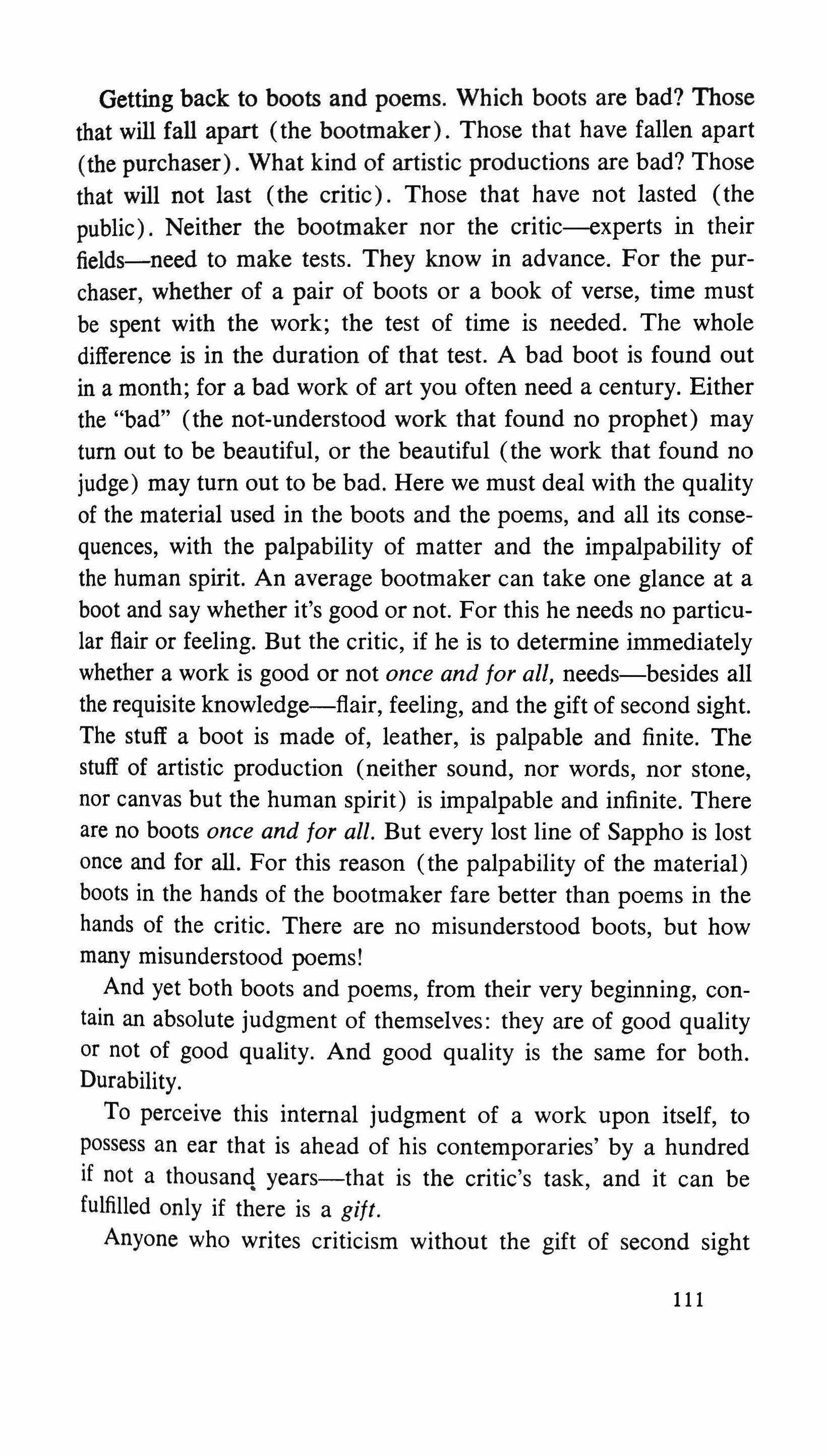 109. I need only those writers whom I can apply practically in my life, from whom I can learn a particular form of pride or pity and, of course, whom I can develop and alter in my own way. Chekhov teaches me to endure in a special way, not to surrender, to hope, for in Chekhov there is much that is Roman, there is much of "no matter what happens," of quand meme. With Dostoevsky one can be ill and die, separate and perish, but it is impossible to live with him. As for Tolstoy, with his ancient Hebraic family idylls, I find him repulsive. But Chekhov I hope to put to use, after first rendering him harmless. How? By expanding and developing his admiration for the perishing, beautiful failures, by cleansing him of his disgusting squeamishness and his dignified contempt, contempt for what has failed, what has perished, i.e. extending him in a Christian or, more correctly, specifically Orthodox direction.