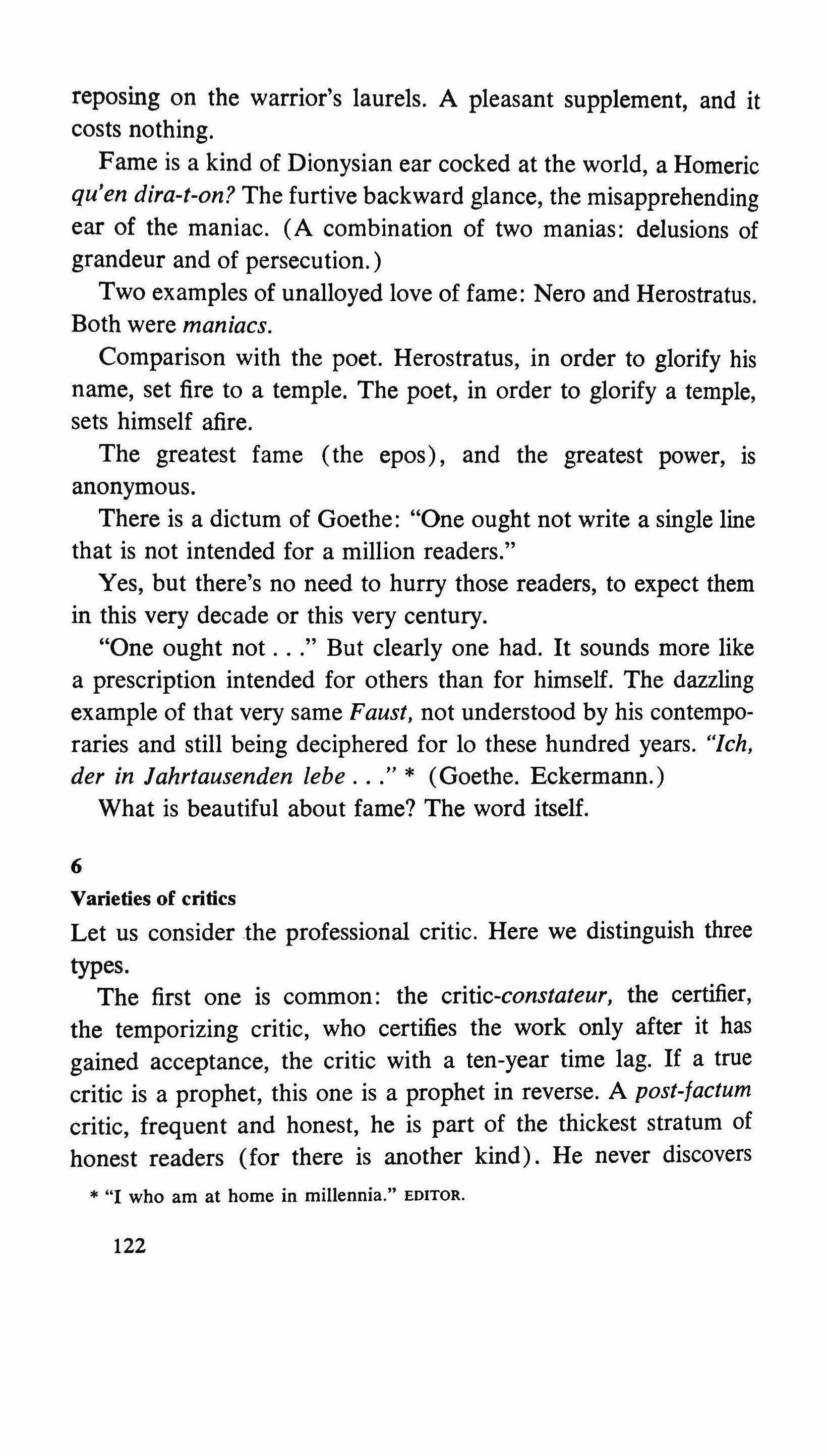 115. It seems to me that the closest work we have to the spirit of the Prometheus of Aeschylus is Chekhov's Ivanov. Let us note, en passant, that the Prometheus of Aeschylus is one of the most pretentious heroes in world literature. But then, is there anything more beautiful than heroic pretentiousness, for is not the perishing hero higher than the smugly successful hero? And is not the point of a perishing hero in his pretense at being a hero?