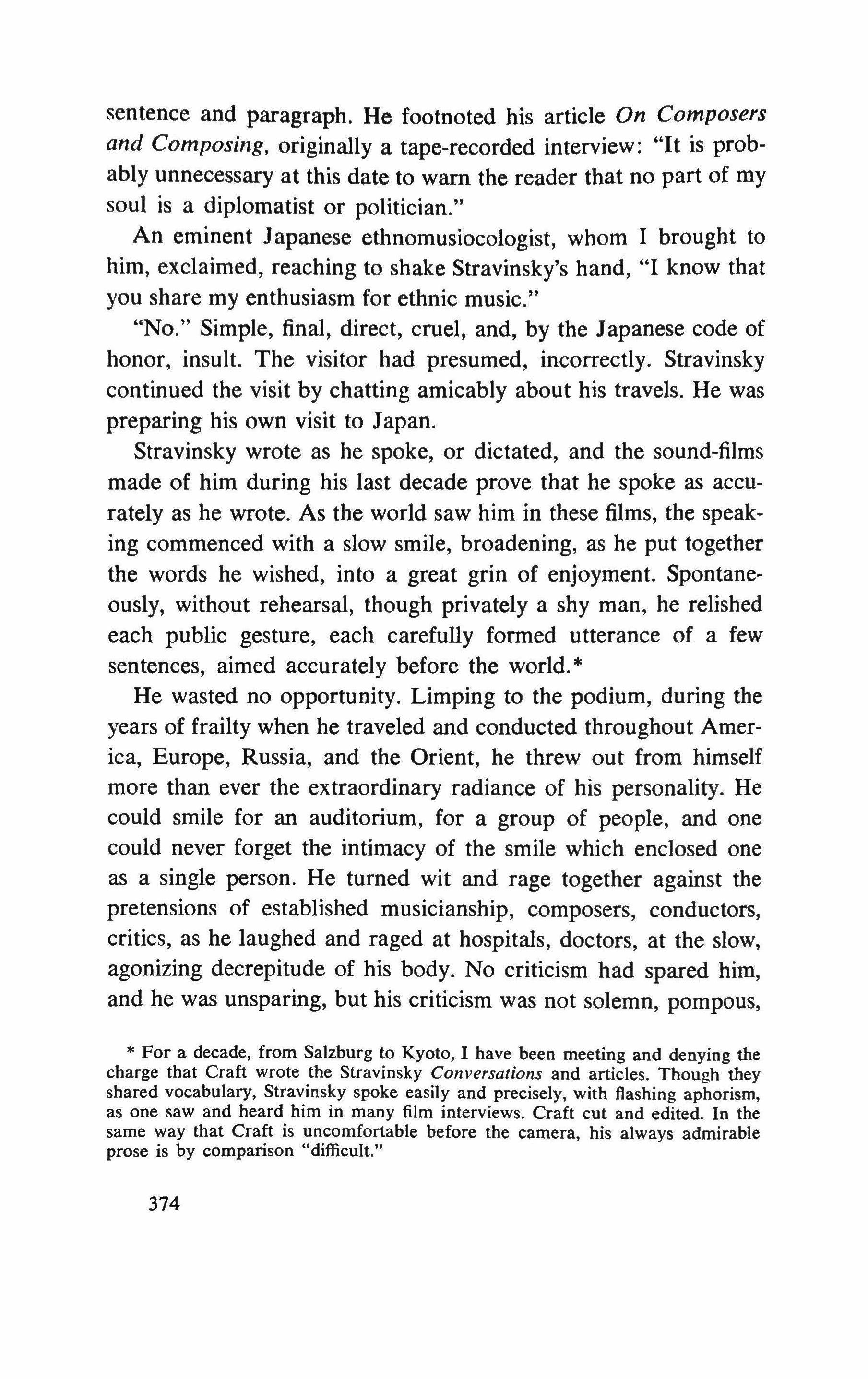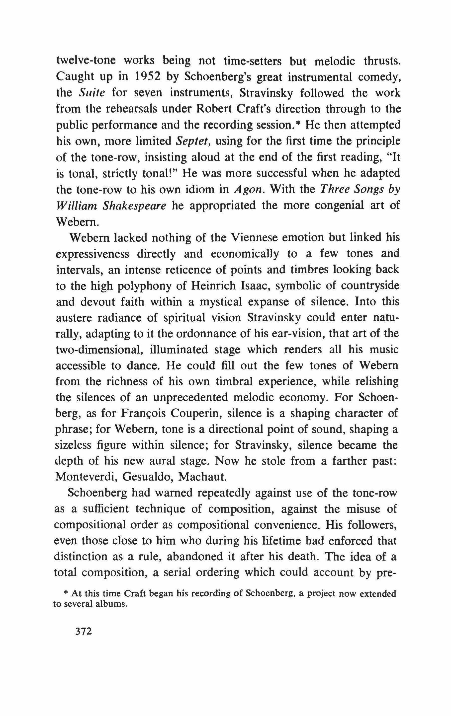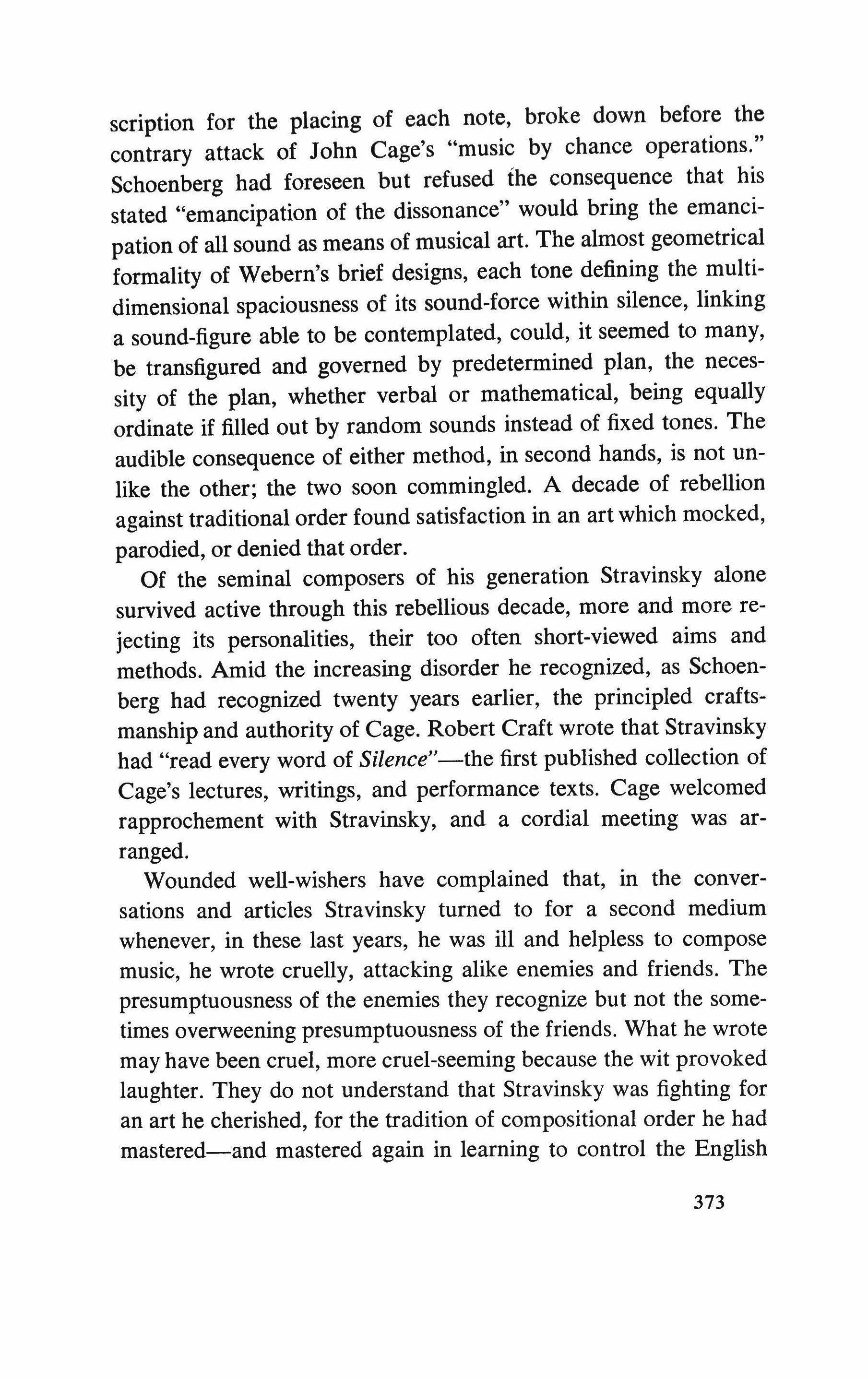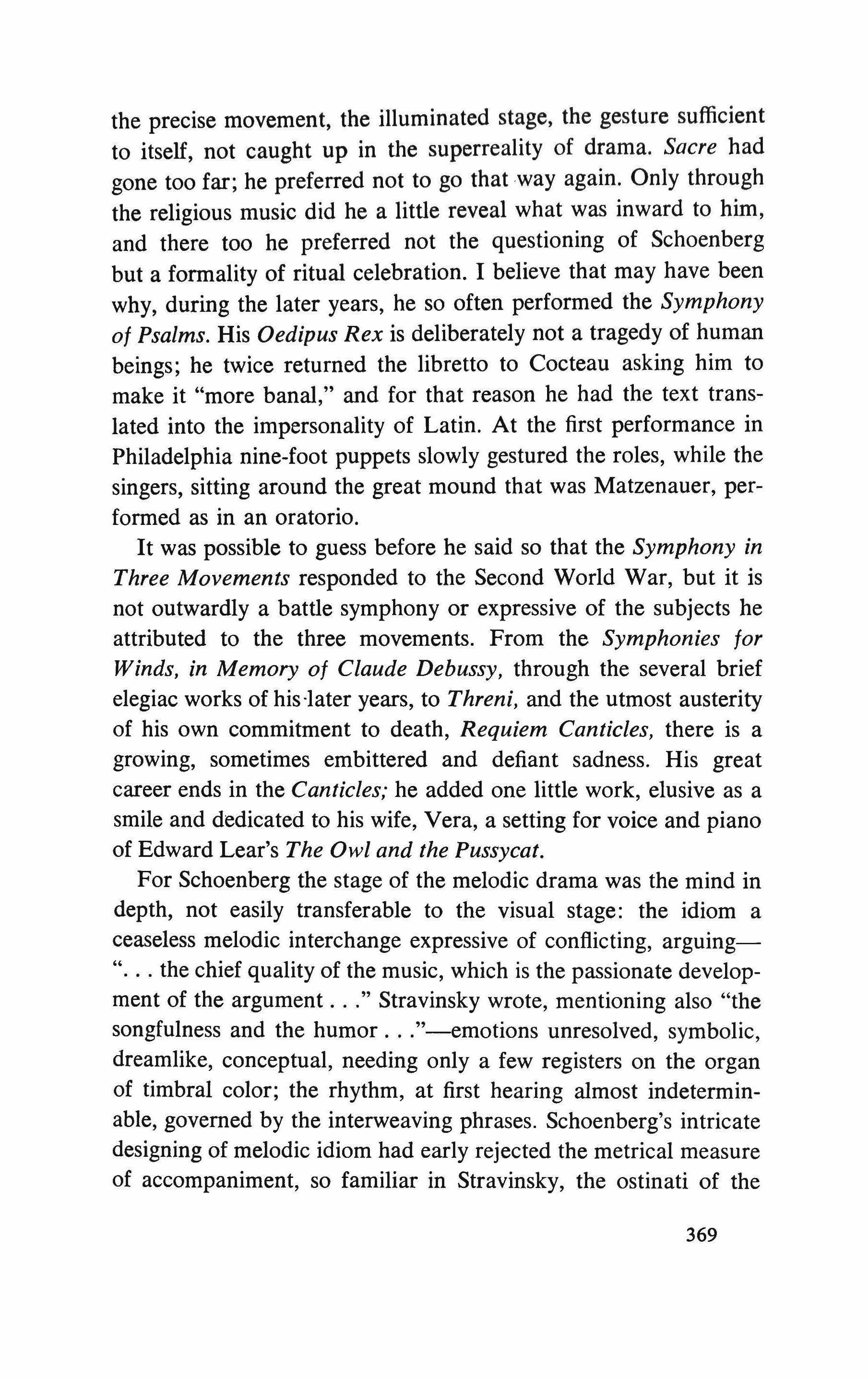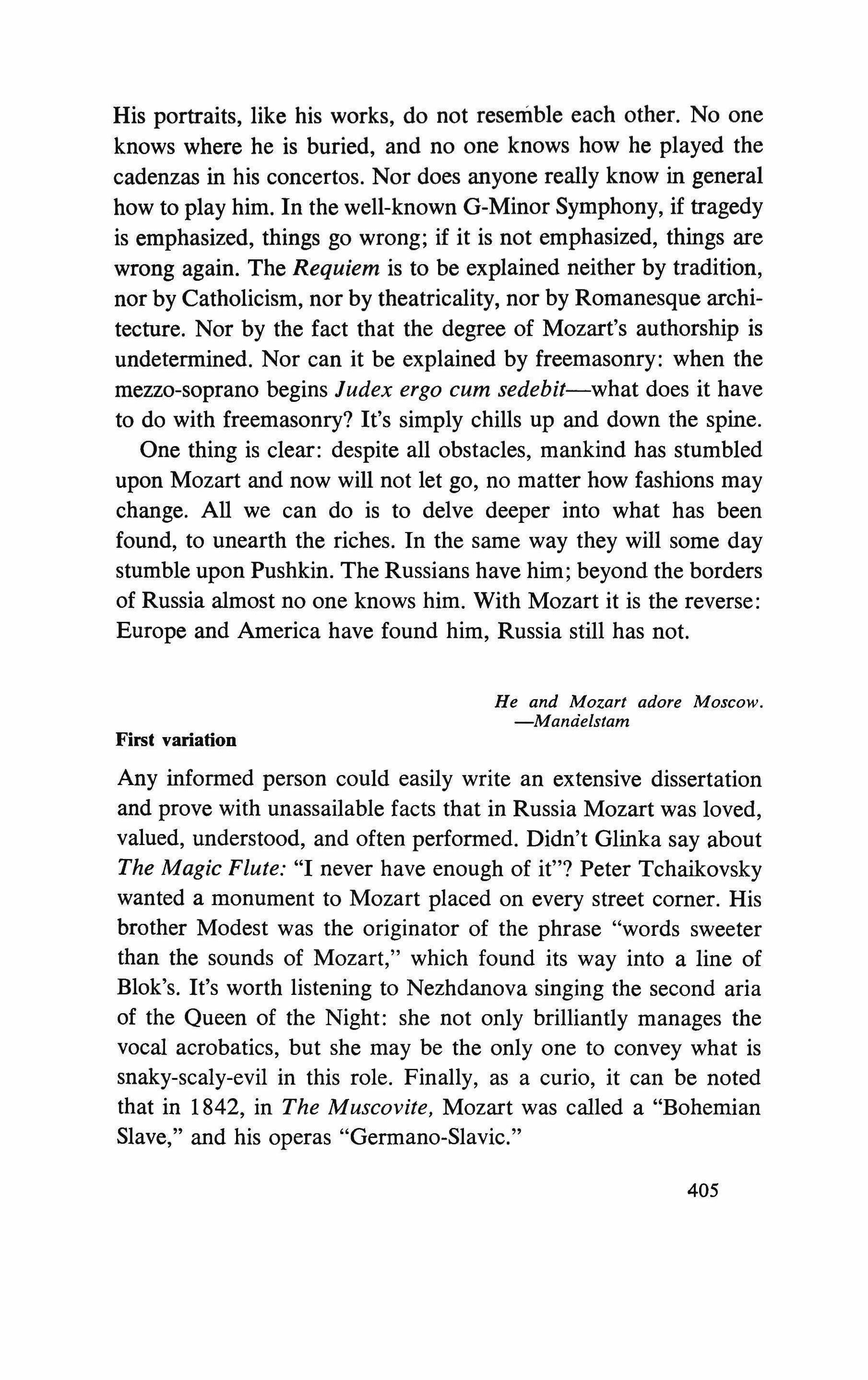 will reveal a Pnin who has landed firmly on his feet: a Departmental Chairman, "a martinet" in a Hawaiian shirt! Pnin's triumph (such as it is) is not a self-congratulatory reflection of Nabokov's American success. Lolita was not yet a best seller, and that optimistic rhythm pulsates through much of Nabokov's emigre fiction. Although Nabokov's spectral emigre world is circumscribed by loss and grief, there is almost always a redeeming sense of gaiety at its center; Despair (1936) and The Gift (1937-1938) variously employ a signal narrative dateline-April I-and not because it is Gogol's birthday. Even the most minor characters in Transparent Things (1972) are in mourning and dress in black. Death is everywhere because the compact novel-The Eye's (1930) brightened, lifted shade-is deftly structured as a ghost story, and its omniscient overseer, in conversation, concurs with this reading: "Ghosts see our world as transparent, everything sinks so fast." Only authorial comedy can transfigure and transcend all the dread in Nabokov's gay "pocket requiem," to borrow Stravinsky's characterization of his own Requiem Canticles (1966). Nabokov's present apotheosis in world literature is singular, but his spirit is not unique. The sustaining efficacy of art celebrated by Markov in his excellent "Mozart" (1956) is sounded by other emigres too: the sardonic idiom of Tsvetaeva's Mayakovsky poems (1930) and the incandescent prose of Poplavsky's Homeward from Heaven (ca. 1934); the exhilarating rhythms of Remizov and the music of Khodasevich's "Orpheus" (1927), rising out of his customary gloom. Stravinsky's ebullient Symphony in C (1940) is bracing as well as dramatic, for it was begun at a time of deep grief, amidst the confusion and turmoil created by modem history, which now dictated yet another move. Wakened in the morning in his temporary lodging-the foreground in an infinite regress of rented rooms in many towns and cities and countries-the emigre might wonder for a moment where (if not who) he was, and might well say that his life, if not history itself, had become a fiction; The Horizon Book of the Arts of Russia (1970), to express it more concretely, does not even mention the Russian emigration. "But my reel is going too fast," says "The