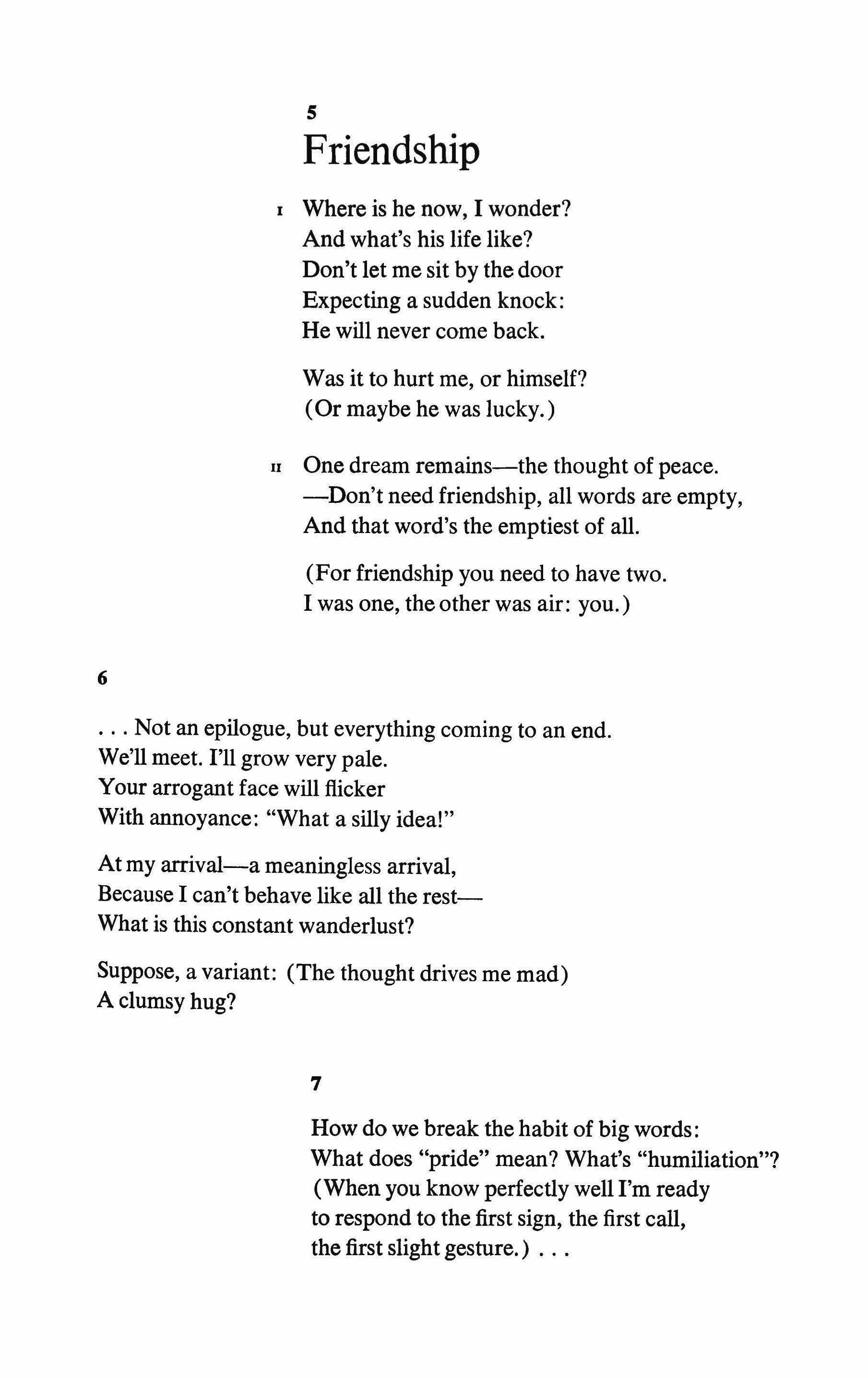 Much of what is written down here is extremely hard to decipber. The sense of many of the concepts eludes us completely, for we simply do not bave tbem. What do such concepts as "friendship" and "trust" mean? Wbat are "friends"? We do not know. For us only tbe notion of "enemies" exists. There is us, and all others are "enemies." The same goes for tbe notion of "trust." With difficulty we have managed to grasp that tbis is the opposite of the concept of "utter distrust," wbicb is the only one we bave. But even if we did know wbat trust is, we can have no trust in you and none is possible. Trust in you is treacbery and a crime against our entire species. Getting food always involves great danger. Because of this we may even approach a man, if tbere sbould be one odd enougb to want this. But that is as far as it can be permitted to go. The Old Man approacbed you because you saved his life. But even those of your own species consider such behavior on your part to be contrary to all your laws. Why sbould sentimentality and affability be expected of us? Why should we forgive the Old Man bis feelings of gratitude and trust, when we don't even know what tbey are?