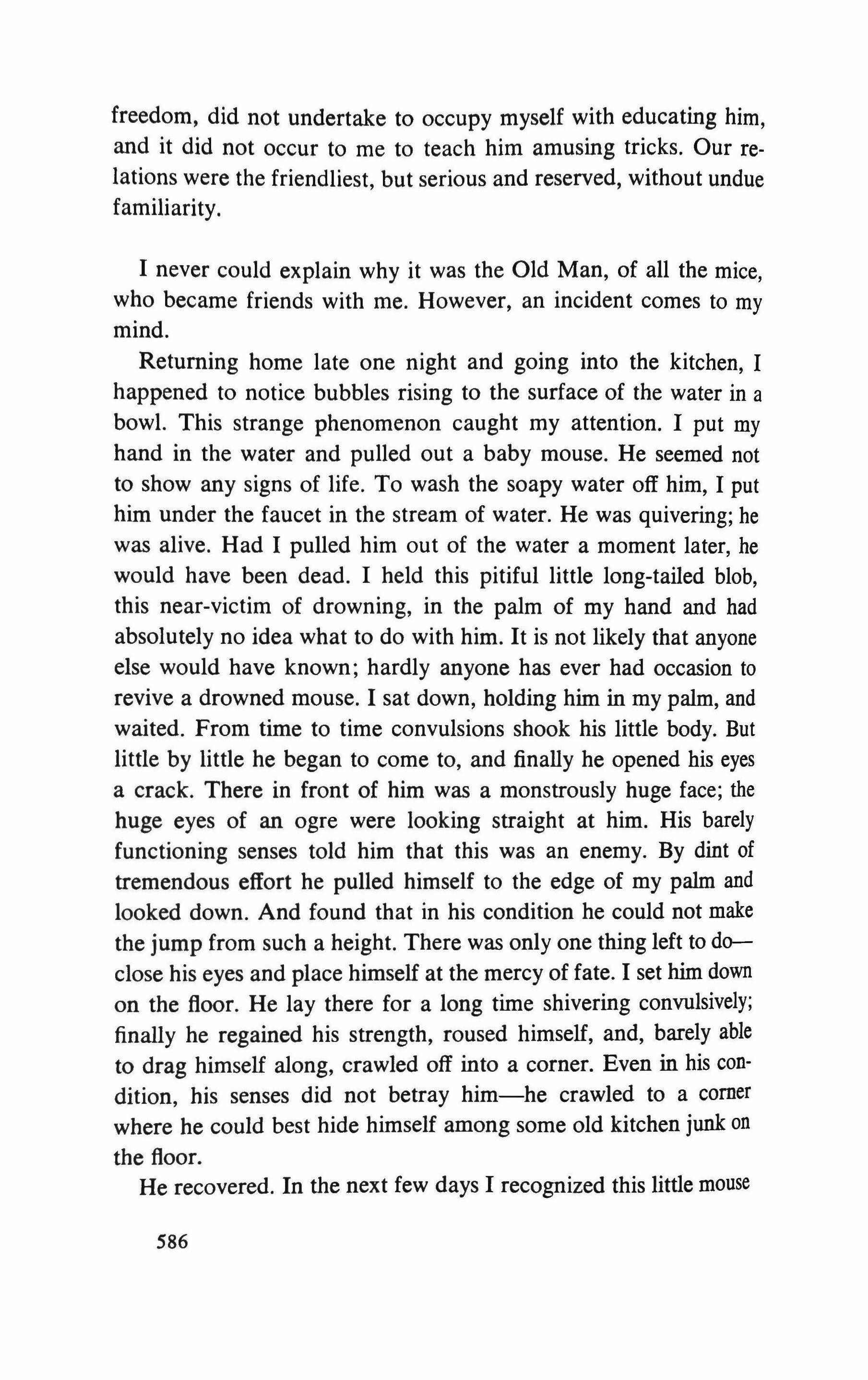 People developed a condescending attitude toward me as a crank who "had to be treated with understanding." And indeed, it had come to the point where I even looked ridiculous to myself. It was becoming vexing and intolerable. I stopped introducing the Old Man to people who visited me, and if anyone began to talk about mice in a condescending tone, I would abruptly break