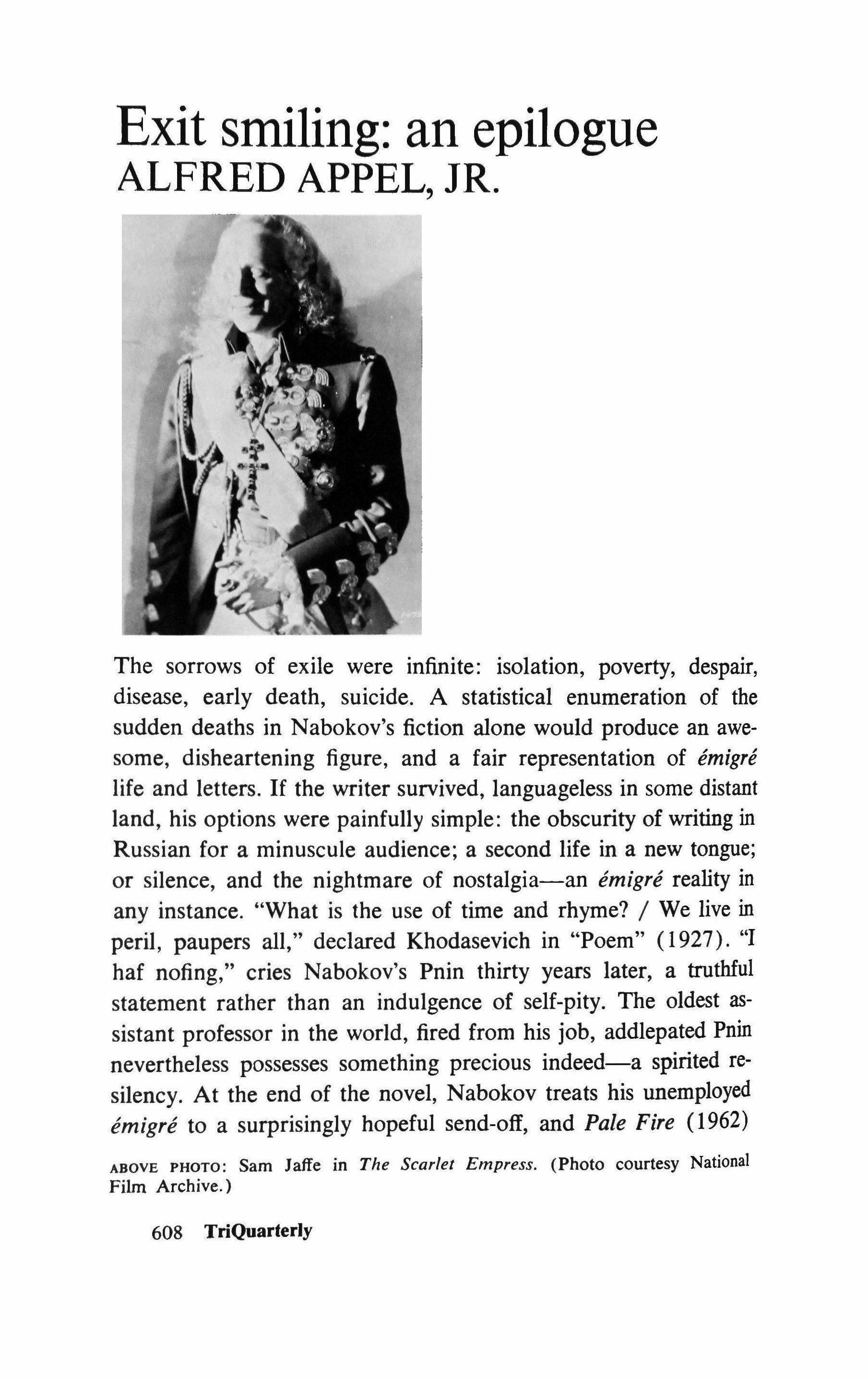 The sorrows of exile were infinite: isolation, poverty, despair, disease, early death, suicide. A statistical enumeration of the sudden deaths in Nabokov's fiction alone would produce an awesome, disheartening figure, and a fair representation of emigre life and letters. If the writer survived, languageless in some distant land, his options were painfully simple: the obscurity of writing in Russian for a minuscule audience; a second life in a new tongue; or silence, and the nightmare of nostalgia-an emigre reality in any instance. "What is the use of time and rhyme? / We live in peril, paupers all," declared Khodasevich in "Poem" (1927). "I haf nofing," cries Nabokov's Pnin thirty years later, a truthful statement rather than an indulgence of self-pity. The oldest assistant professor in the world, fired from his job, addlepated Pnin nevertheless possesses something precious indeed-a spirited resilency. At the end of the novel, Nabokov treats his unemployed emigre to a surprisingly hopeful send-off, and Pale Fire (1962)