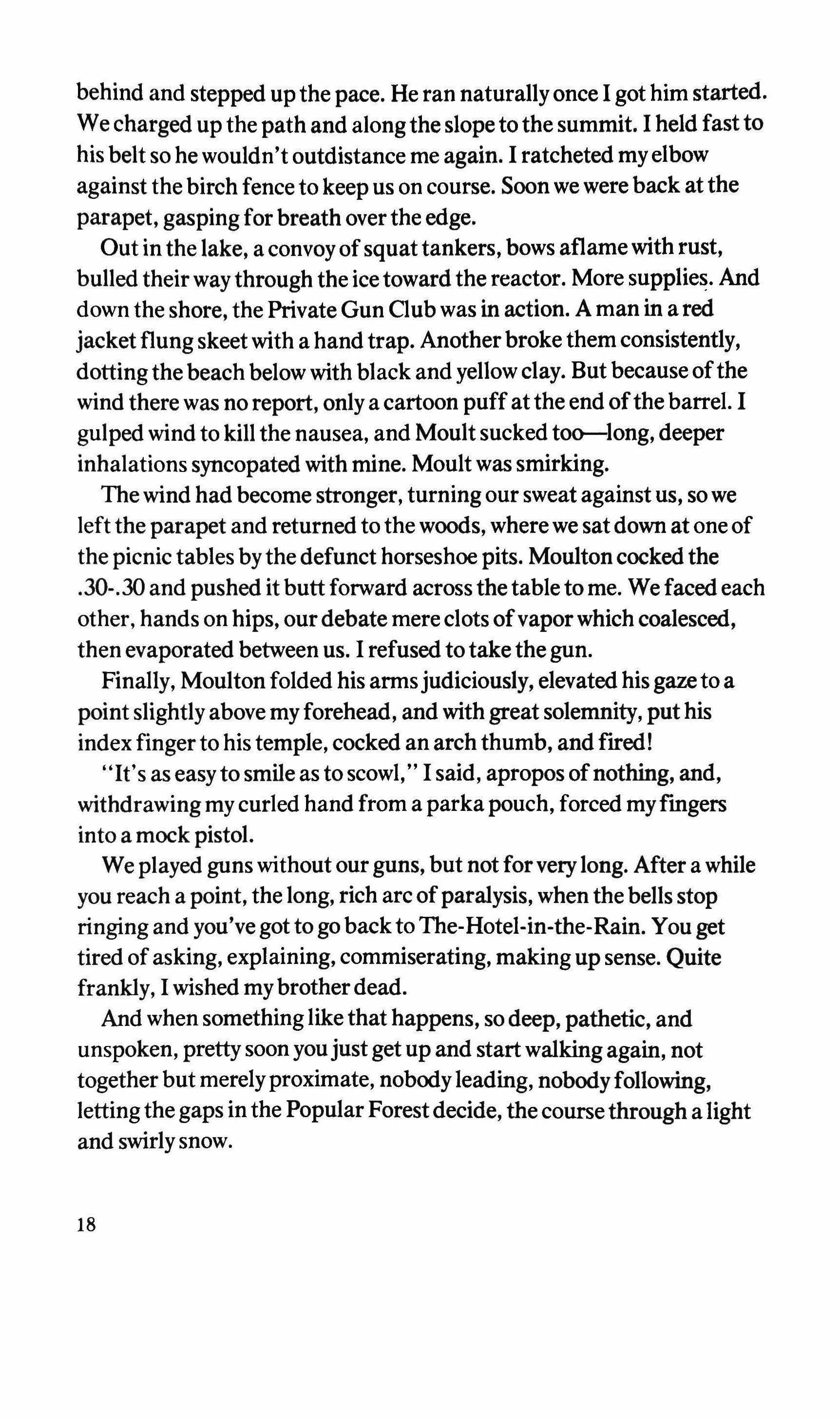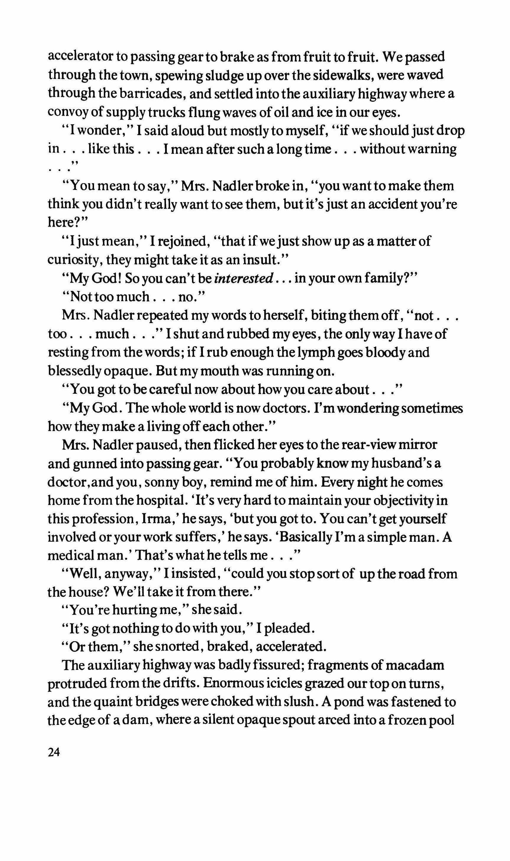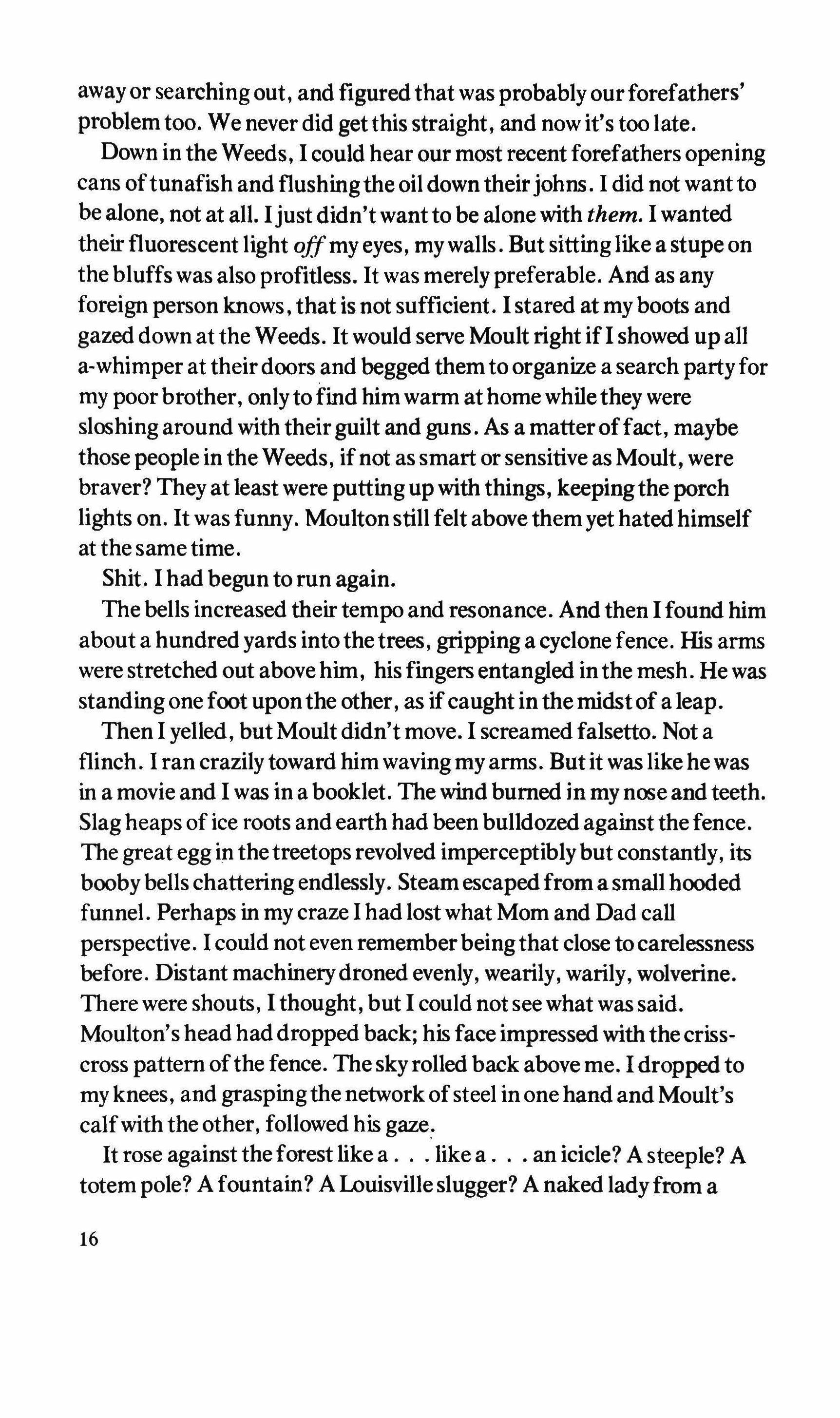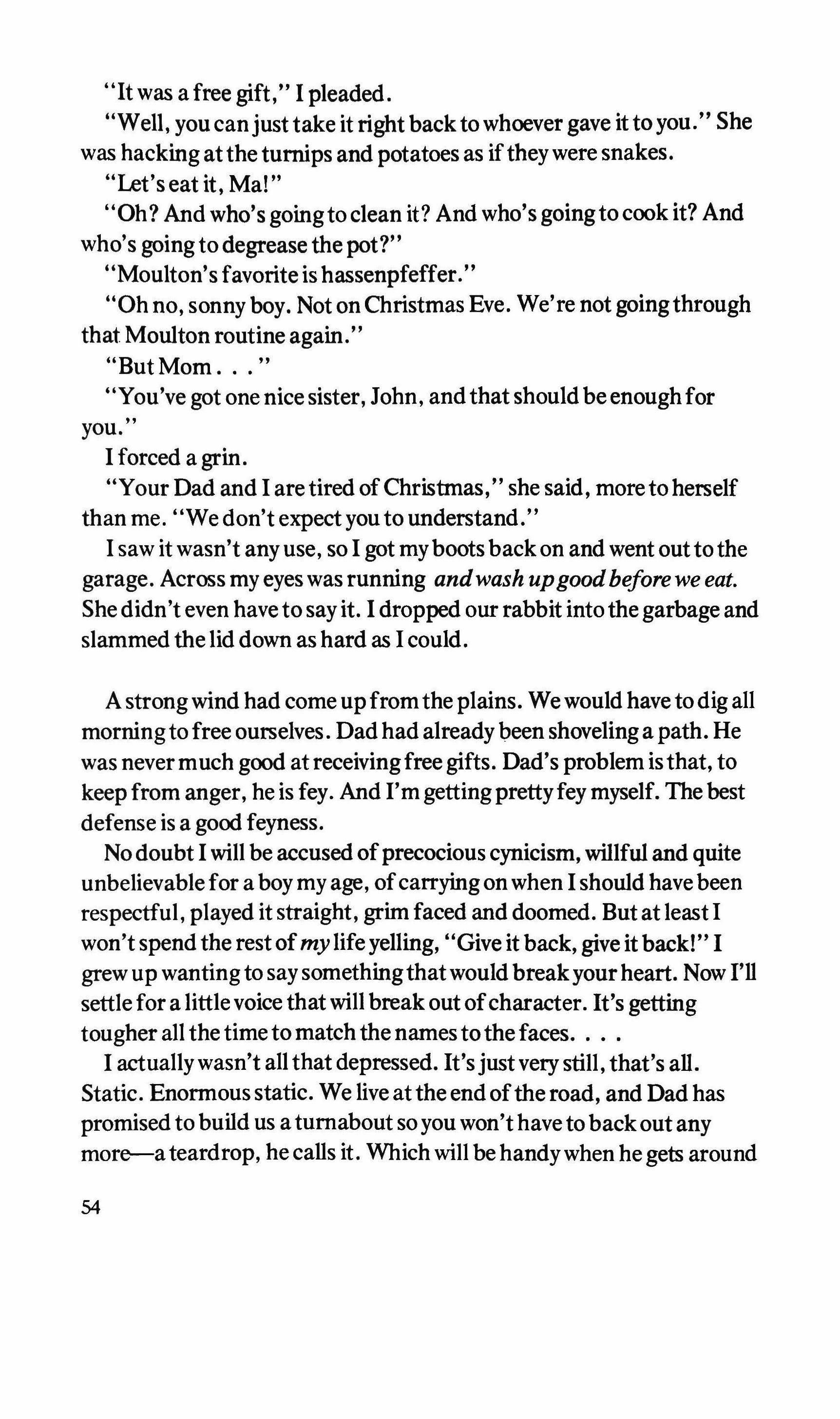 Moulton arched a snowball onto a front yard. I remember when he thought. not so long ago at all, that he was betterthan they were. I asked him about this. but he didn't answer. I am beginning to suspect that Moulton thinks too much about his life to think properly at all. Maybe that is his problem. The hardest thingto understand about this world is that nothingis true to the extent that it is widely understood. And I am developing a theory about people like Moulton. It's that everybody normal is born with this ribbon ofwords in their heads like I have, but theystop seeing it after a whilebecause theyworry aboutthemselves too much. Theystop seeingwhat they'relisteningto; sending or receiving. Maybe it's true that peopleget overwhelmed by their "feelings," but all the people I know have been worn out by"long-termplanning," as the President calls it. And I wouldn't have minded Moulton giving up so much; it was the self-important way in whichhe was doingitthat bothered me. The truth is, mister, you have to beloved or hated more than ordinarily to pay attention to that telltale tape. And I havebeen loved a-plenty. I suppose, eventually, it soon dissolves intothe redwebs ofone's eyes, and comes out, ifnot as tears, then as thatyellowstuff in the comer. Orsomewhere else. I don't know.