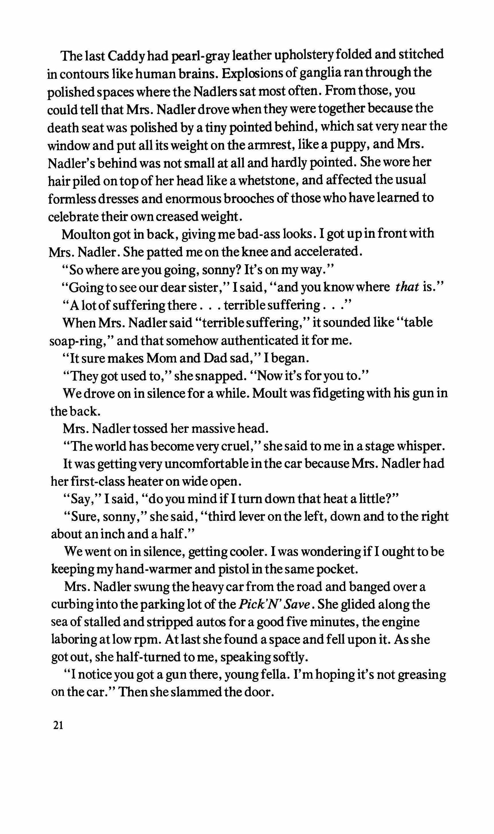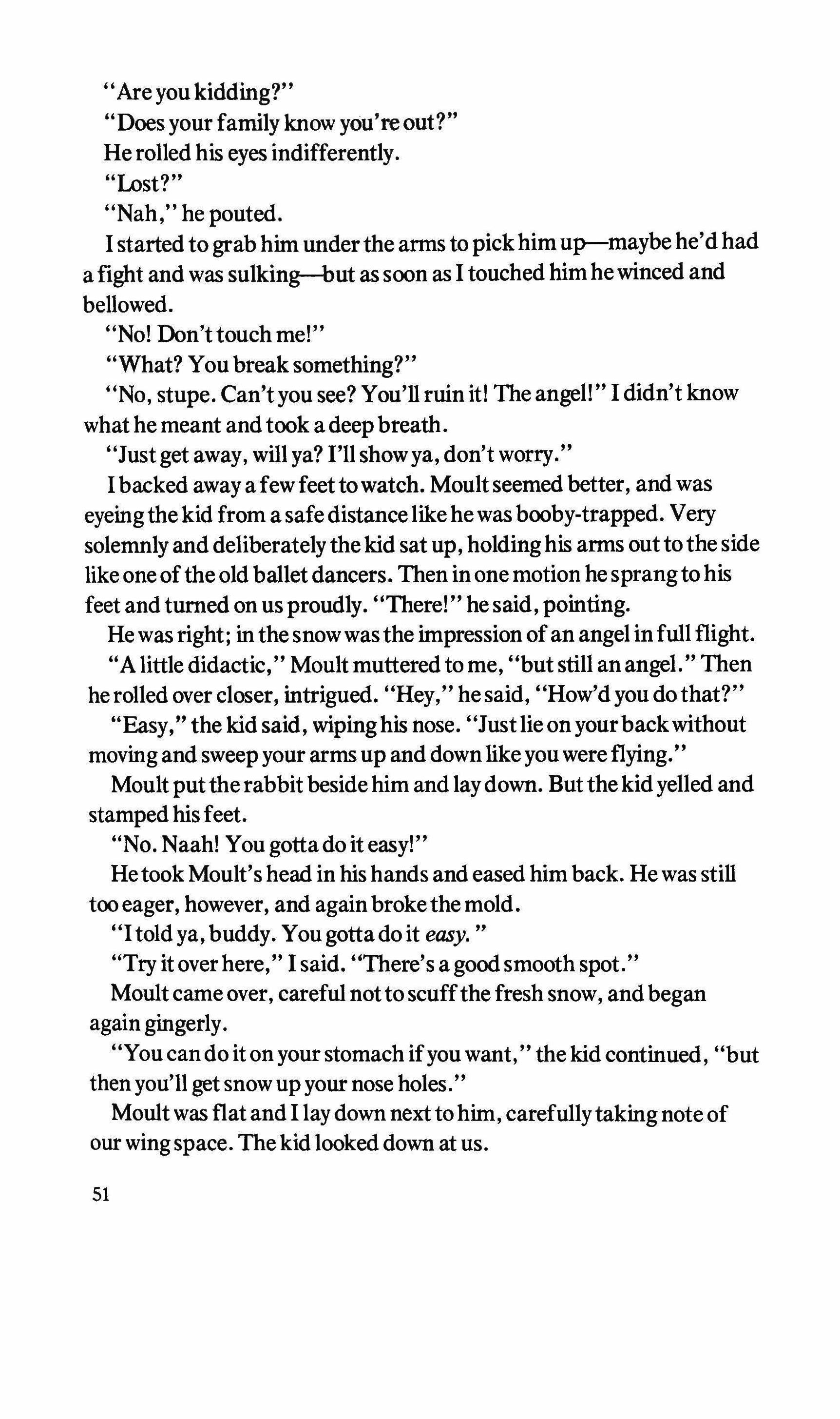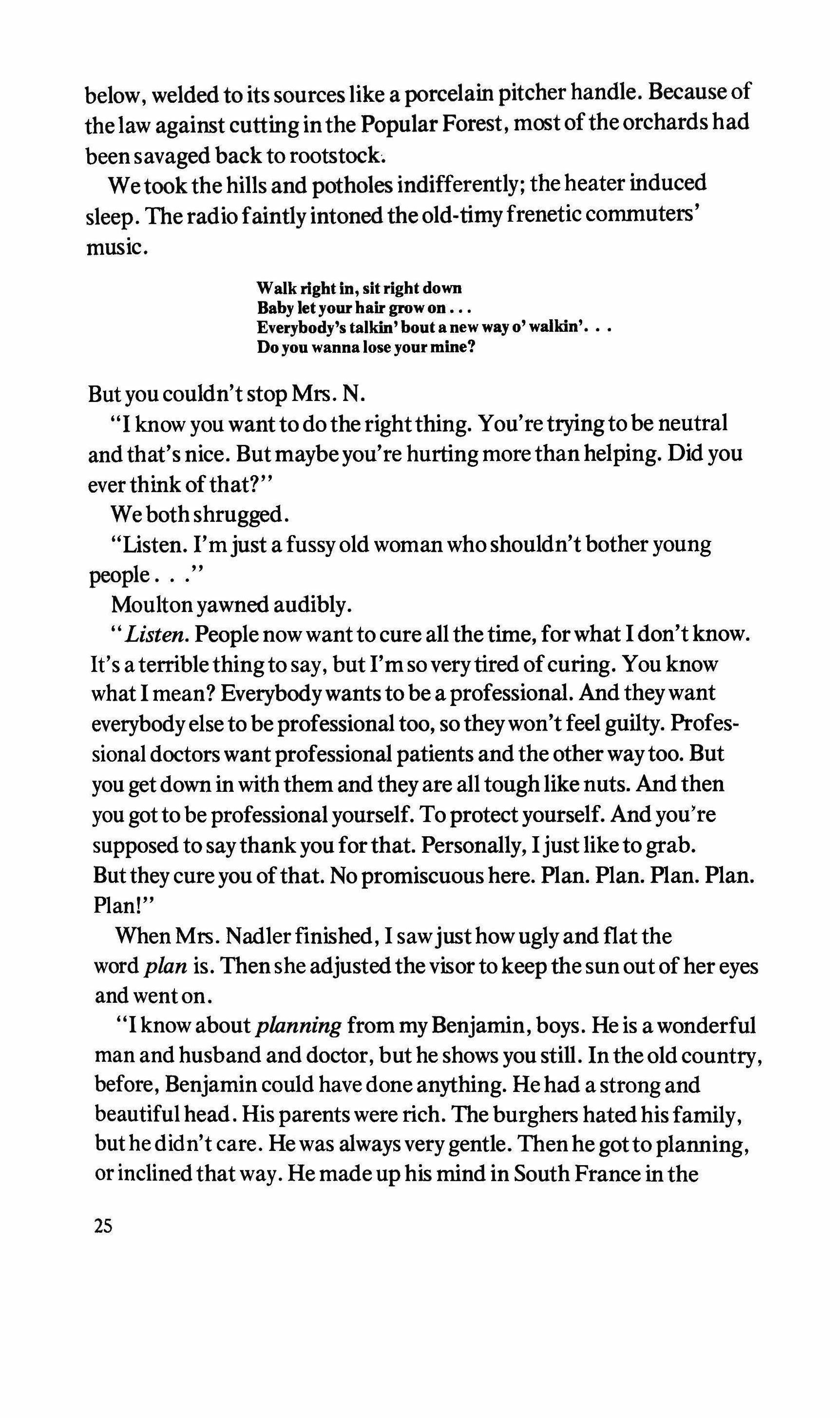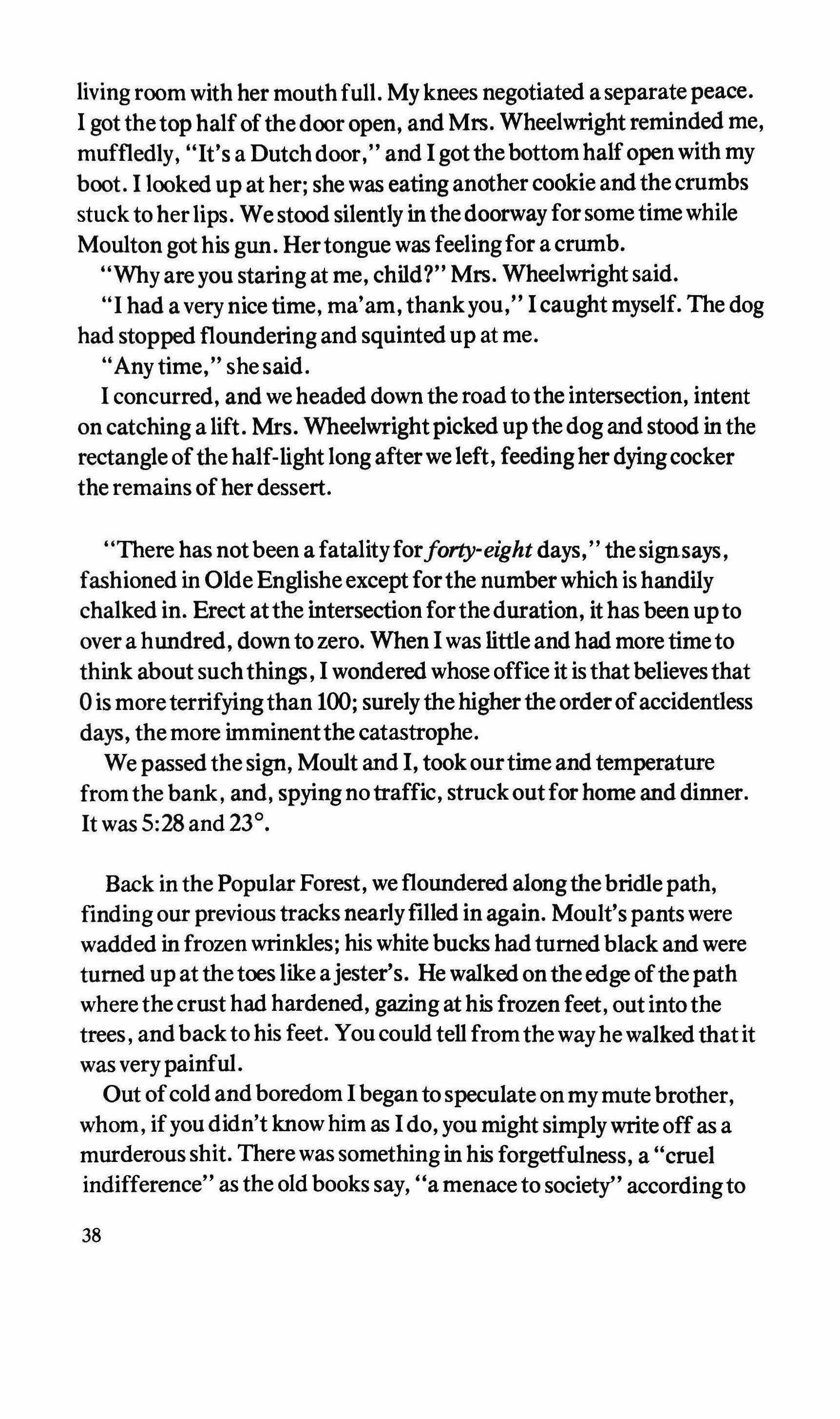 Moulton arched a snowball onto a front yard. I remember when he thought. not so long ago at all, that he was betterthan they were. I asked him about this. but he didn't answer. I am beginning to suspect that Moulton thinks too much about his life to think properly at all. Maybe that is his problem. The hardest thingto understand about this world is that nothingis true to the extent that it is widely understood. And I am developing a theory about people like Moulton. It's that everybody normal is born with this ribbon ofwords in their heads like I have, but theystop seeing it after a whilebecause theyworry aboutthemselves too much. Theystop seeingwhat they'relisteningto; sending or receiving. Maybe it's true that peopleget overwhelmed by their "feelings," but all the people I know have been worn out by"long-termplanning," as the President calls it. And I wouldn't have minded Moulton giving up so much; it was the self-important way in whichhe was doingitthat bothered me. The truth is, mister, you have to beloved or hated more than ordinarily to pay attention to that telltale tape. And I havebeen loved a-plenty. I suppose, eventually, it soon dissolves intothe redwebs ofone's eyes, and comes out, ifnot as tears, then as thatyellowstuff in the comer. Orsomewhere else. I don't know.