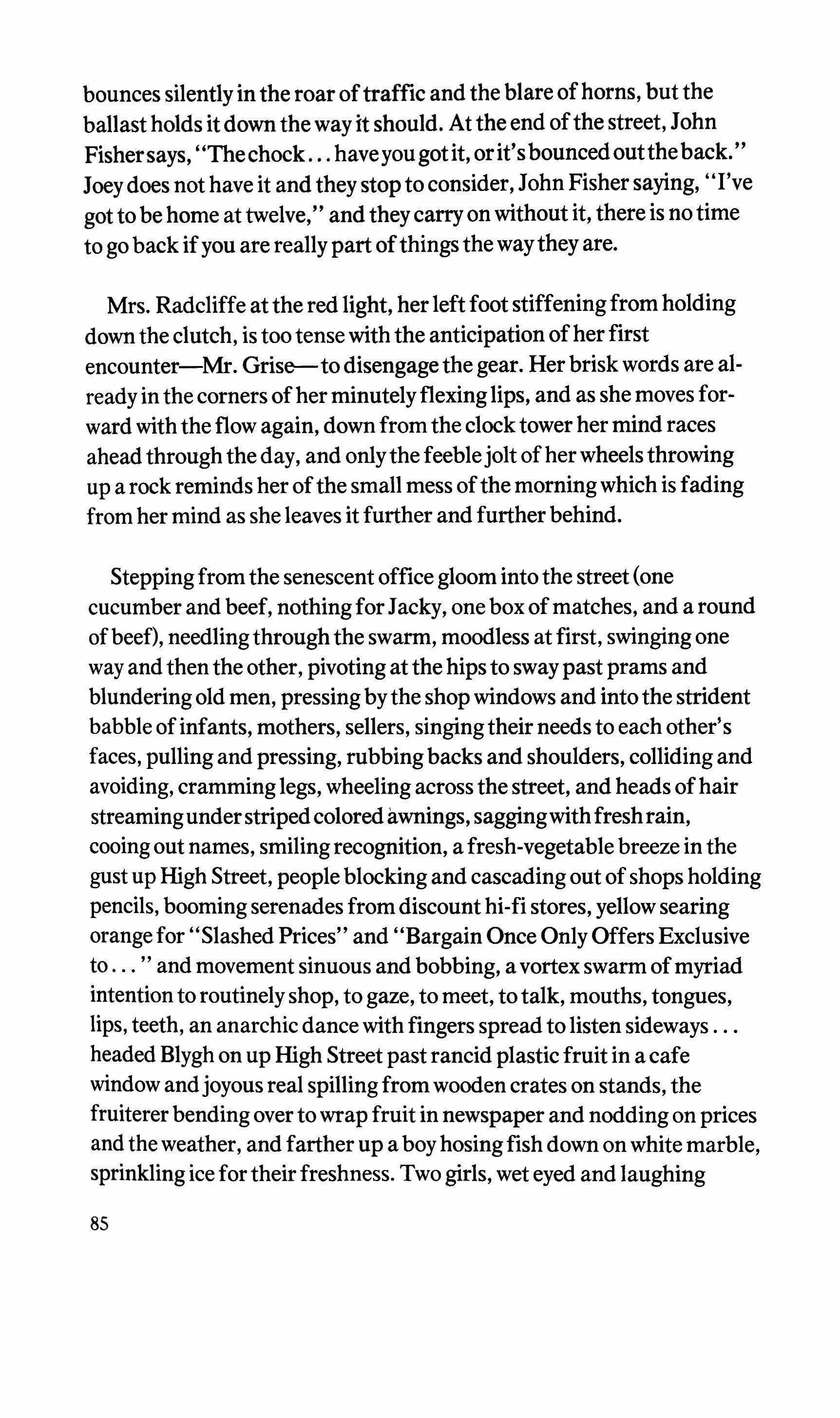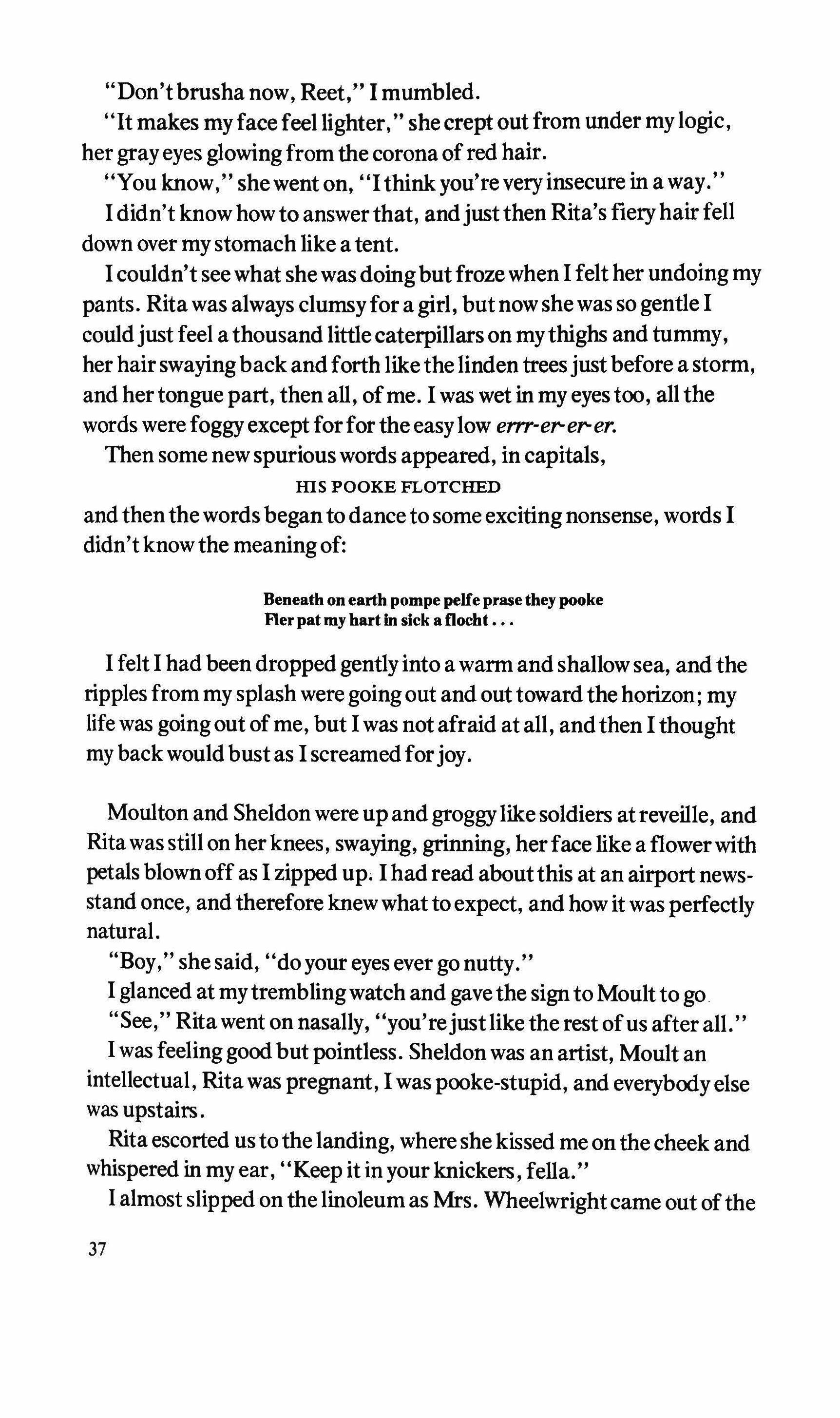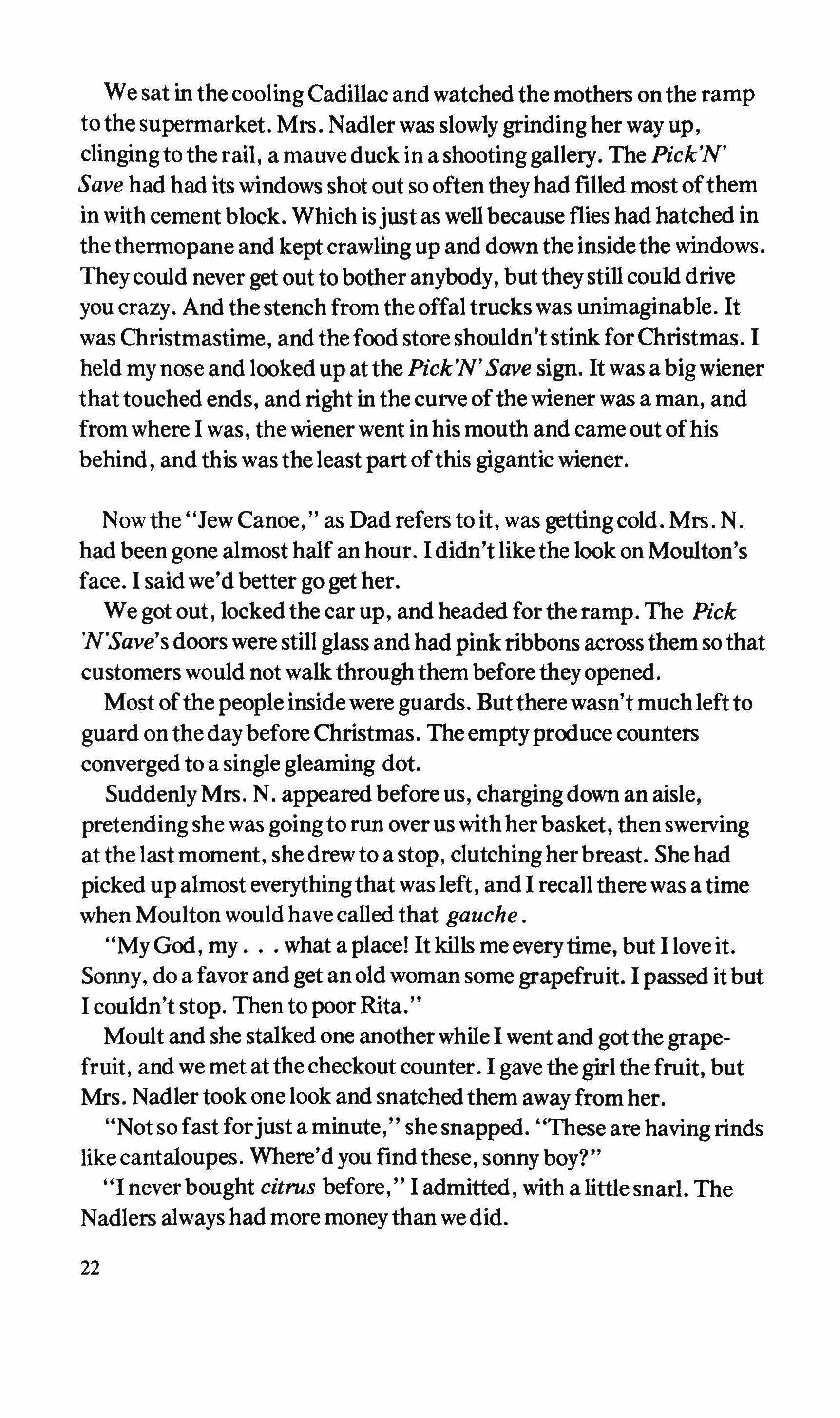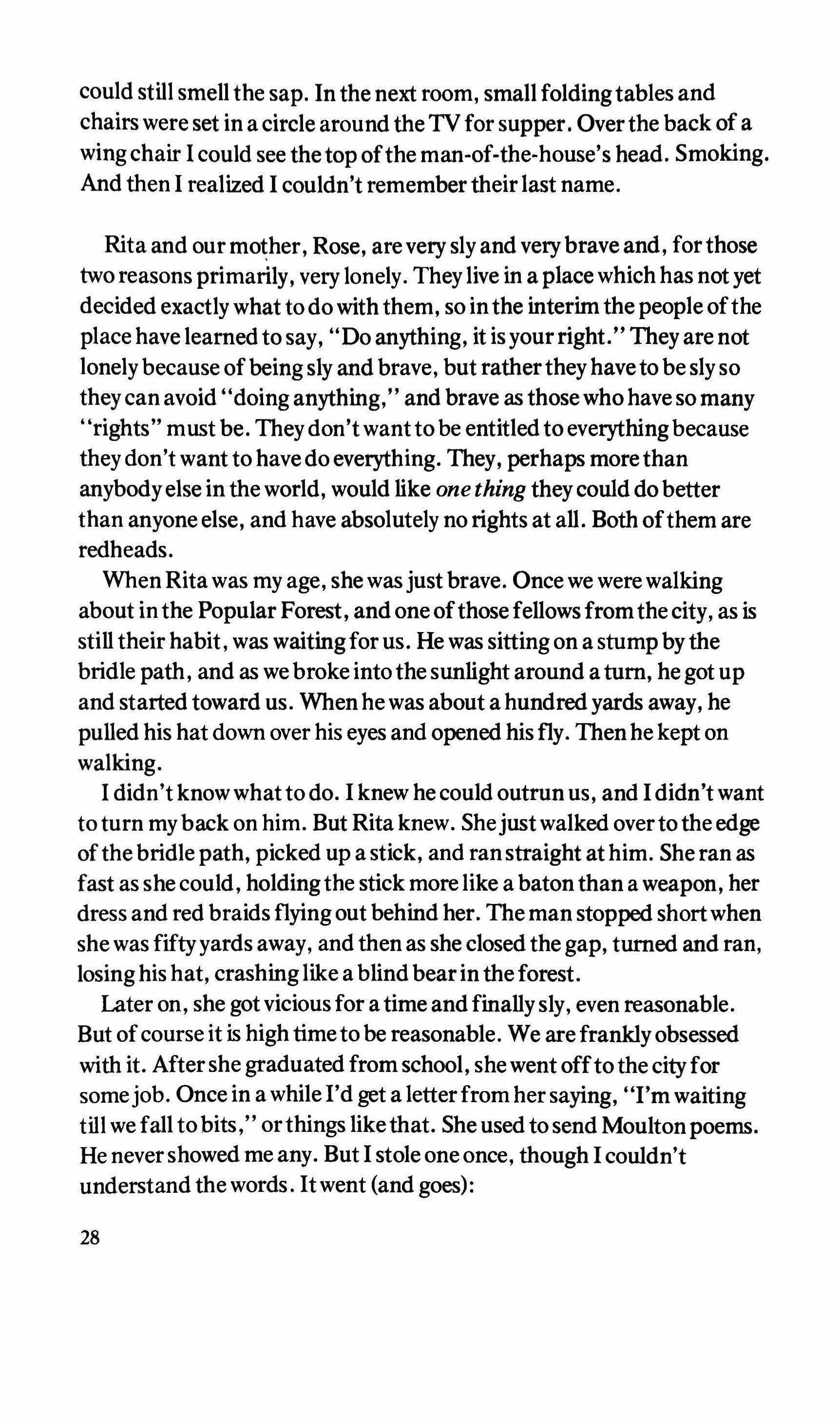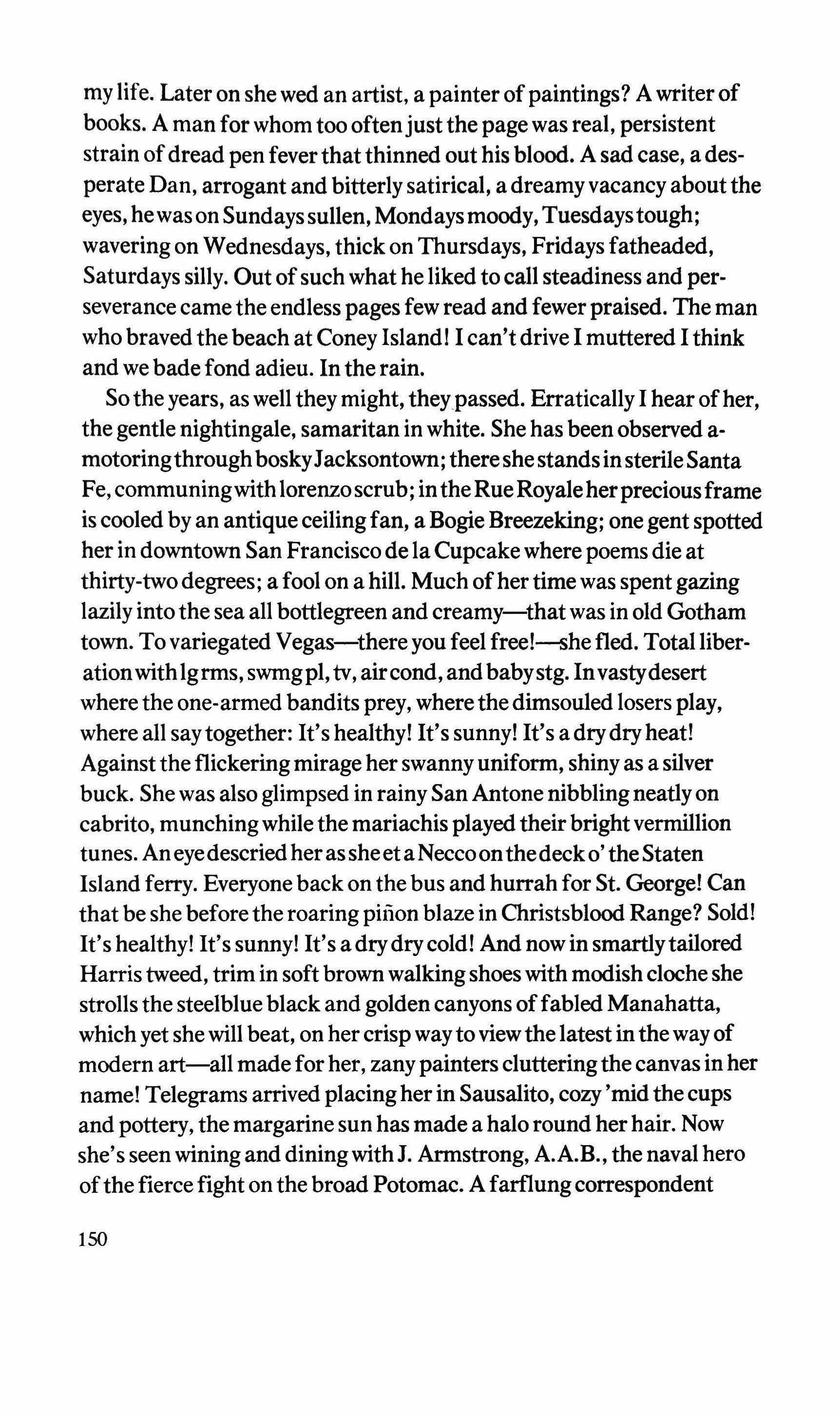 Moulton arched a snowball onto a front yard. I remember when he thought. not so long ago at all, that he was betterthan they were. I asked him about this. but he didn't answer. I am beginning to suspect that Moulton thinks too much about his life to think properly at all. Maybe that is his problem. The hardest thingto understand about this world is that nothingis true to the extent that it is widely understood. And I am developing a theory about people like Moulton. It's that everybody normal is born with this ribbon ofwords in their heads like I have, but theystop seeing it after a whilebecause theyworry aboutthemselves too much. Theystop seeingwhat they'relisteningto; sending or receiving. Maybe it's true that peopleget overwhelmed by their "feelings," but all the people I know have been worn out by"long-termplanning," as the President calls it. And I wouldn't have minded Moulton giving up so much; it was the self-important way in whichhe was doingitthat bothered me. The truth is, mister, you have to beloved or hated more than ordinarily to pay attention to that telltale tape. And I havebeen loved a-plenty. I suppose, eventually, it soon dissolves intothe redwebs ofone's eyes, and comes out, ifnot as tears, then as thatyellowstuff in the comer. Orsomewhere else. I don't know.