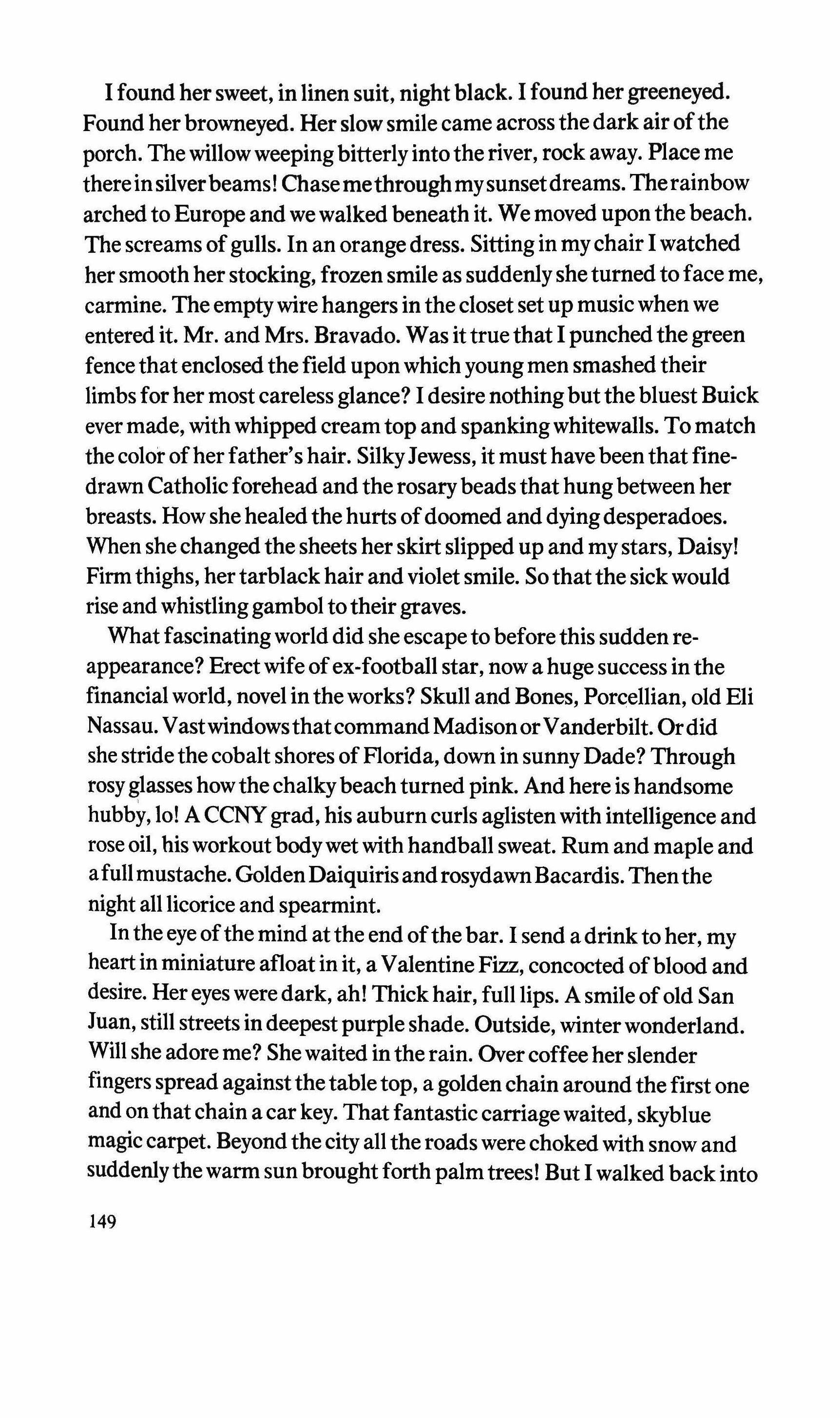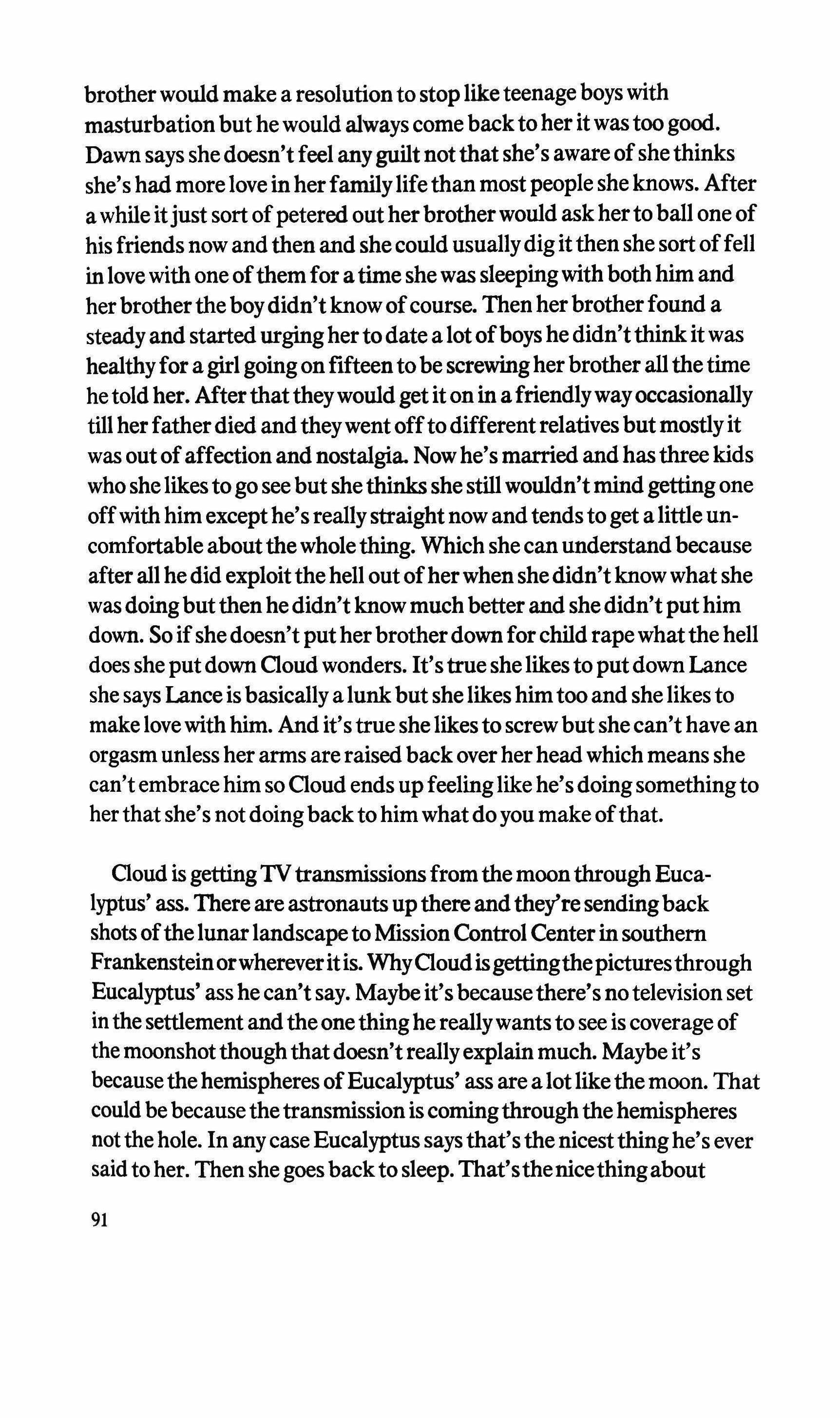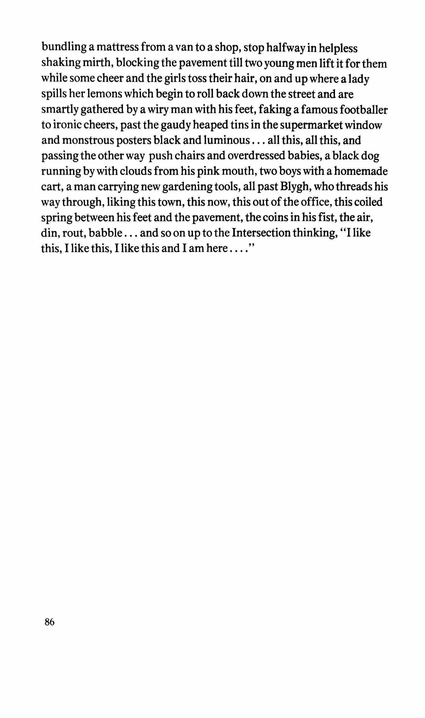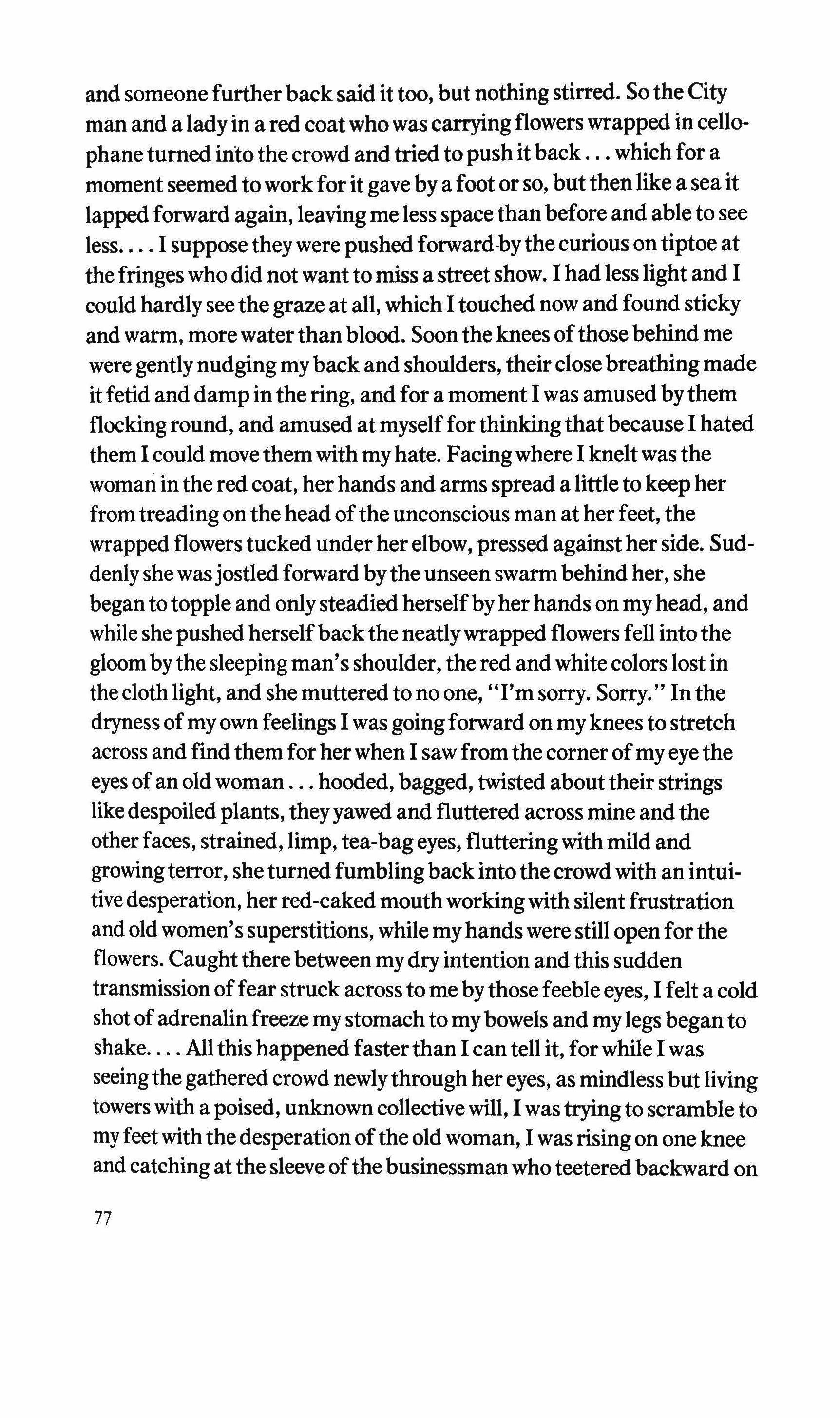Moulton arched a snowball onto a front yard. I remember when he thought. not so long ago at all, that he was betterthan they were. I asked him about this. but he didn't answer. I am beginning to suspect that Moulton thinks too much about his life to think properly at all. Maybe that is his problem. The hardest thingto understand about this world is that nothingis true to the extent that it is widely understood. And I am developing a theory about people like Moulton. It's that everybody normal is born with this ribbon ofwords in their heads like I have, but theystop seeing it after a whilebecause theyworry aboutthemselves too much. Theystop seeingwhat they'relisteningto; sending or receiving. Maybe it's true that peopleget overwhelmed by their "feelings," but all the people I know have been worn out by"long-termplanning," as the President calls it. And I wouldn't have minded Moulton giving up so much; it was the self-important way in whichhe was doingitthat bothered me. The truth is, mister, you have to beloved or hated more than ordinarily to pay attention to that telltale tape. And I havebeen loved a-plenty. I suppose, eventually, it soon dissolves intothe redwebs ofone's eyes, and comes out, ifnot as tears, then as thatyellowstuff in the comer. Orsomewhere else. I don't know.
