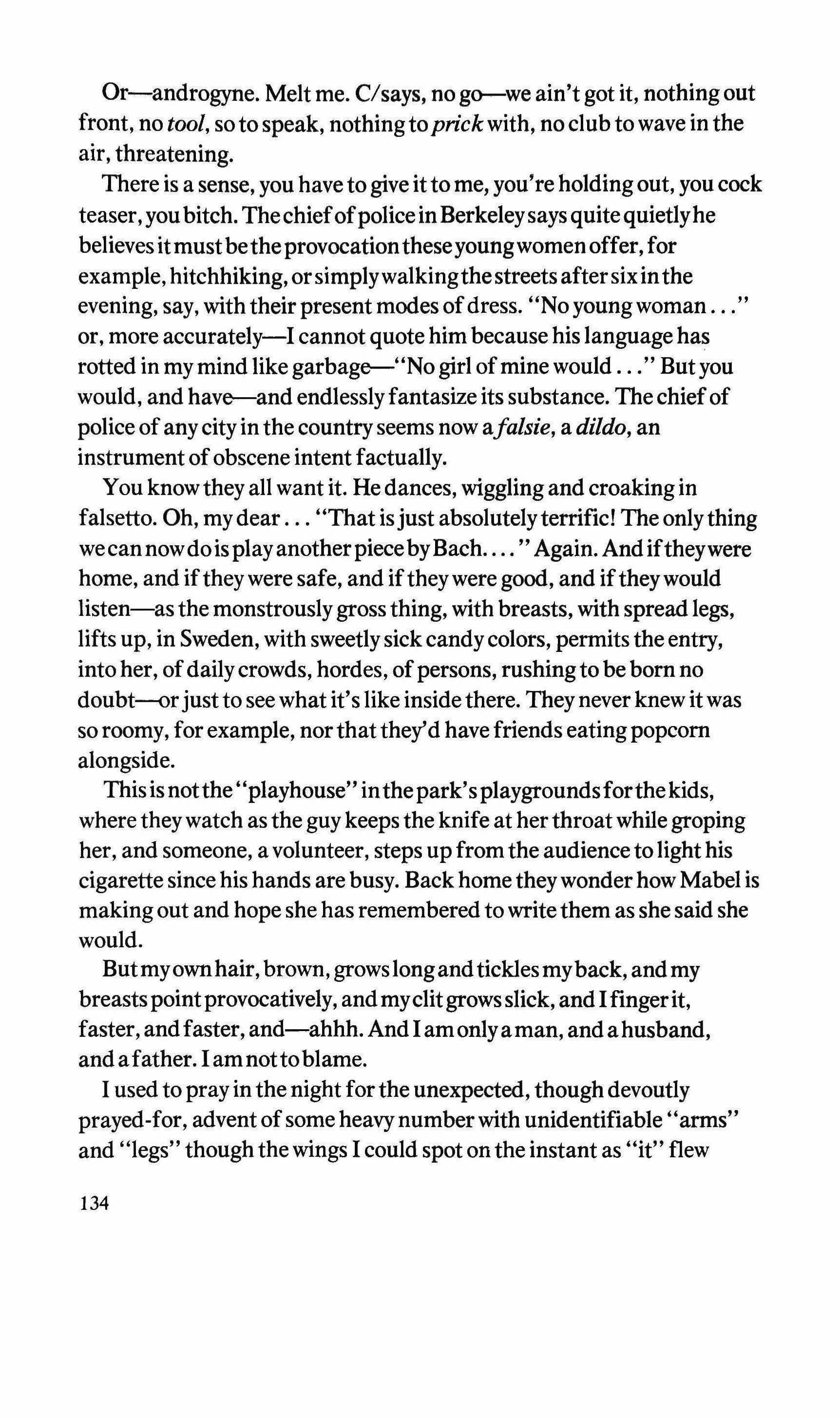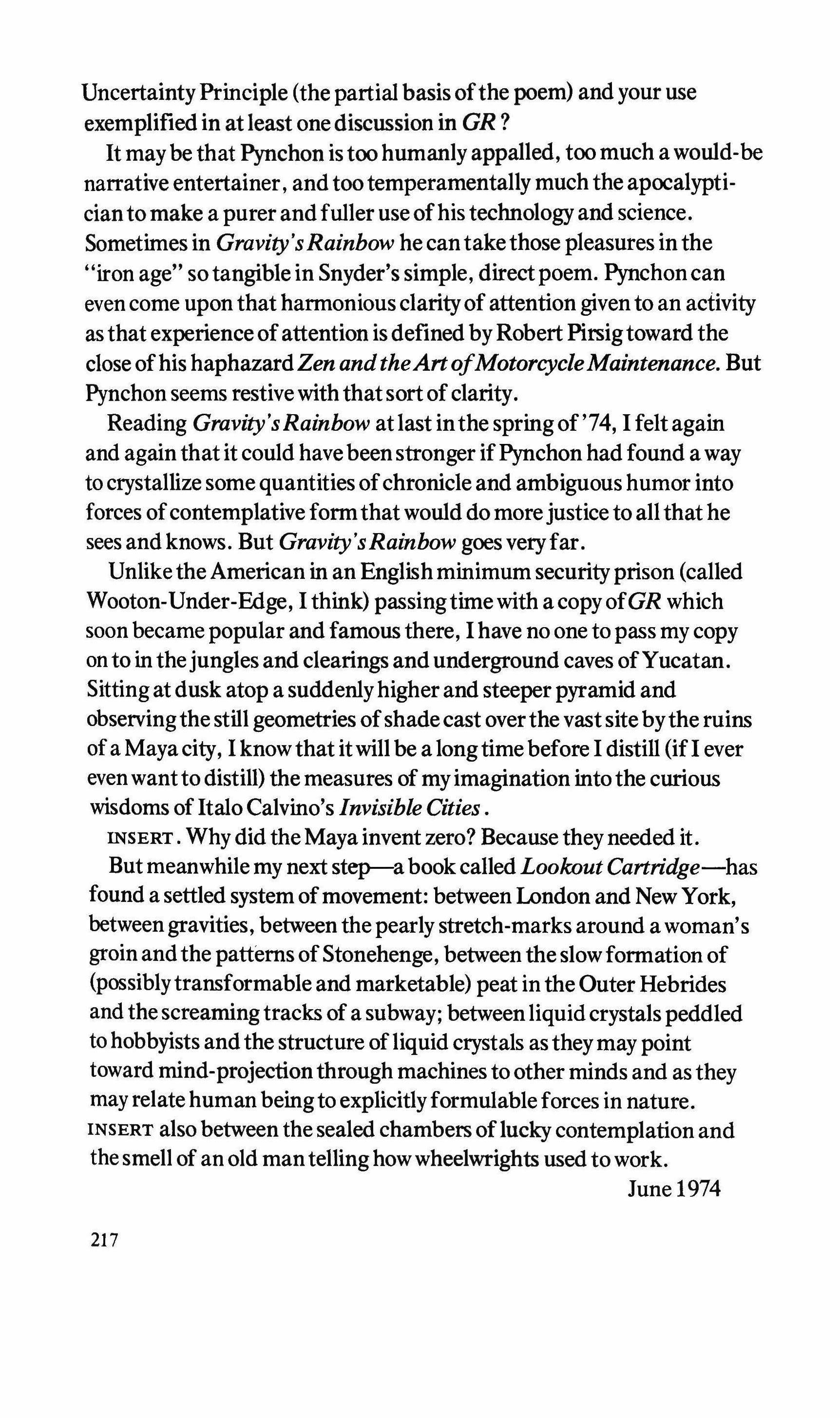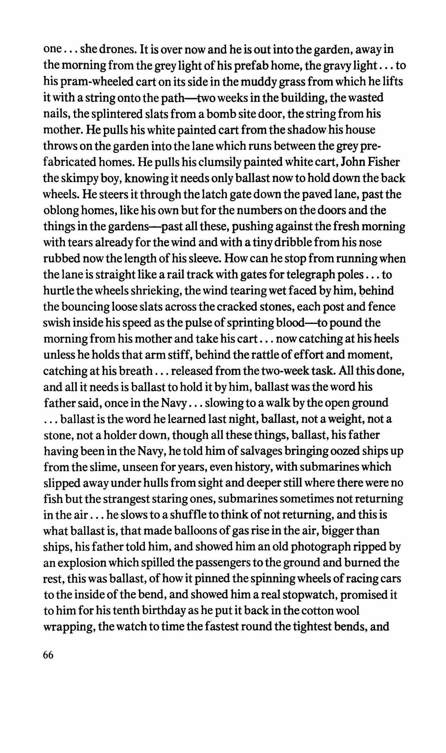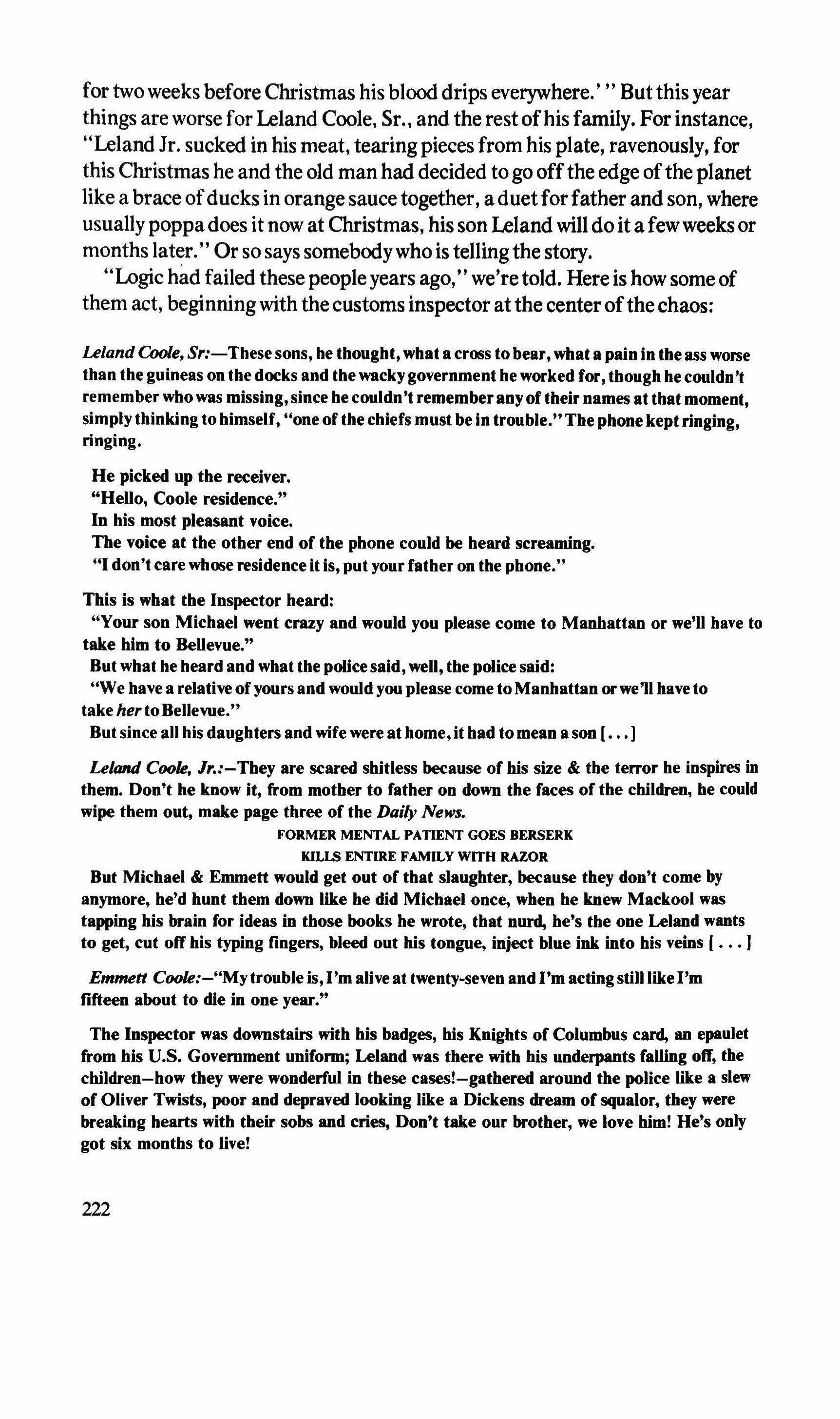 Moulton arched a snowball onto a front yard. I remember when he thought. not so long ago at all, that he was betterthan they were. I asked him about this. but he didn't answer. I am beginning to suspect that Moulton thinks too much about his life to think properly at all. Maybe that is his problem. The hardest thingto understand about this world is that nothingis true to the extent that it is widely understood. And I am developing a theory about people like Moulton. It's that everybody normal is born with this ribbon ofwords in their heads like I have, but theystop seeing it after a whilebecause theyworry aboutthemselves too much. Theystop seeingwhat they'relisteningto; sending or receiving. Maybe it's true that peopleget overwhelmed by their "feelings," but all the people I know have been worn out by"long-termplanning," as the President calls it. And I wouldn't have minded Moulton giving up so much; it was the self-important way in whichhe was doingitthat bothered me. The truth is, mister, you have to beloved or hated more than ordinarily to pay attention to that telltale tape. And I havebeen loved a-plenty. I suppose, eventually, it soon dissolves intothe redwebs ofone's eyes, and comes out, ifnot as tears, then as thatyellowstuff in the comer. Orsomewhere else. I don't know.