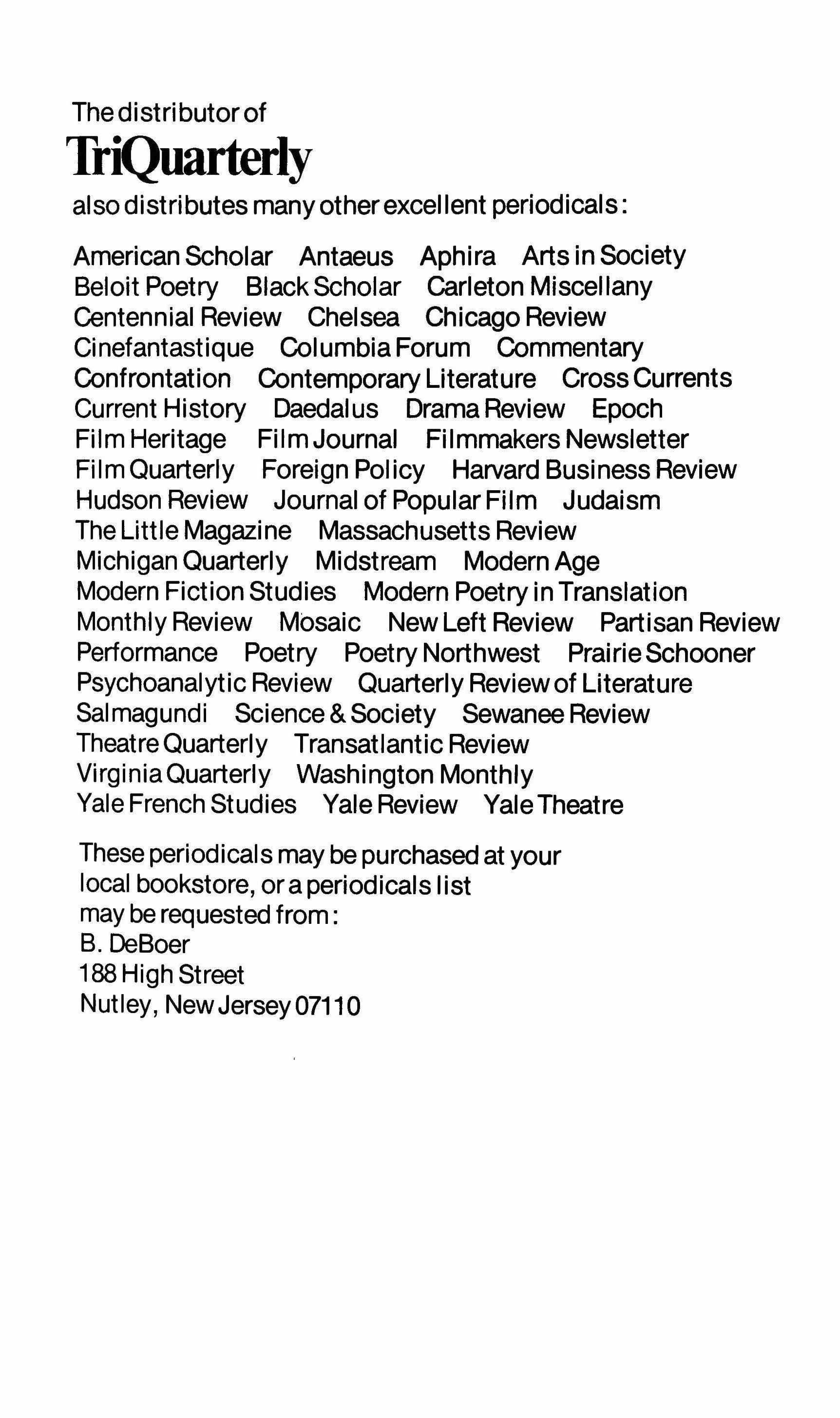 REPRINTS OF BACK ISSUES OF TriQuarterly ARE NOW AVAILABLE IN FULL FORMAT FROM KRAUS REPRINT COMPANY, ROUTE 100, MILLWOOD, NEW YORK 10546, AND IN MICROFILM FROM UNIVERSITY MICROFILMS, A XEROX COMPANY, ANN ARBOR, MICHIGAN 48106.