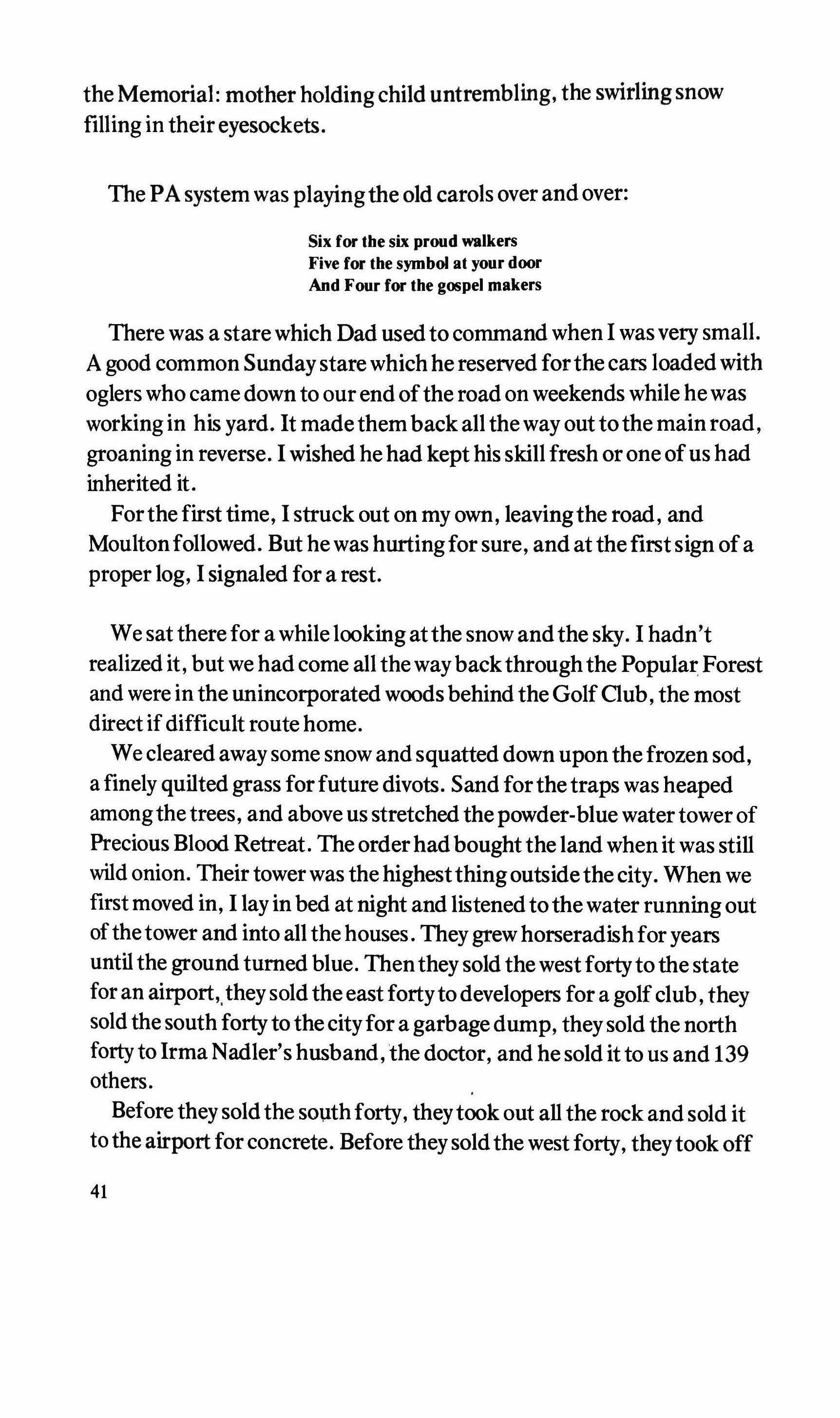 Out in theback yard, the wind had frozen the snow solid, and we walked upon itwithout sinking. It was so cold and clear thatyou noticed the sun onlywhen you lookedstraight into it. Mere light. The creek was inseparable from theland. That wind had fossiled everything.
