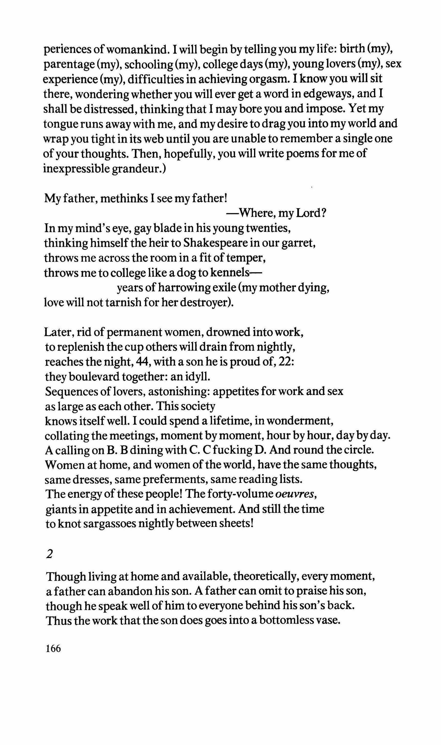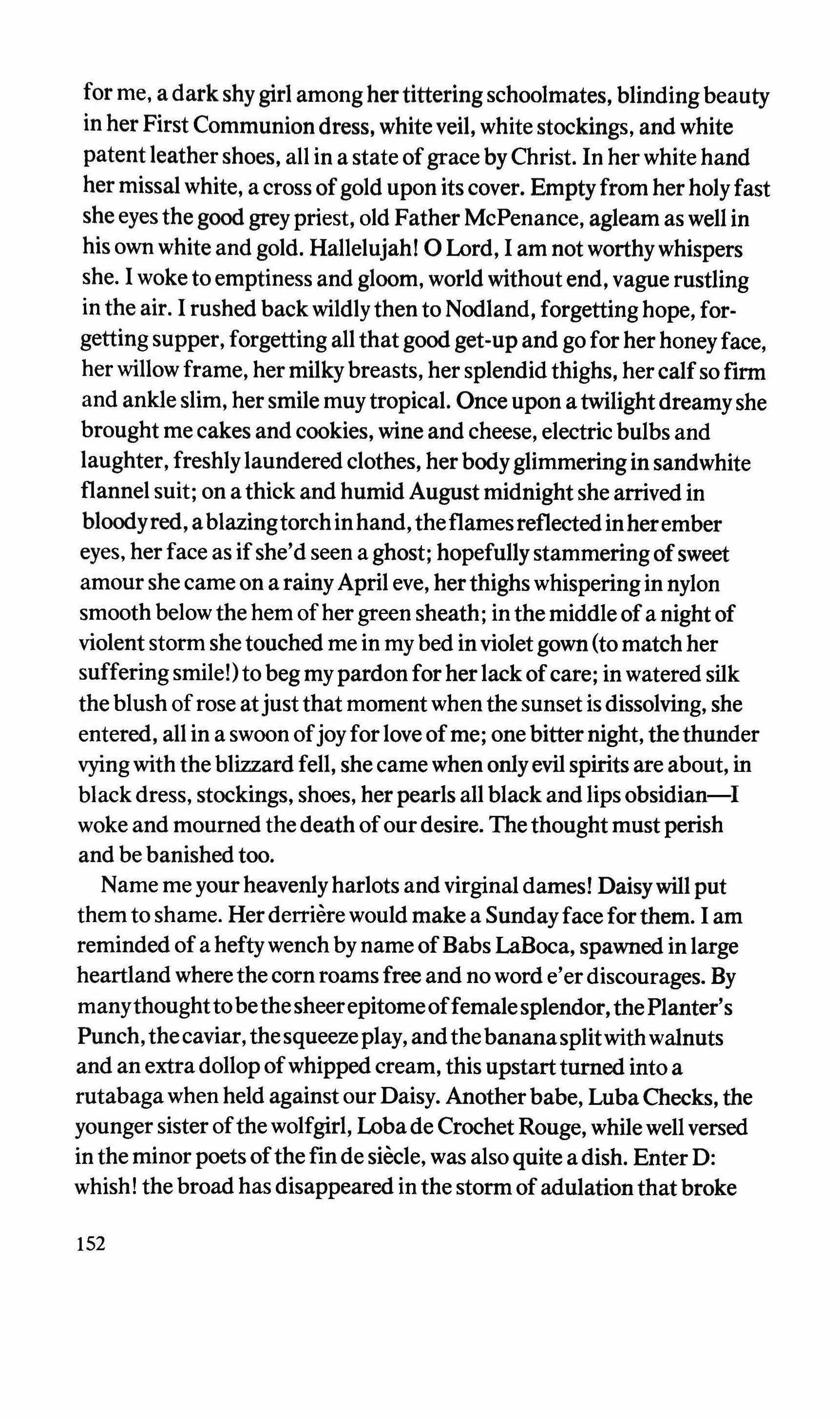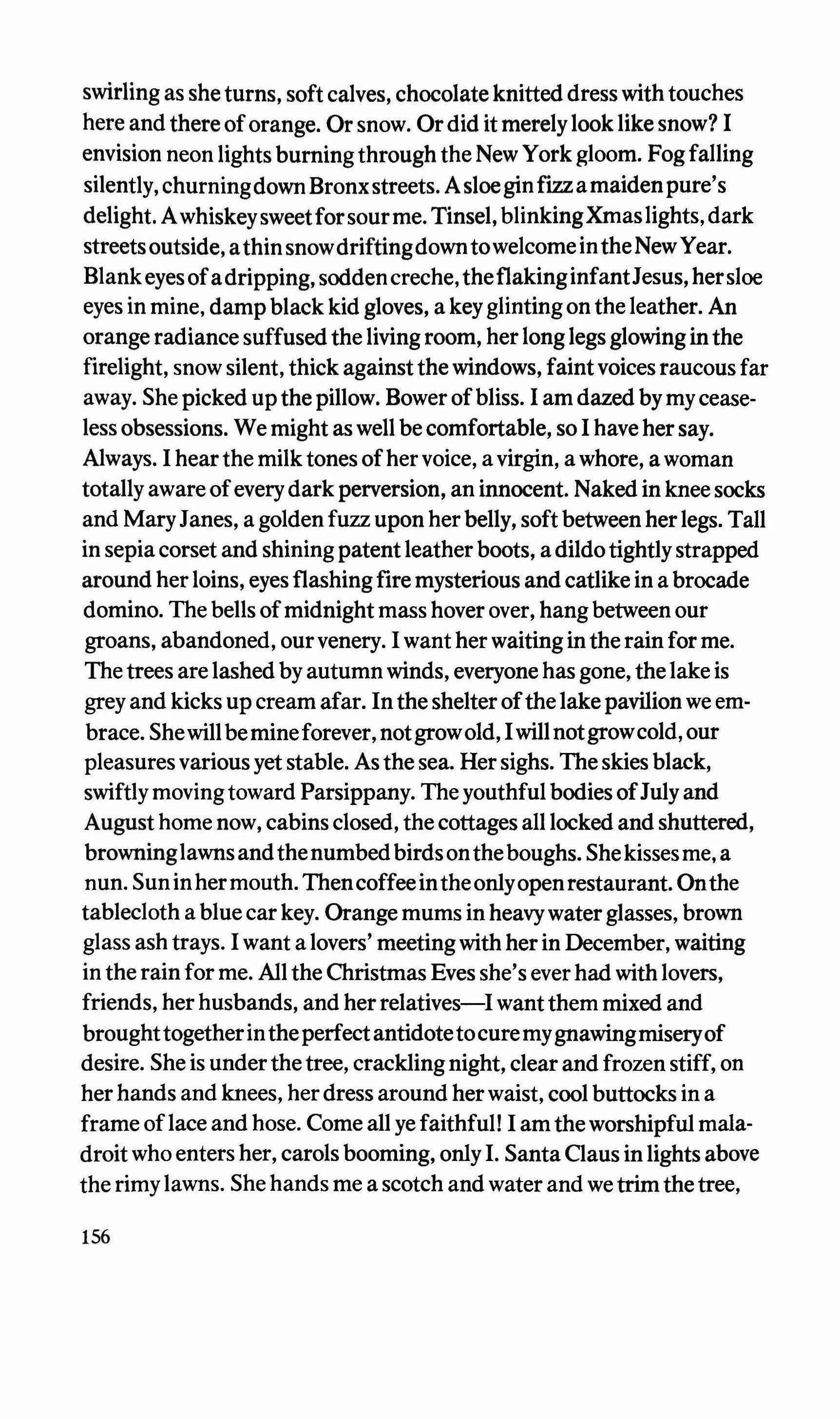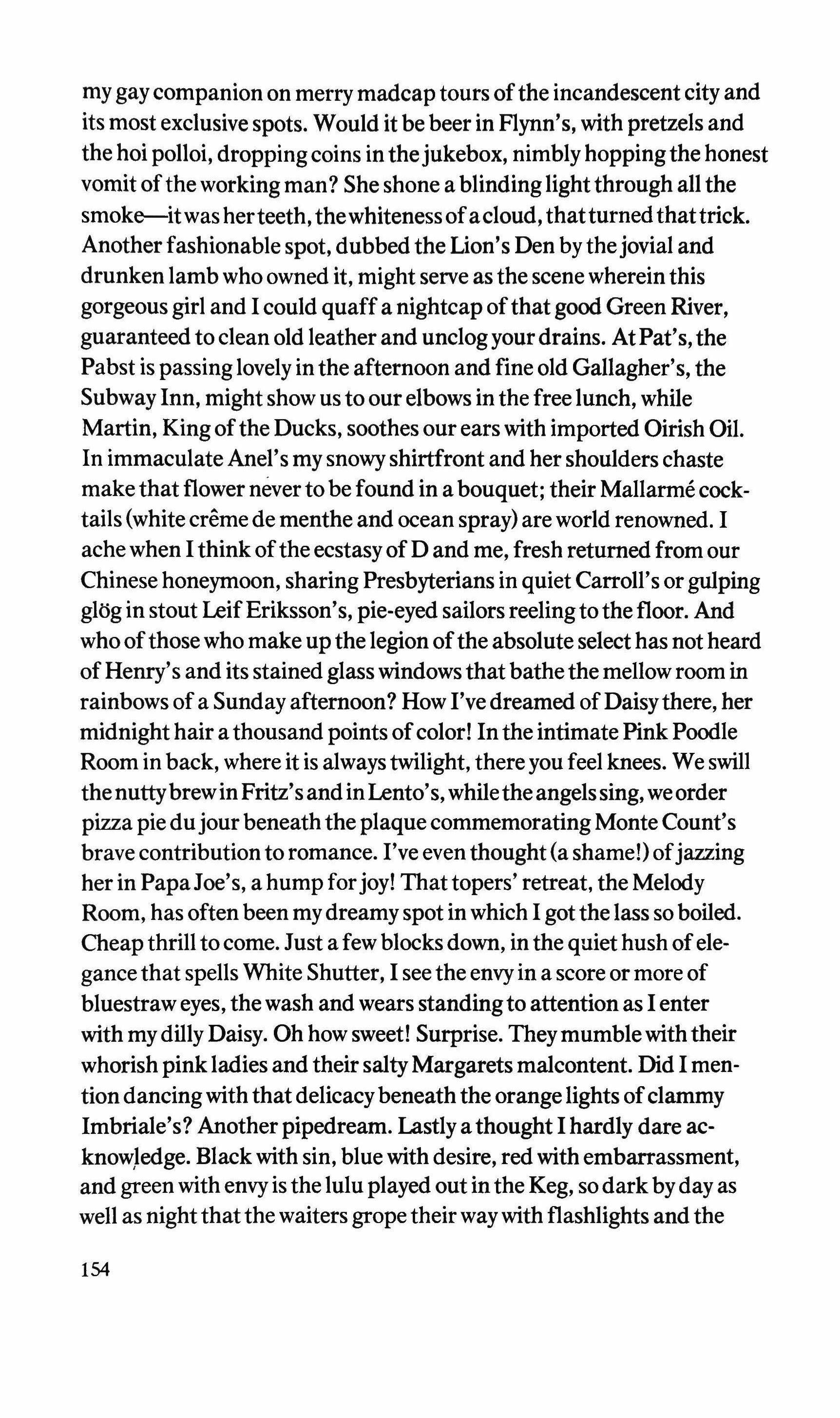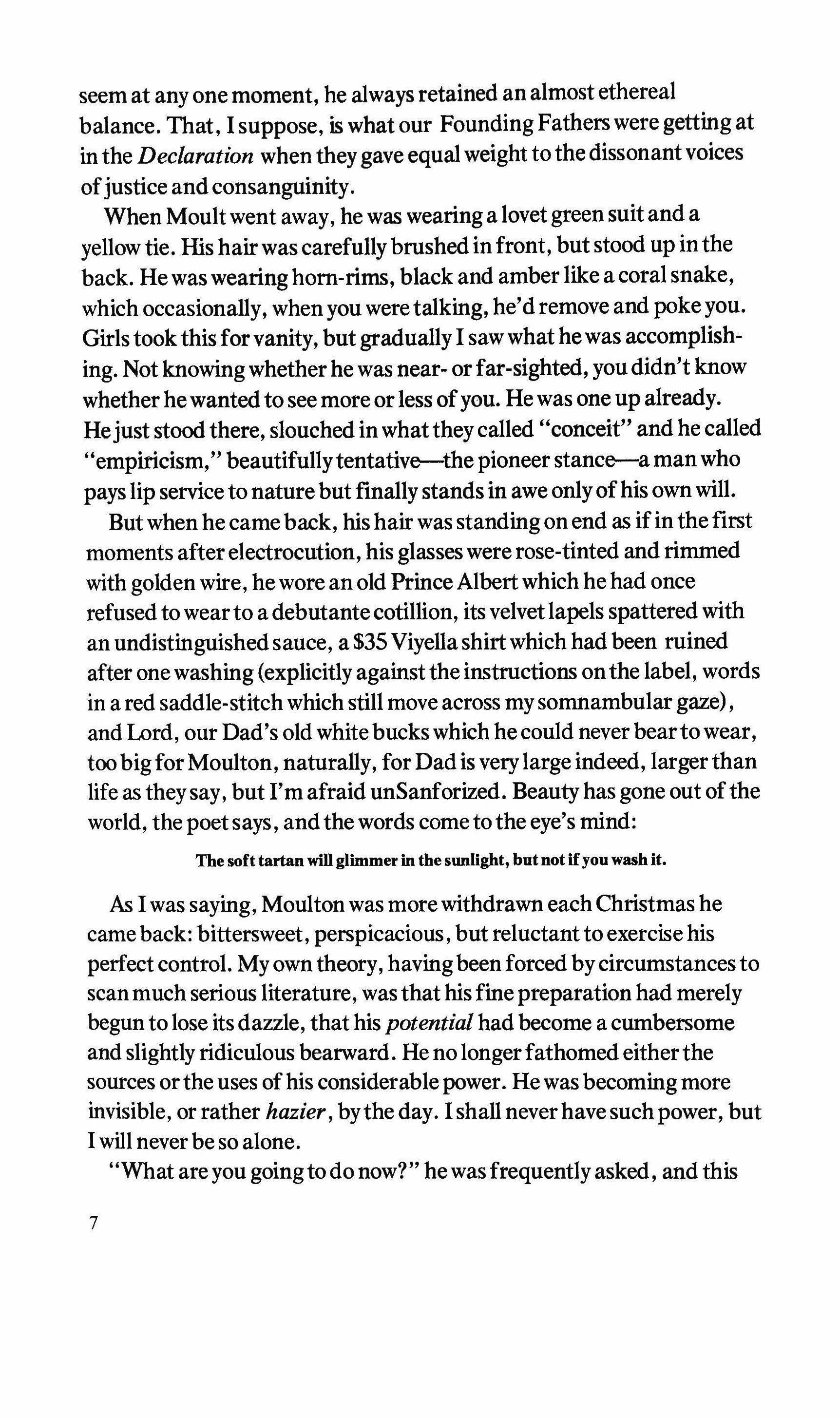 But when he came back, his hair was standing on end as if in thefirst moments after electrocution, his glasses were rose-tinted and rimmed with golden wire, he wore an old Prince Albert which he had once refused to wear to a debutantecotillion, its velvet lapels spattered with an undistinguished sauce, a $35 Viyellashirtwhich had been ruined after one washing(explicitlyagainst the instructions on the label, words in a red saddle-stitch which still move across mysomnambular gaze) and Lord, our Dad's old white buckswhich he could never bearto wear, too big for Moulton, naturally, for Dad is verylargeindeed, largerthan life as they say, but I'm afraid unSanforized. Beauty has gone out ofthe world, the poet says, andthe words come to the eye's mind: