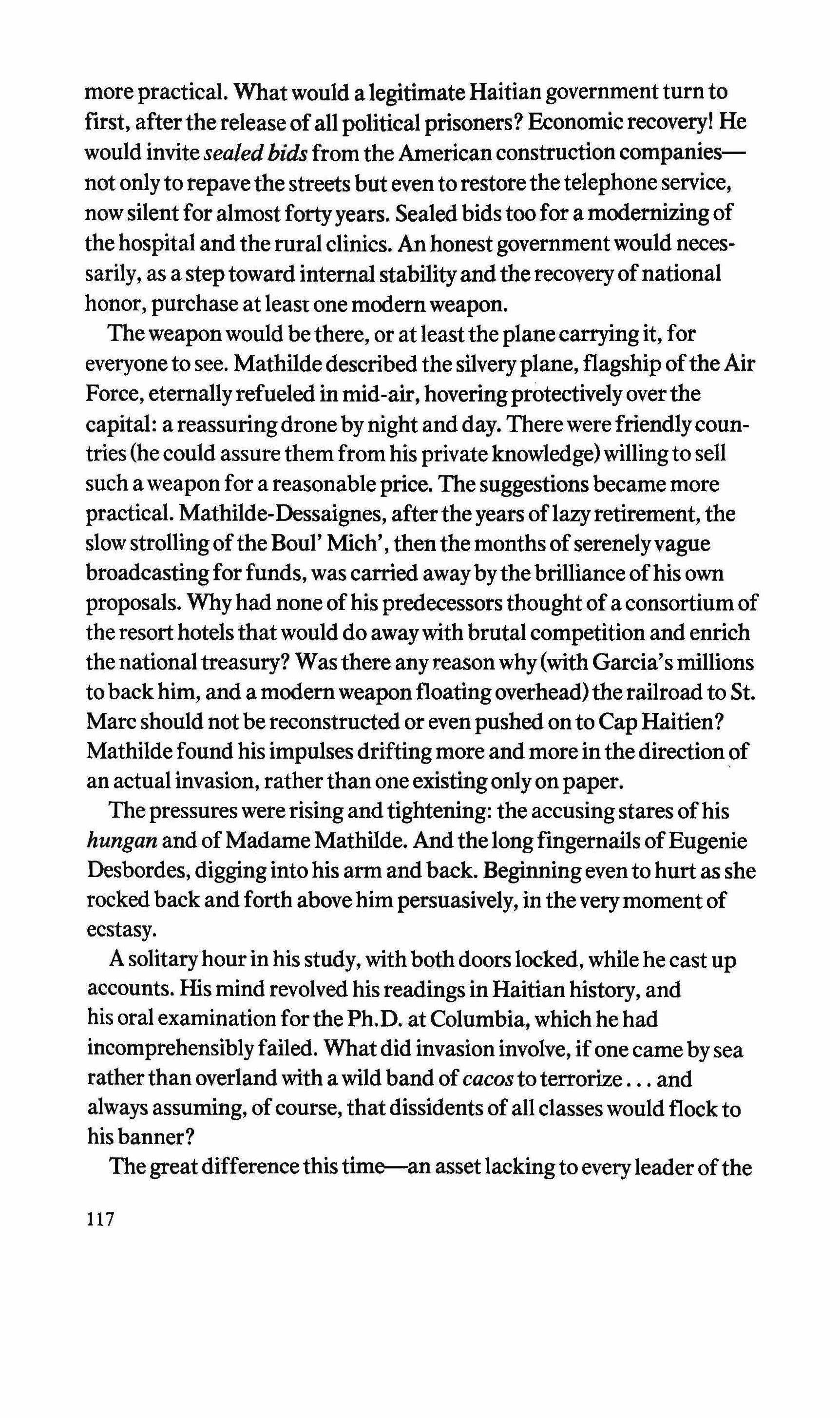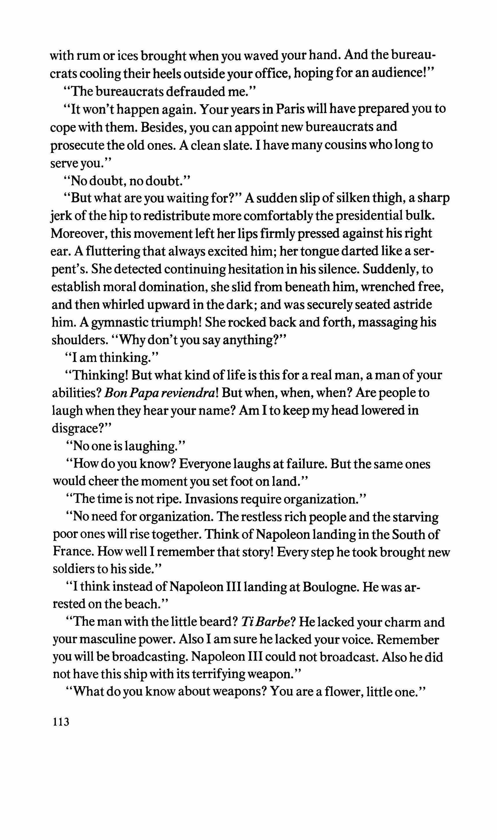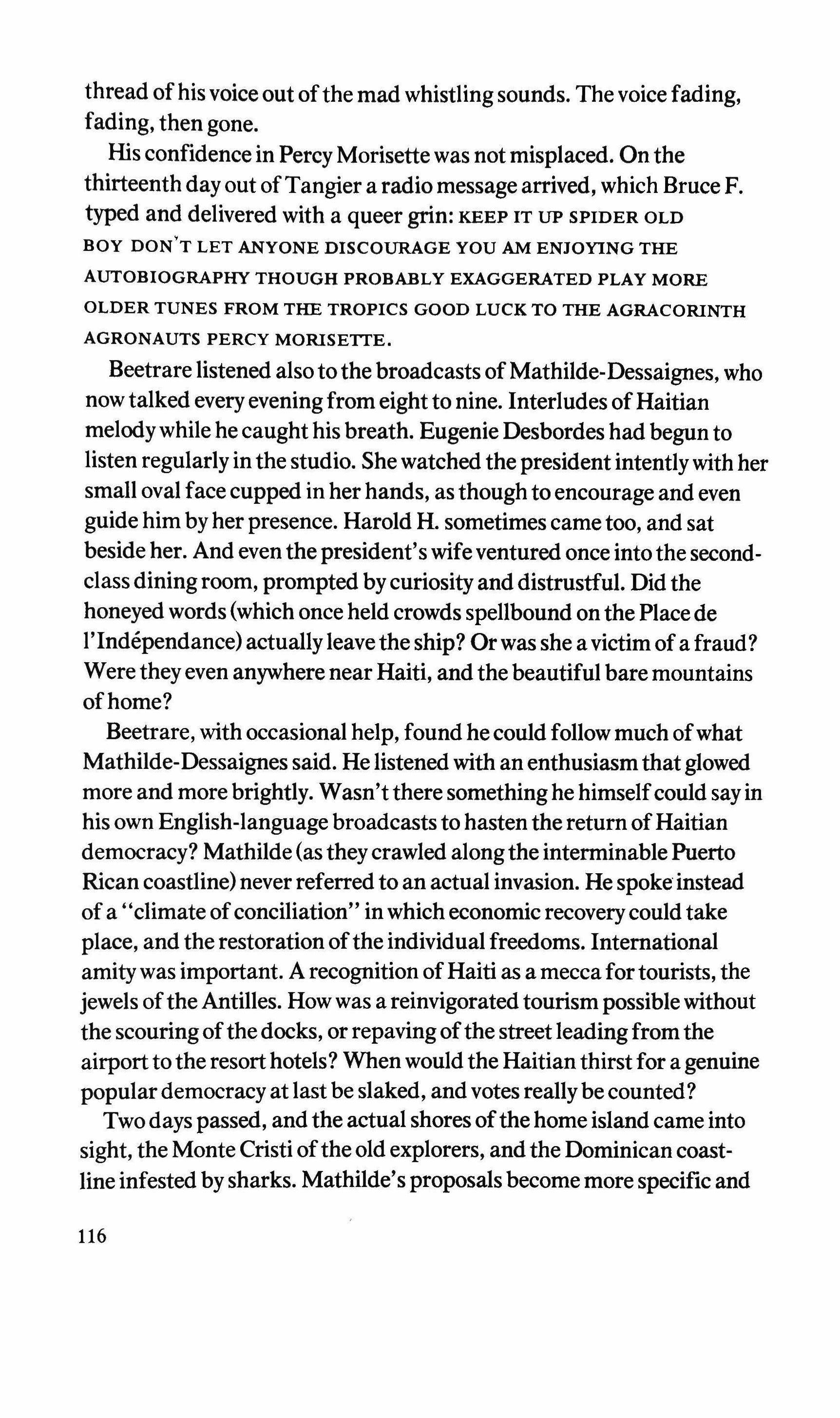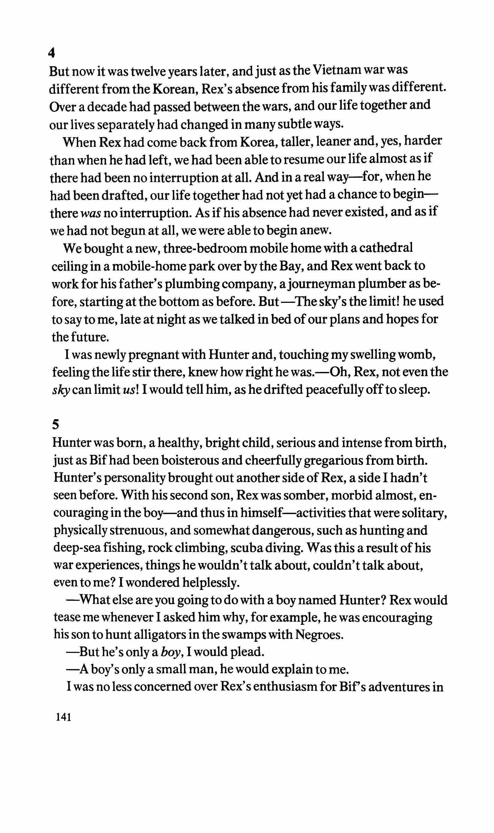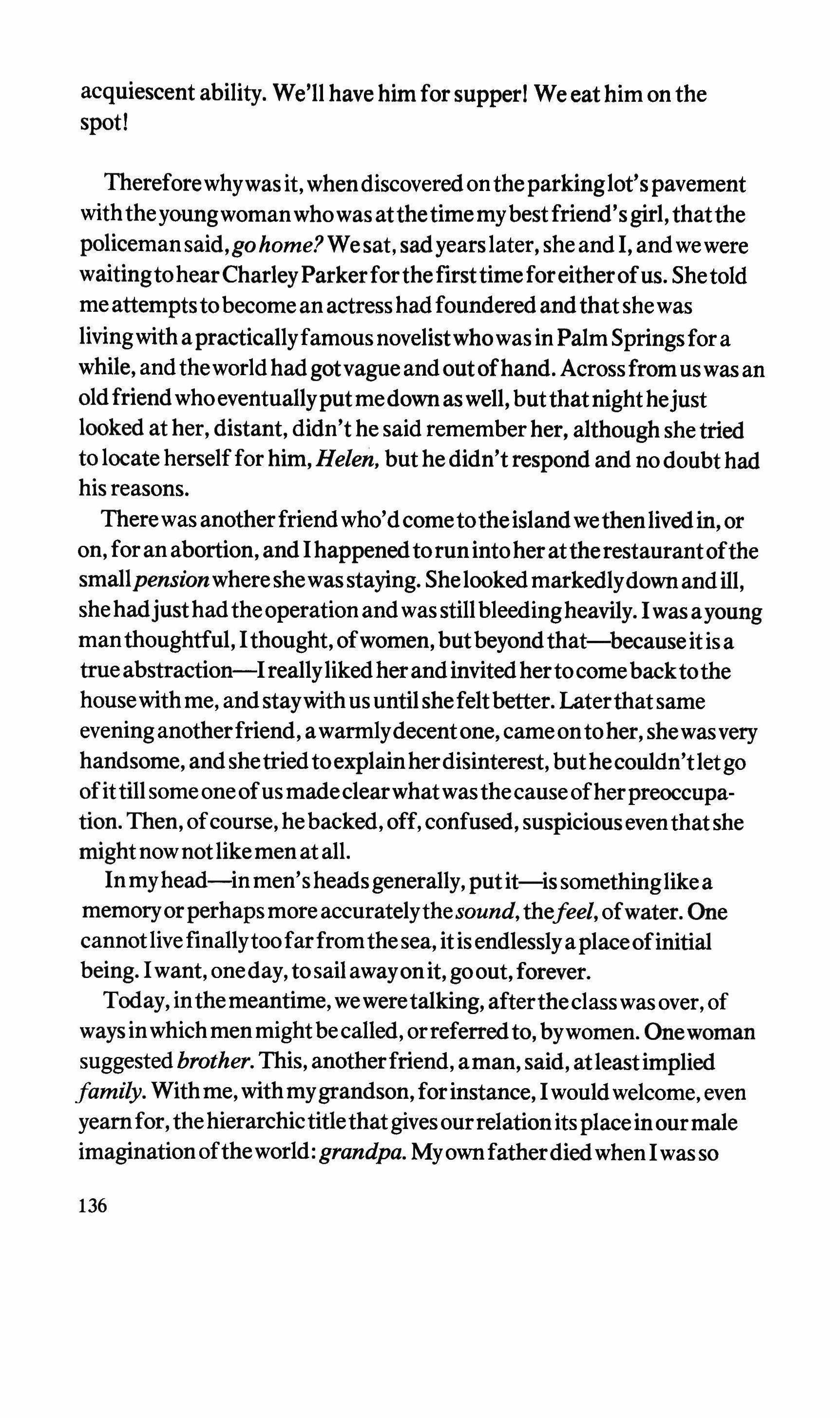 But when he came back, his hair was standing on end as if in thefirst moments after electrocution, his glasses were rose-tinted and rimmed with golden wire, he wore an old Prince Albert which he had once refused to wear to a debutantecotillion, its velvet lapels spattered with an undistinguished sauce, a $35 Viyellashirtwhich had been ruined after one washing(explicitlyagainst the instructions on the label, words in a red saddle-stitch which still move across mysomnambular gaze) and Lord, our Dad's old white buckswhich he could never bearto wear, too big for Moulton, naturally, for Dad is verylargeindeed, largerthan life as they say, but I'm afraid unSanforized. Beauty has gone out ofthe world, the poet says, andthe words come to the eye's mind: