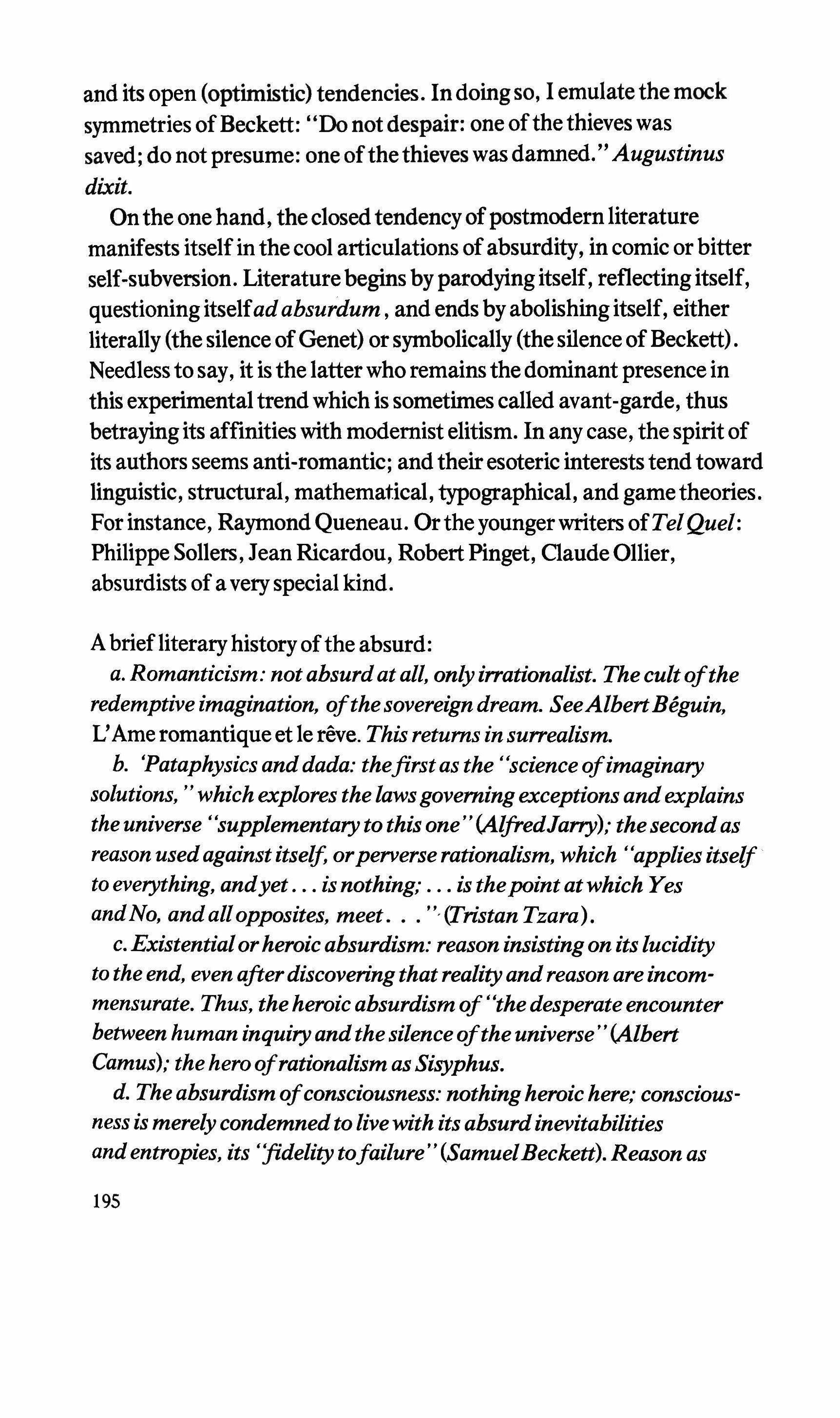 Most of our writers and critics offiction at the presenttime can be divided into two major groups, which operate on ratherdifferent principles. I shall return later to consider more elaboratelythe nature of these groups-and some others-and the relationships amongthem, but forthe moment they may be characterized in terms ofthe metaphor alreadydeveloped here. One group has been to the peak, the other has not. The latter is handicapped by its faith in an outworn creed. The former is also handicapped, but byits loss offaith, its doubt about the very possibilities offiction at the present time. Myprimary concern is with this group, because I believe that its experience ofdoubt-the intellectual vertigo that assails all those who look deep intotheverbal abyss-is an absolutely necessaryexperience forthe writer in our time. To move, to change, even to continue, we must go through this place. There is no way around it. Myfaith in the necessityofdoubt puts me in a doublyparadoxical position. I must urge some to approach the abyss for the first time, even as I exhort others to pass beyond it. Forboth ofthese tasks to be accomplished, it will be necessaryto consider in less metaphorical terms the nature oftheverbal abyss itselfbefore tryingto suggest what may lie on the other side ofit.