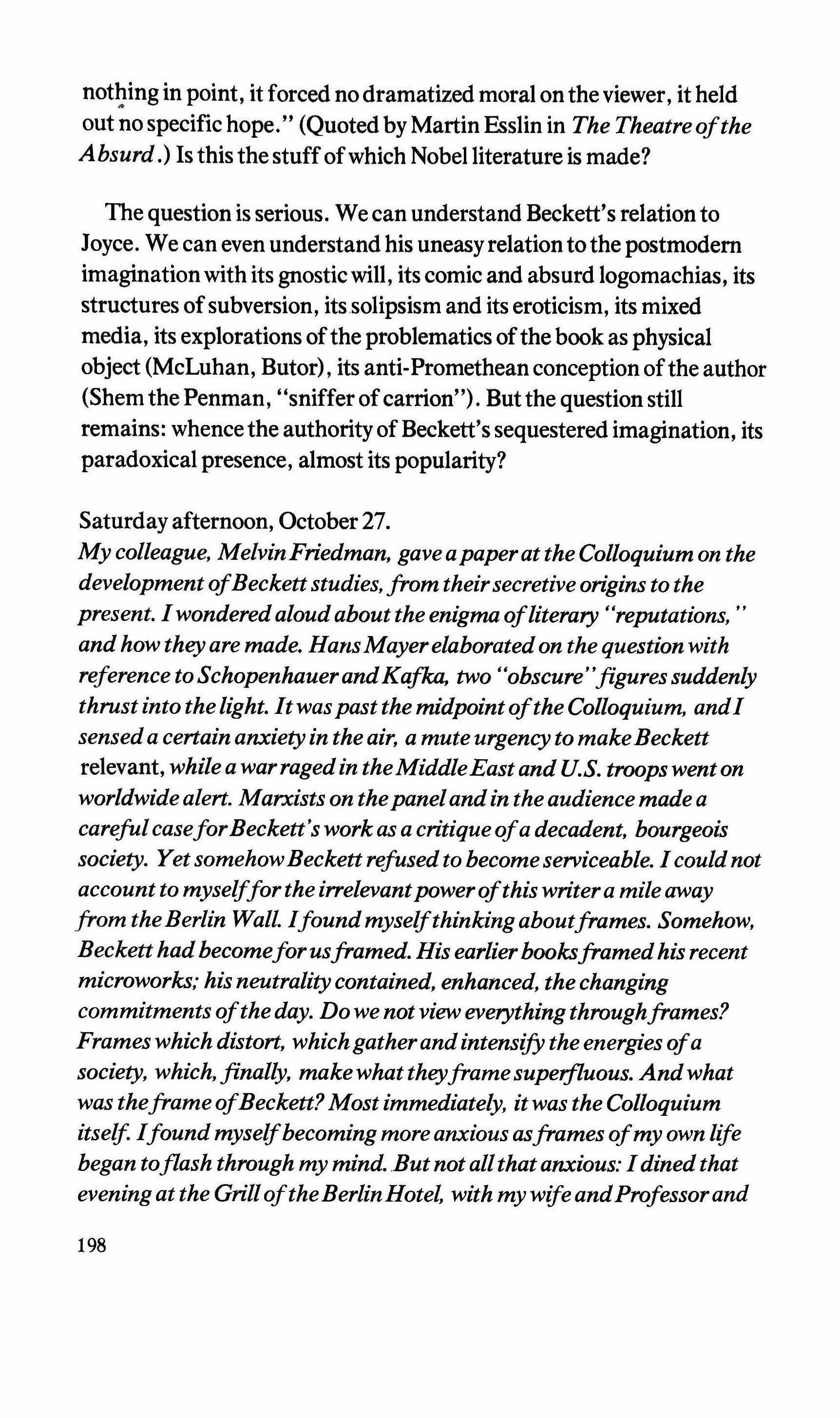 The philosophical anguish I am concerned with here should not be confused with what some take to be the unique horror ofmodern existence, though many students'ofliterature may seek to blame artistic difficulties on existential problems. Frankly, I know of no scale on which to balance the horror ofmodern life againstthat ofanyother age, and I am convinced that every age has had its share ofhorrors forthose sensitive enough to registerthem. No, thevision I am concerned with here is merely a verbal one, as thevision of a mystic may be considered to be merelyspiritual.