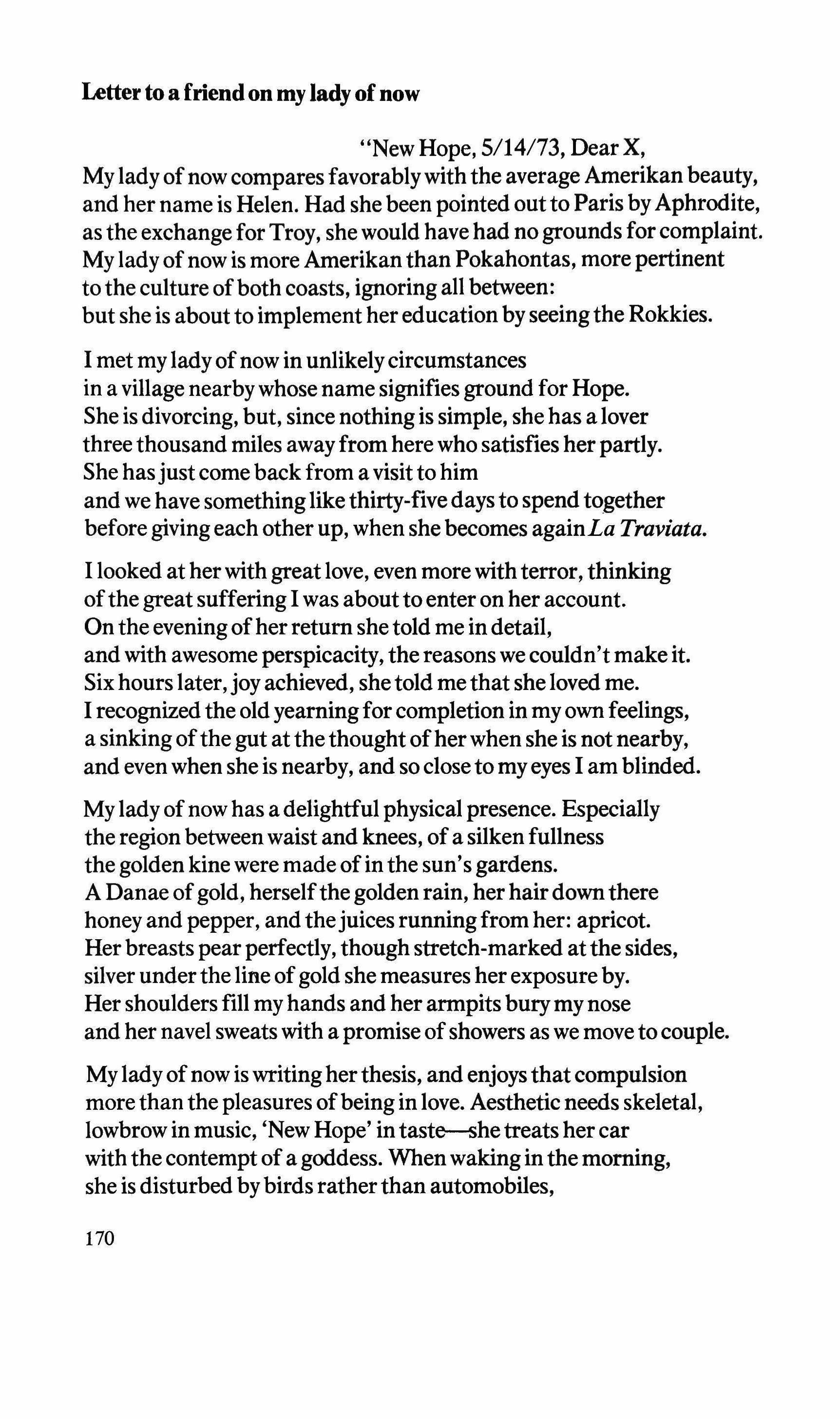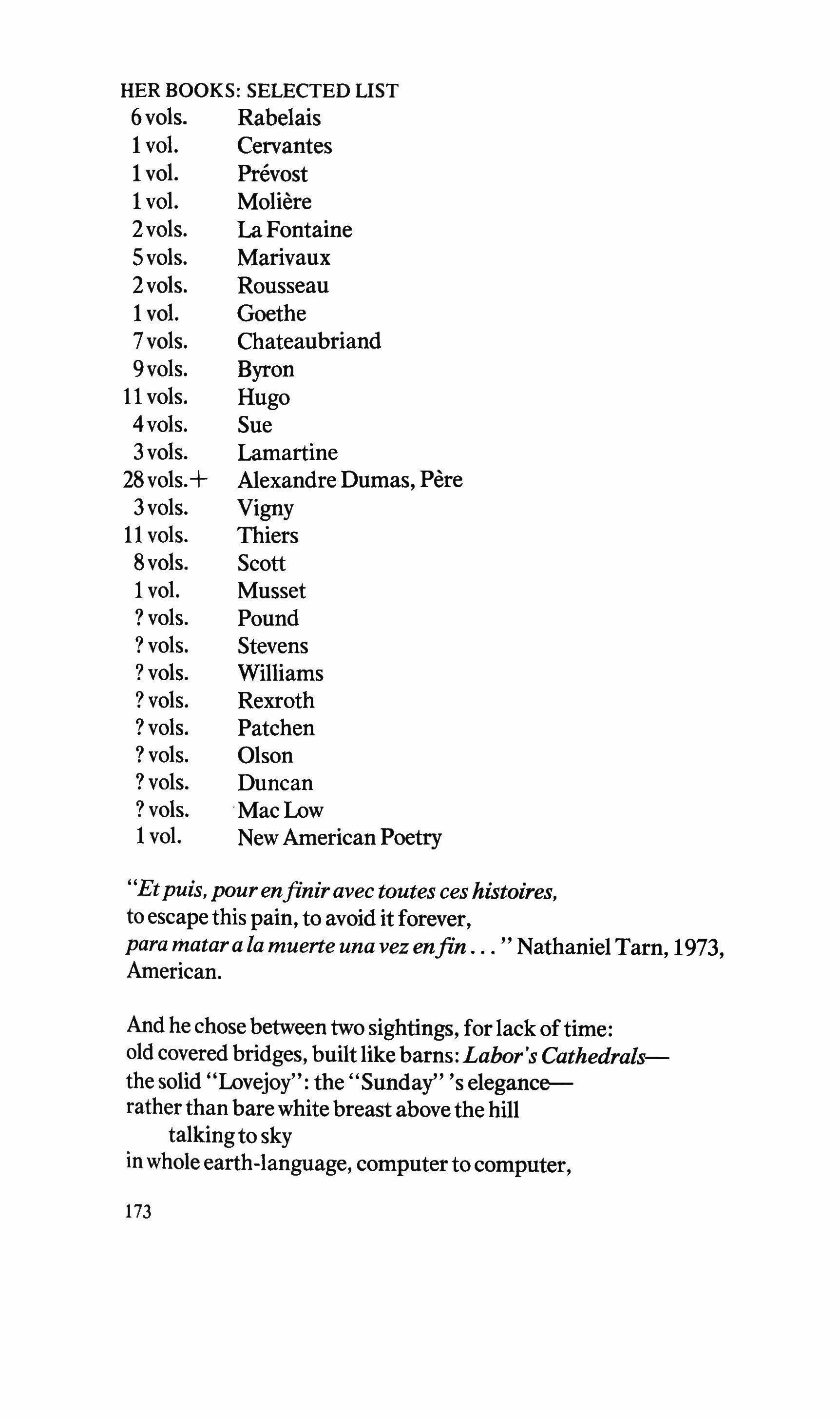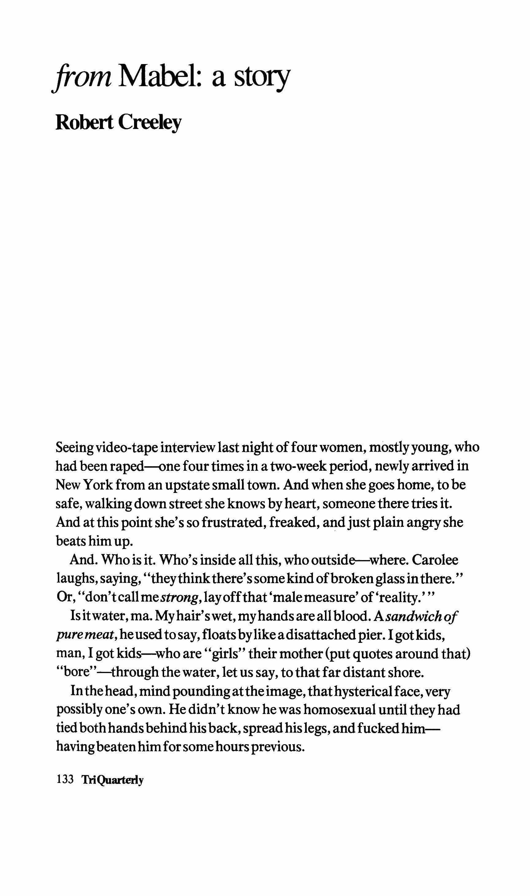 EUGENEWILDMAN teaches at the University of Illinois, ChicagoCircle, where he is at work on a novel and a collection ofstories. He is the author of two novels, Montezuma'sBallandNuclearLove. Three ofMICHAEL BENEDIKT's books ofpoetry have appeared in the WesleyanPoetry Series. He teaches at Hampshire College where he is at work on a number ofprose poems. IAN McEWAN lives and writes in London. FirstLove, LastRites, a collection ofhis stories, was published in the spring of 1975 by Random Houseand Jonathan Cape. ROBERT SCHOLES's essay is one ofhis four Ward-Phillips Lectures given at Notre Dame, to be collected under the title StructuralFabulationsand publishedbythe UniversityofNotre Dame Press. Mr. Scholes teaches at BrownUniversity. WILLIAM S. WILSON is writing a book on the esthetics oftheApollo moon landing. ROBERT CREELEY is a resident of Bolinas, California, but teaches a semester each year at S.U.N.Y. - Buffalo, where he is Professor ofEnglish. His most recent collection ofpoetry is Thirty Things(Black Sparrow}. Abook ofprose, written in collaboration with Marisol and entitledPresences, is forthcoming from Scribner's. Mabel:A Story, excerpted in this issue and a collaboration with Jim Dine, is forthcoming from Black Sparrow. NATHANIELTARN is presently on leave from Rutgers. He is at work on Atlantis:AnAutoAnthropology as well as a new book ofnarrative poems. Mr. Tarnhas published a number ofbooks ofpoetry, among them TheBeautifulContradictions;A Nowherefor Vallejo; ThePersephones; and most recently, with New Directions, LyricsfortheBrideofGod. Hehas also translated from the Spanish(Neruda and others), Maya, and French. JEROME KLINKOWITZ teaches at the UniversityofNorthern Iowa. His work includesLiteraryDisruption/TheMakingofa Post-Contemporary AmericanFiction (University ofIllinois Press), and The Vonnegut