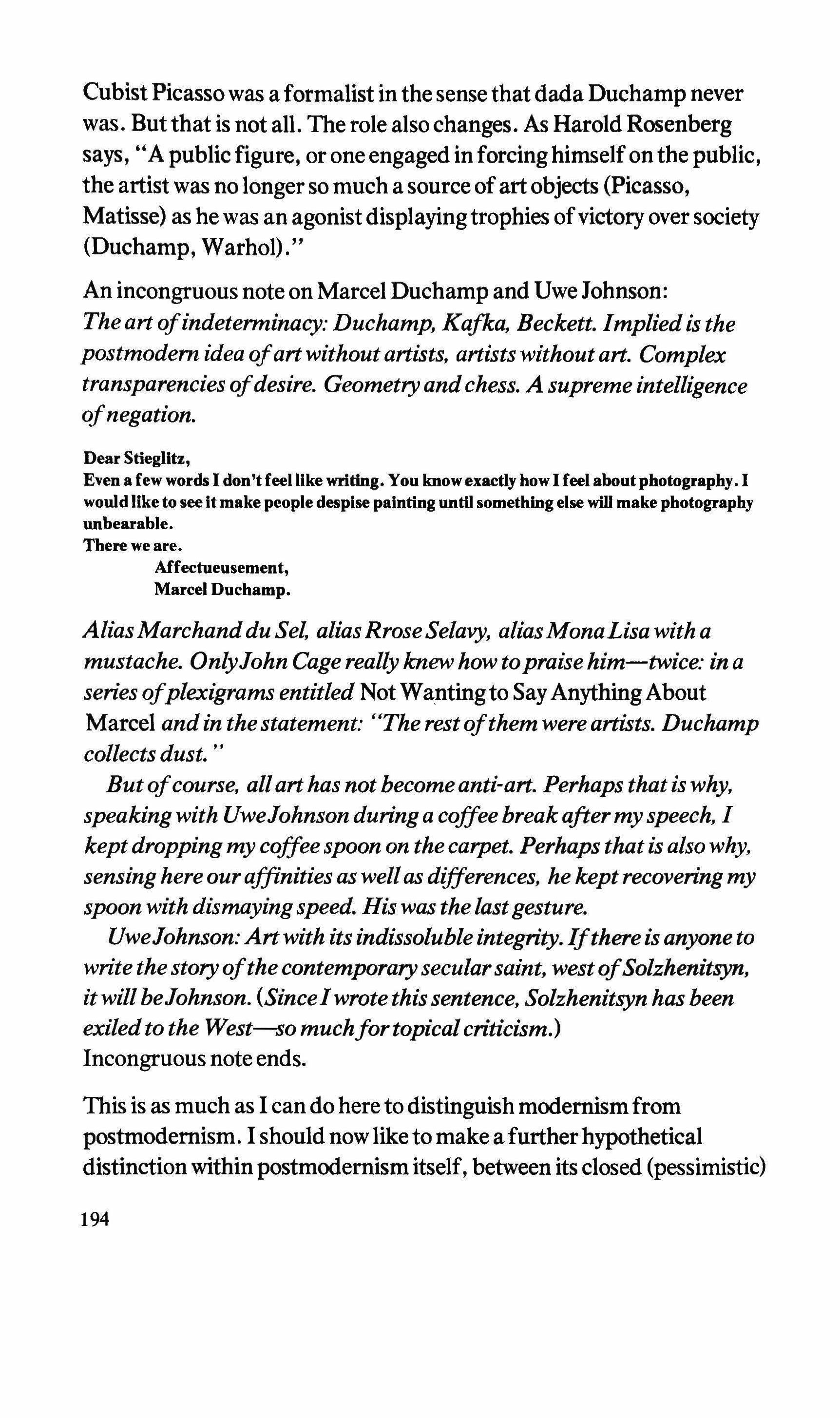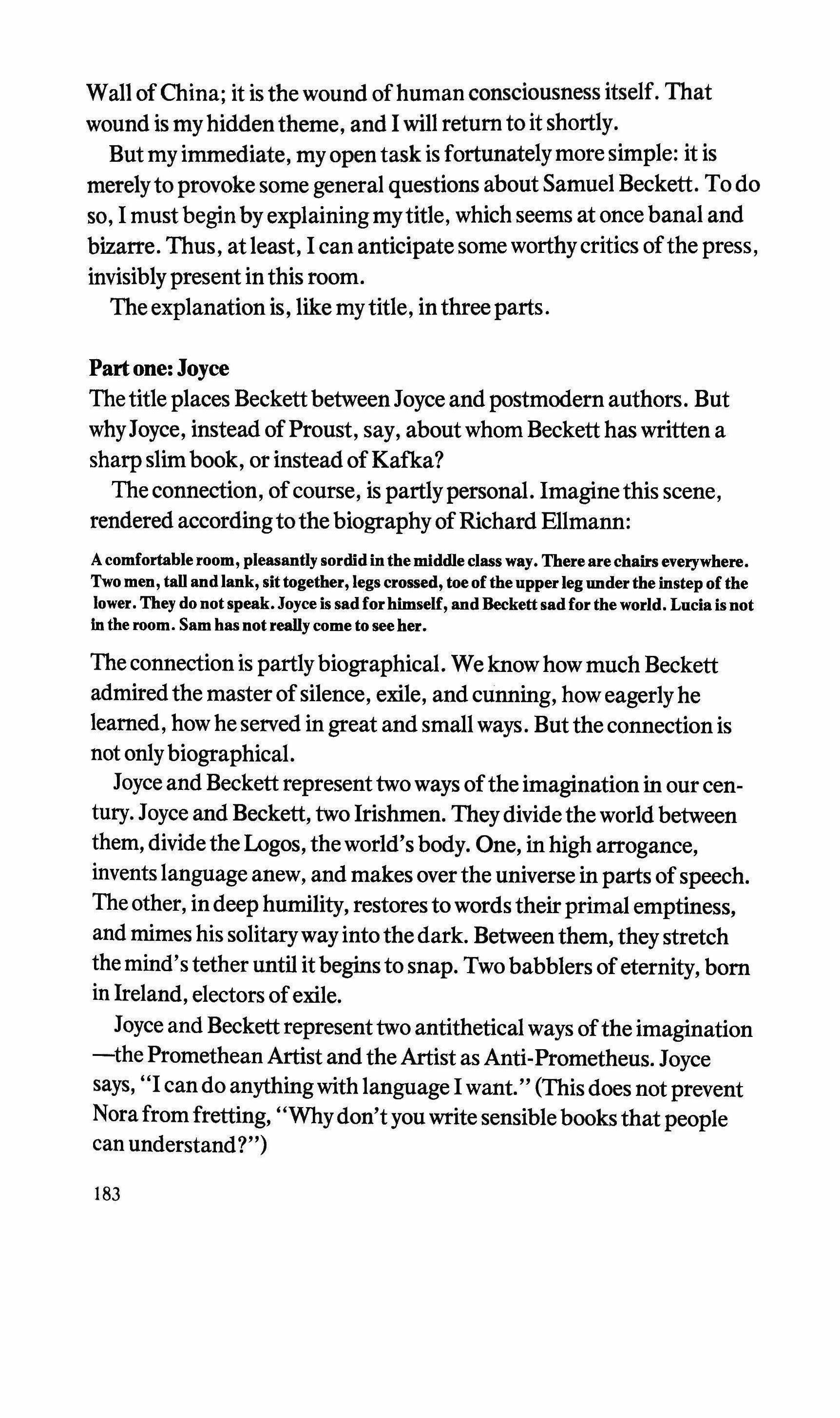 The attempt ofJames Joyce in Ulysses to use a multiplicity ofstyles is a function of his awareness ofthe problem ofnotation. Ifeach aspect of realityrequires a different language, then Joyce would counter by generating an astonishingvariety of narrative codes. Butthe veryfact that Joyce persisted in the proliferation ofcodes in Ulysses indicates that he still subscribed to the realistic faith and was onlyresorting to extreme measures to preserve it. But now, with Joyce'sexamplehelping to clarify the nature ofthe problem, this faith is simply unavailable to thosewho consider carefully the possibilities offiction. For what we can no longer accept is preciselythis Joycean faith in thetranscribability ofthings. It is because reality cannot be recorded that realism is dead. All writing, all composition is construction. We do not imitate the world, we construct versions ofit. There is no mimesis, onlypoiesis. No recording, only constructing.