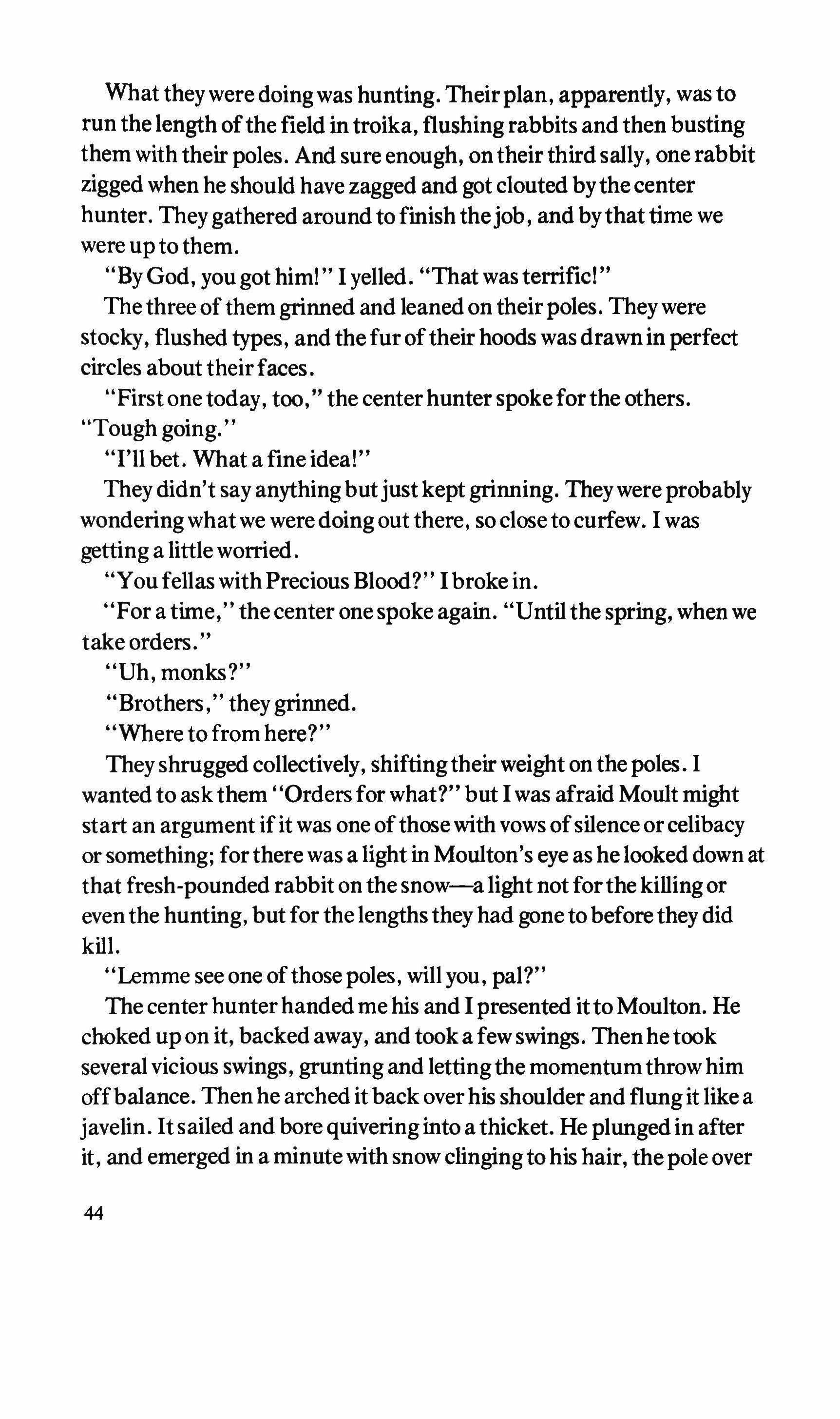Mom and Dad looked up from swabbing out theturkey and rifle, respectively. The air was flecked with beads ofoil. Moulton was stompingaround, cursingsilently. Then he went to the closet, slipped on his parka, flipped me mine, and thumbed me toward the back door.