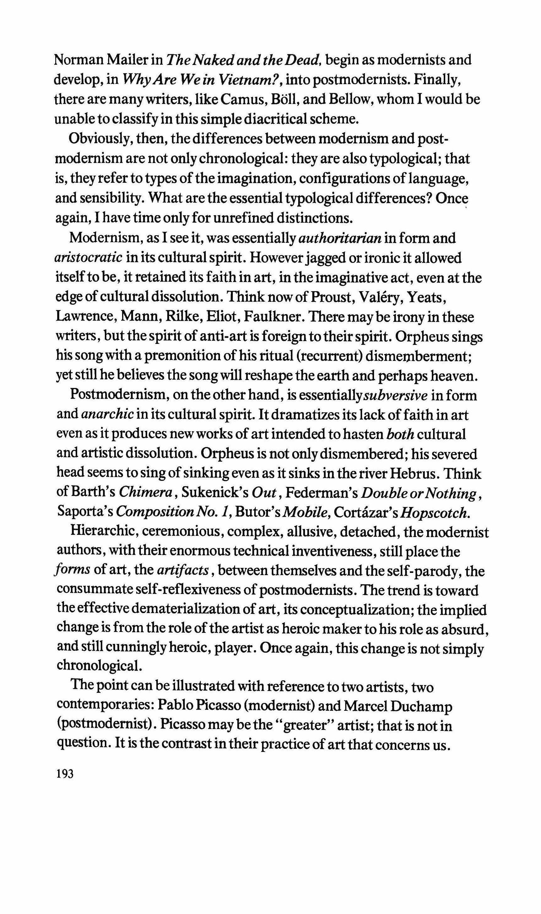If self-reflective fiction is one response to this dilemma, what has been called the newjournalism or the nonfiction novel is another. The best ofthe newjournalists have accepted, consciously or unconsciously, theview I have beendevelopinghere, that both realism and fantasy are impossible achievements. Thus Norman Mailer and Tom Wolfe have adopted highlyidiosyncratic or solipsistic attitudes in reactingto the people, situations, and events thattheyhave dealt with intheirwriting. The reasoningbehind much ofthe newjournalism may be said to function in this way: "Since reality cannot be recorded, all pretense to objectivityis a sham; thereforethe onlyhonest position is to admit one's subjectivity, even to flaunt it. And, on the otherhand, since realityis finallyinescapable, there is bound to be some validity in my wildest flights ofpersonal speculation. Ergo, whatever I feel like sayingis worth hearing, and my method will be simplyto let it all hang out." There is something to be said forthe frankness and spontaneityofthis position, but I thinkthat it, too, is an overreaction to the loss offaith in realistic possibilities. Though all writingis construction, some models maywell bear a useful and quite direct relationship to certain aspects of our human situation. It is preciselybecausethetruth cannot betold that we must exercise such great skill and caution in tryingto approach it.