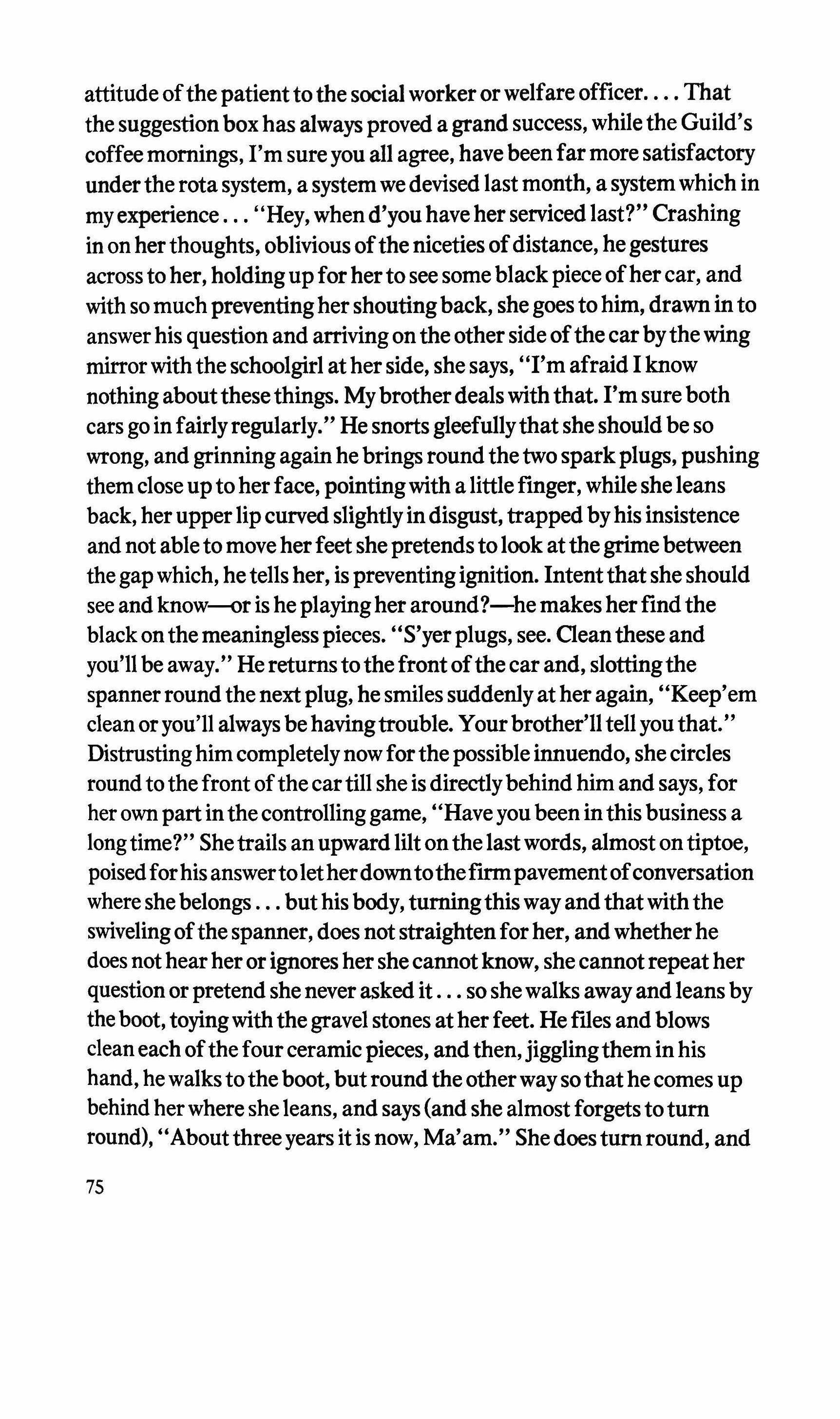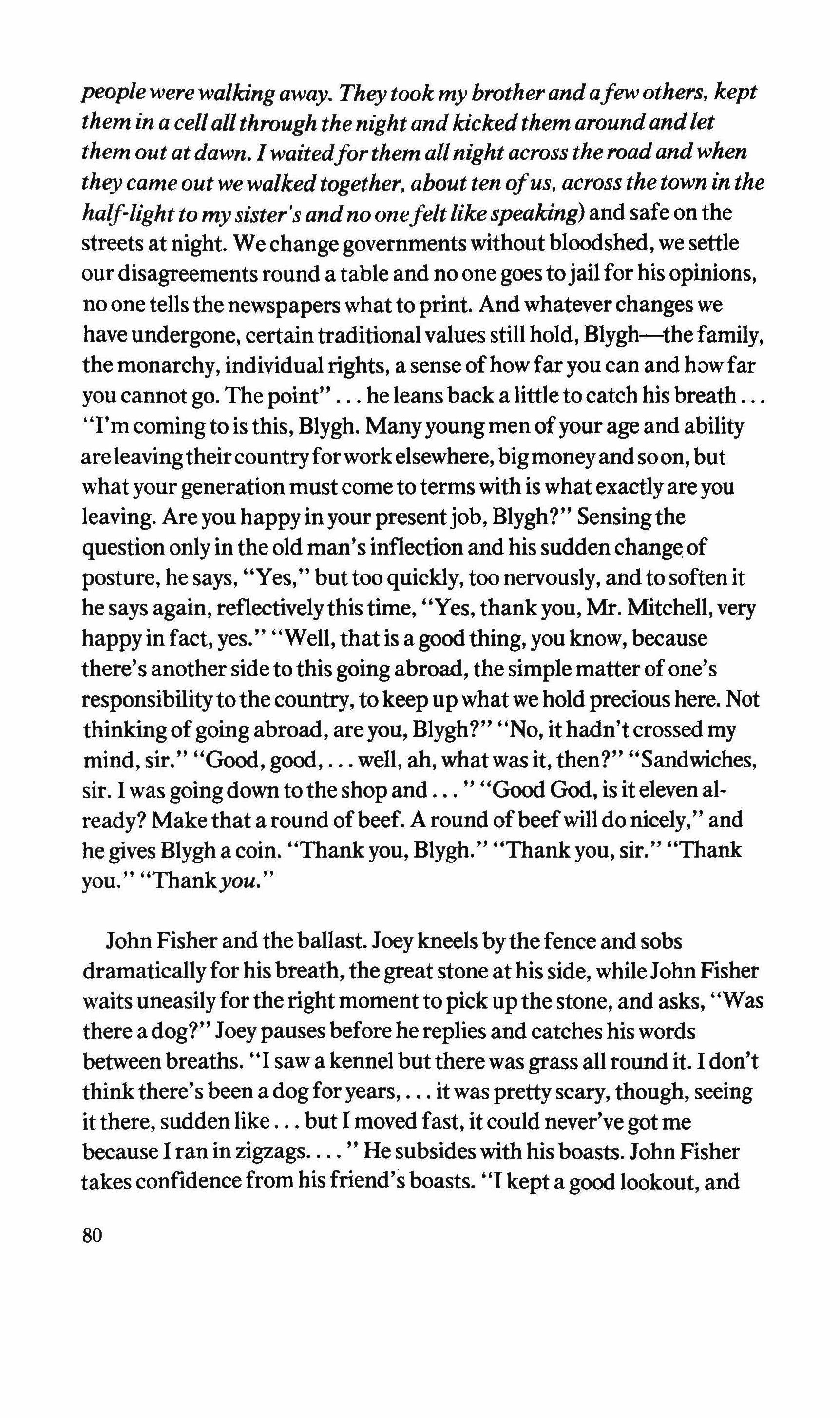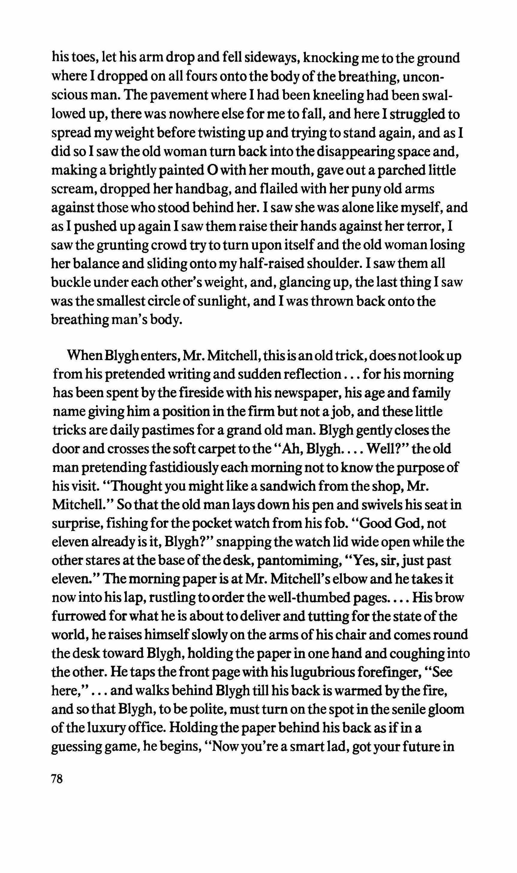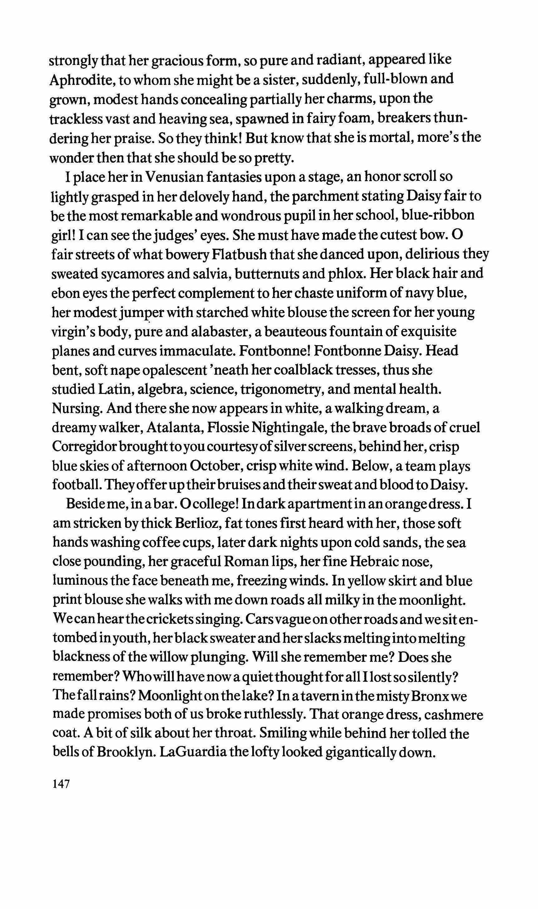 As I was saying, Moulton was more withdrawn each Christmas he came back: bittersweet, perspicacious, but reluctant to exercise his perfectcontrol. My own theory, havingbeen forcedbycircumstancesto scan much serious literature, was that hisfine preparation had merely begun to lose its dazzle, that his potential had become a cumbersome and slightly ridiculous bearward. He no longerfathomed eitherthe sources or the uses ofhis considerable power. He was becoming more invisible, or rather hazier, bythe day. I shall never have such power, but I will never be so alone.