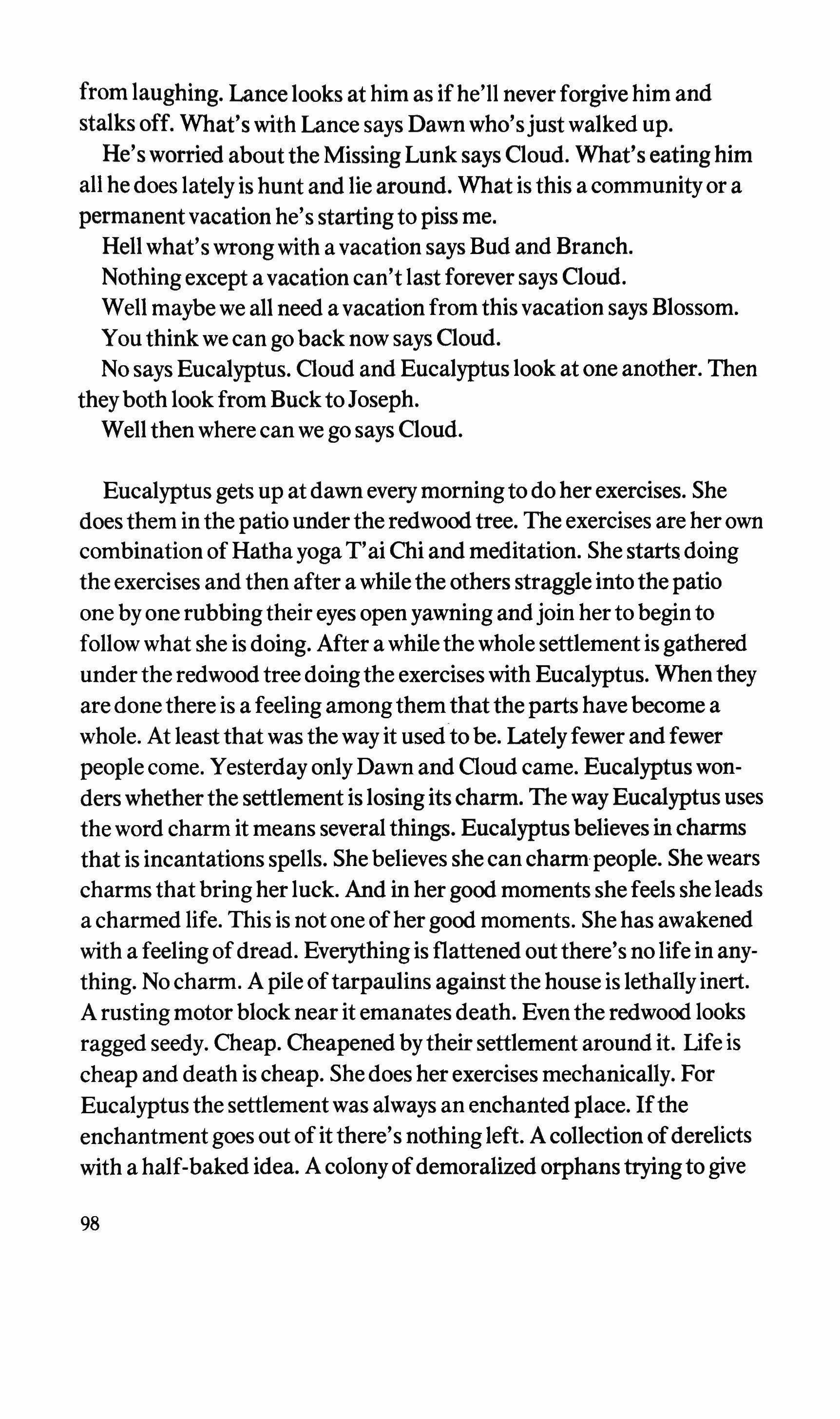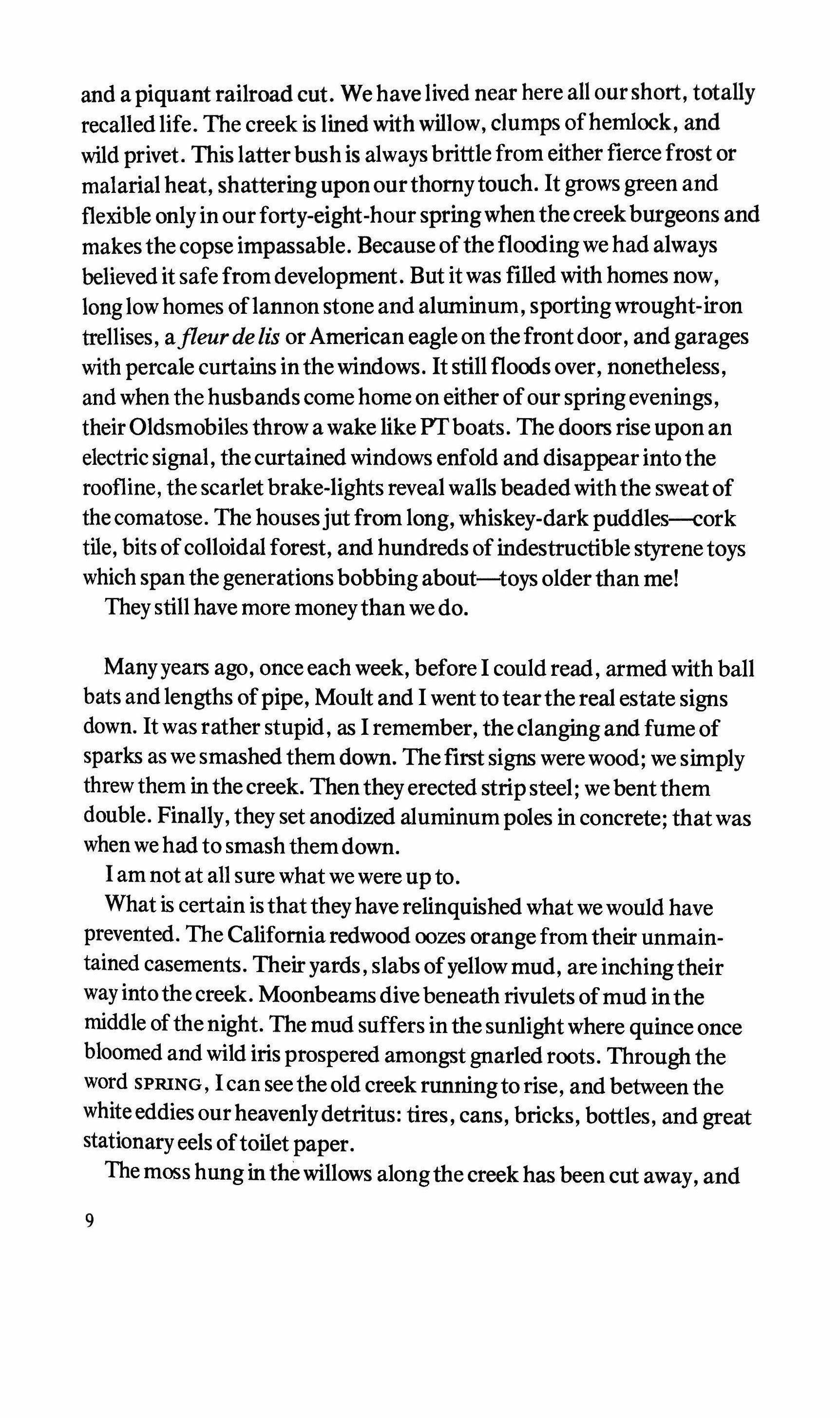 What is certain is that they have relinquished what we would have prevented. The Californiaredwood oozes orangefrom their unmaintained casements. Their yards, slabs ofyellowmud, are inchingtheir way intothecreek. Moonbeams dive beneath rivulets ofmud inthe middle ofthenight. The mud suffers inthesunlightwhere quince once bloomed and wild iris prospered amongstgnarled roots. Through the word SPRING, lean seetheold creek runningto rise, and between the whiteeddies our heavenlydetritus: tires, cans, bricks, bottles, and great stationaryeels oftoilet paper.
