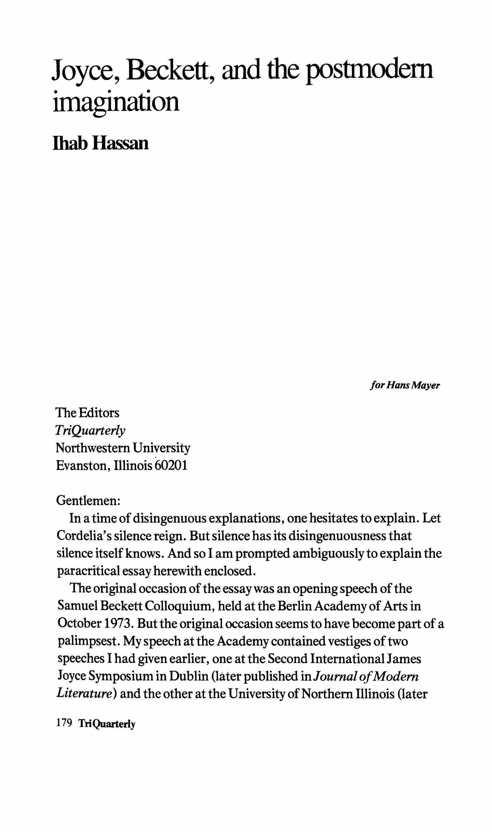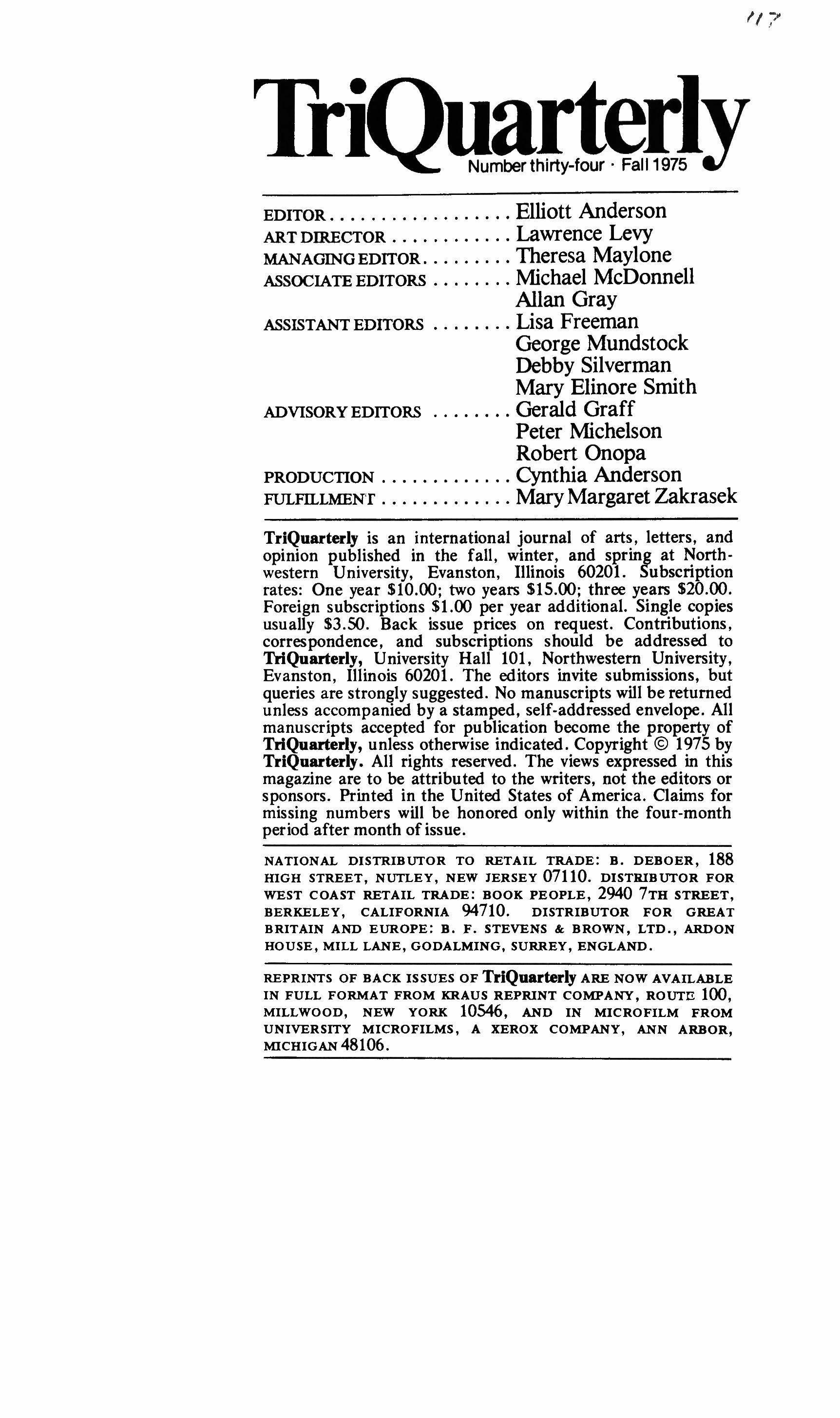 TriQuarterly is an international journal of arts, letters, and opinion published in the fall, winter, and spring at Northwestern University, Evanston, Illinois 60201. Subscription rates: One year $10.00; two years $15.00; three years $20.00. Foreign subscriptions $1.00 per year additional. Single copies usually $3.SO. Back issue prices on request. Contributions, correspondence, and SUbscriptions should be addressed to TriQuartel'ly, University Hall 101, Northwestern University, Evanston, Illinois 60201. The editors invite submissions, but queries are strongly suggested. No manuscripts will be returned unless accompanied by a stamped, self-addressed envelope. All manuscripts accepted for publication become the property of TriQuartel'ly, unless otherwise indicated. Copyright © 1975 by TriQuartel'ly. All rights reserved. The views expressed in this magazine are to be attributed to the writers, not the editors or sponsors. Printed in the United States of America. Claims for missing numbers will be honored only within the four-month period after month of issue.