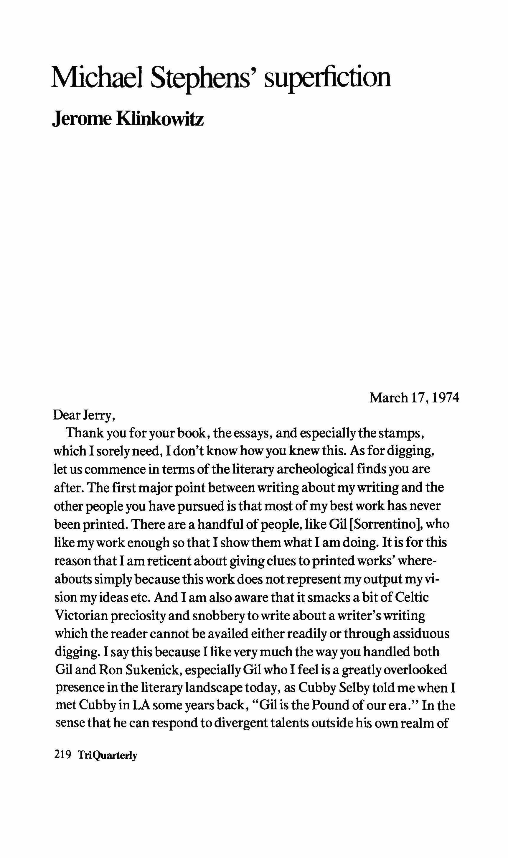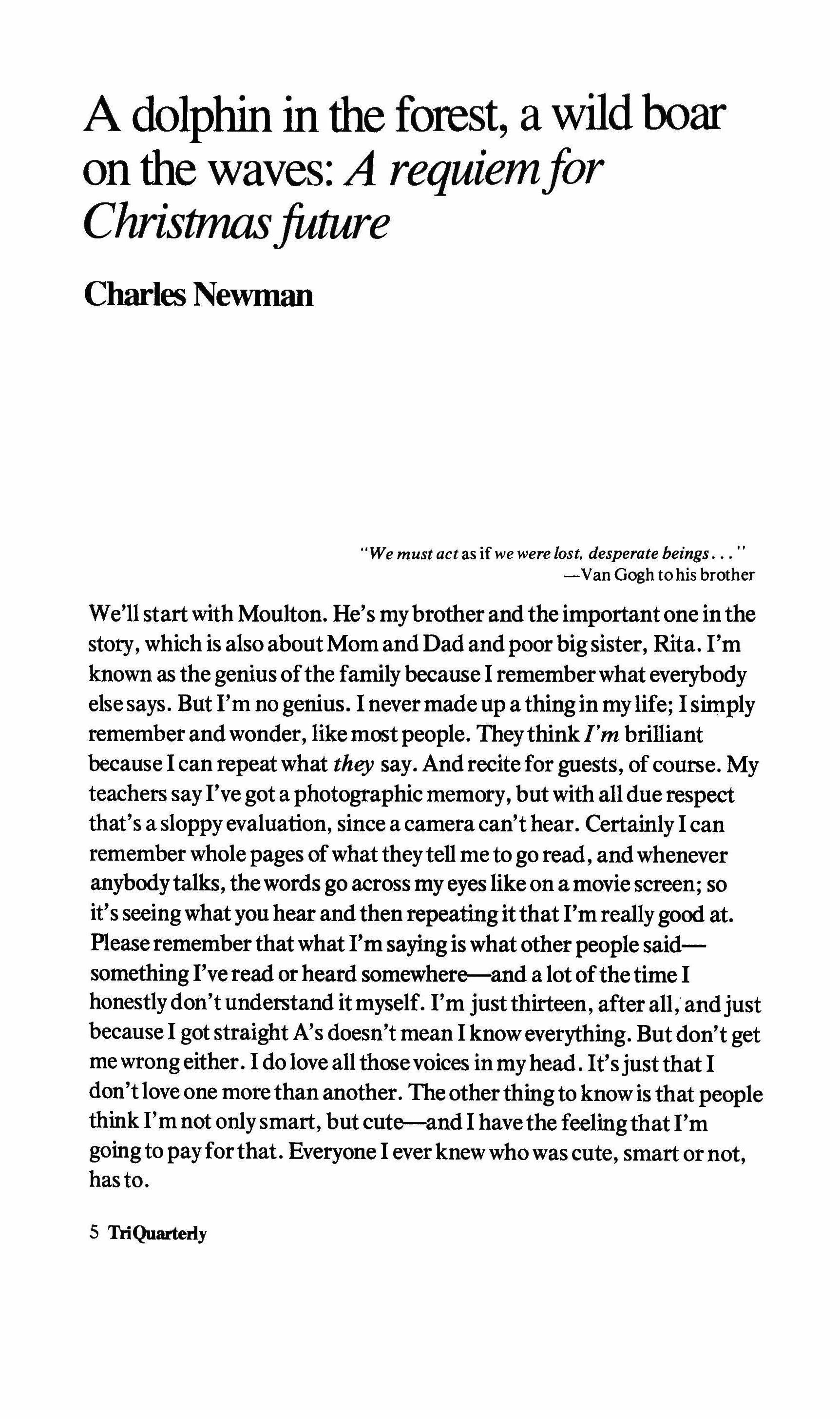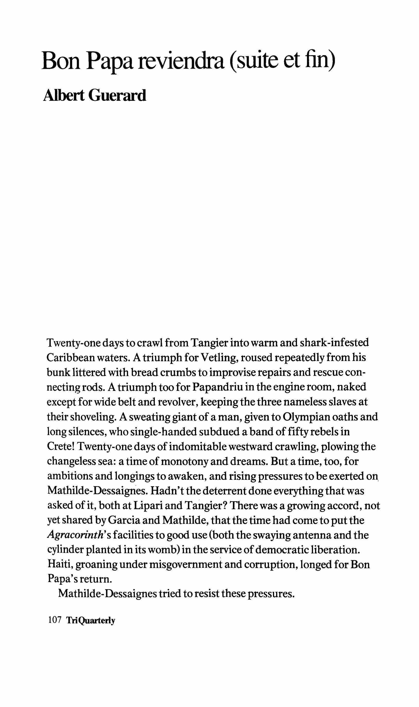Statement(Delacorte). Heis halfIrish. MICHAELSlEPHENS is wholly Irish and lives in New York. Hehas written a novel, a collection ofpoems, and a book ofparagraphs entitled Paragraphs.IHAB HASSAN is Vilas ResearchProfessor ofEnglish and Comparative Literature at the University ofWisconsin in Milwaukee. He is the author ofRadicalInnocence; The Literature ojSilence; TheDismemberment ojOrpheus; andParacriticisms. JOSEPHMcELROY lives in NewYorkand teaches at QueensCollege. He is the author offour novels: A Smuggler'sBible;Hind'sKidnap;Ancient History; and most recentlyLookout Cartridge(Knopf), portions ofwhich appeared in TriQuarterly29. Mr. McElroy has contributed essays and reviews to a number ofmagazines andjournals. CHARLES NEWMAN's latest book isA Child'sHistoryojAmerica(SwallowPress). Heis also the author oftwo novels, NewAxisand ThePromisekeeper. ALBERT GUERARD is on leave from Stanford University. He is the author of sixpublishednovels, includingNightJourneyand TheExiles. His "Bon PapaReviendra (SuiteetFin)"is an excerpt from a more recent unpublished work, Still Talking. Mr. Guerard is presently at work on a studyofDostoevsky, Dickens, and Faulkner.ANDREI CODRESCU 's "parents were trivial compared to the number ofparental mythologies he later collected. God bless him. There was the Anarchist Father who blew up trains. TheAristocrat Mother who made hashish cookies. TheAristocratFatherwho drank himselfinto a deliriumand died with a machinegun inhis hands, firing. The Mother Owner of an Art Gallery who traveledextensively to and from Japan and who dropped in for a few hours in New York to give him a couple of thou. The Father who died hanging injail. The Mother who gave himmoney whenhe was 14years old to go get himself a room where to fuck his girlfriends. TheFather who tried to assassinate De Gaulle and was caught. The uncle who was a painter in Spain. The other uncles who died violently in Monaco. The scores ofillustrious relatives recliningmelodramaticallyin extreme situations. The closest to unadornished truth came Grandmother (maternal), who alwaysappeared as the old, sturdypeasant woman carrying heavy geese to and fromthe marketplace and who, at 86, still decapitatedthe birds herself. In realityshe must have been a 6O-70-year-old Jewish woman, fat and knobby, who did indeed buyher own birds and did the cooking for thewhole family but had the local rabbi do the killing. What is known for sure concerns dates. He was born in December 1946 in Sibin, Transylvania, Romania. Sibin was (is) an old German settlement filledwith churches: On Sundays it smelledlike apple strudel. The town fraus wore starched skirts