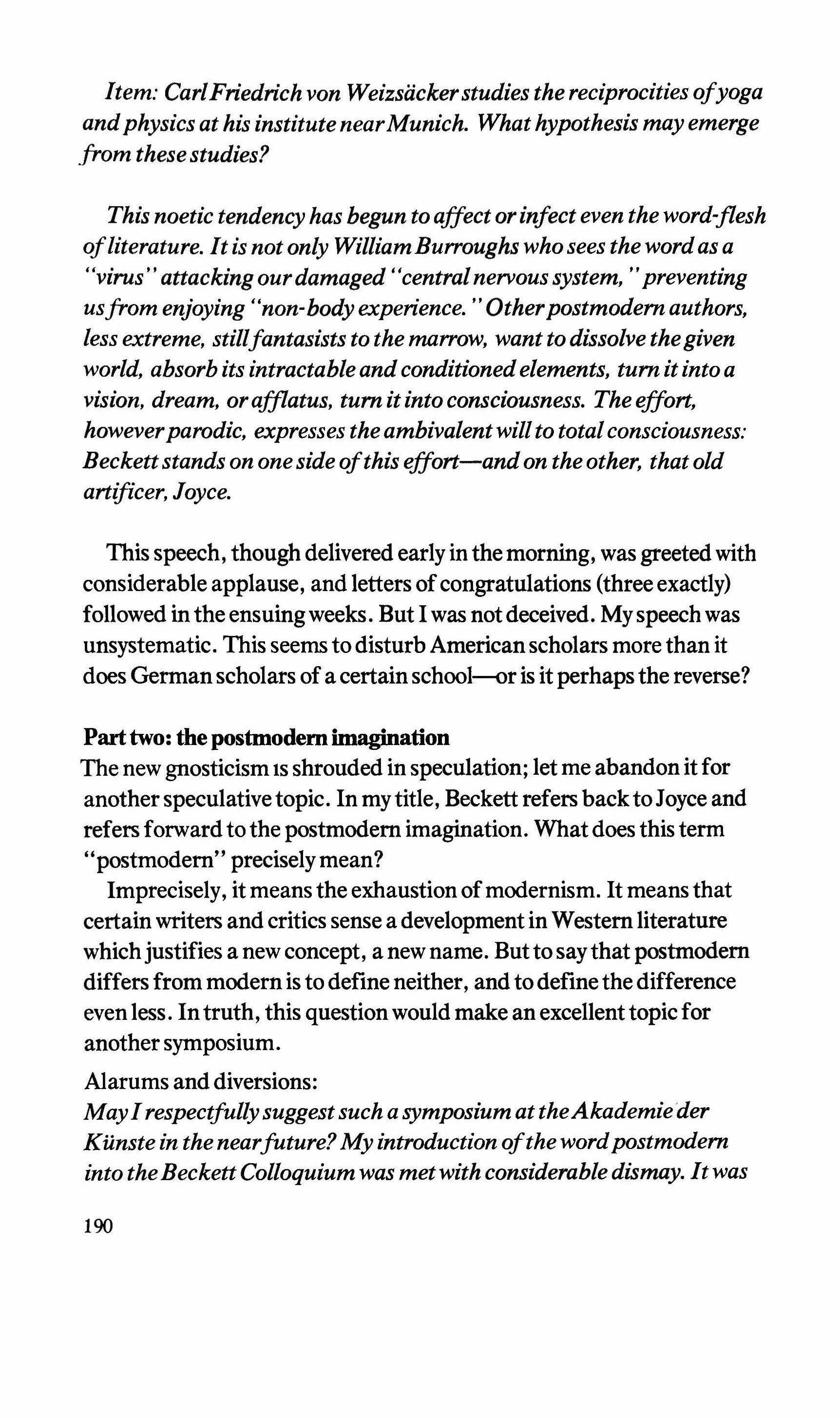 and will require a philosophical answer. Which means that literary criticism should engage the problem itself and not merely wrestle with the symptoms of it. As Robert Coover pointed out in his metafictional Pricksongs & Descants, the contemporarywriters offiction "have been brought into a blind alleyby critics and analysts." Ifthere is a way out ofthis blind alley at present, it must be found bywriters themselves, of course, but "critics and analysts" should at least feel obliged to help clarifythe problem. And the problem is a complex one because it involves both thosewriters paralyzedbysolipsisticvertigo and those who haveyet to experience it.