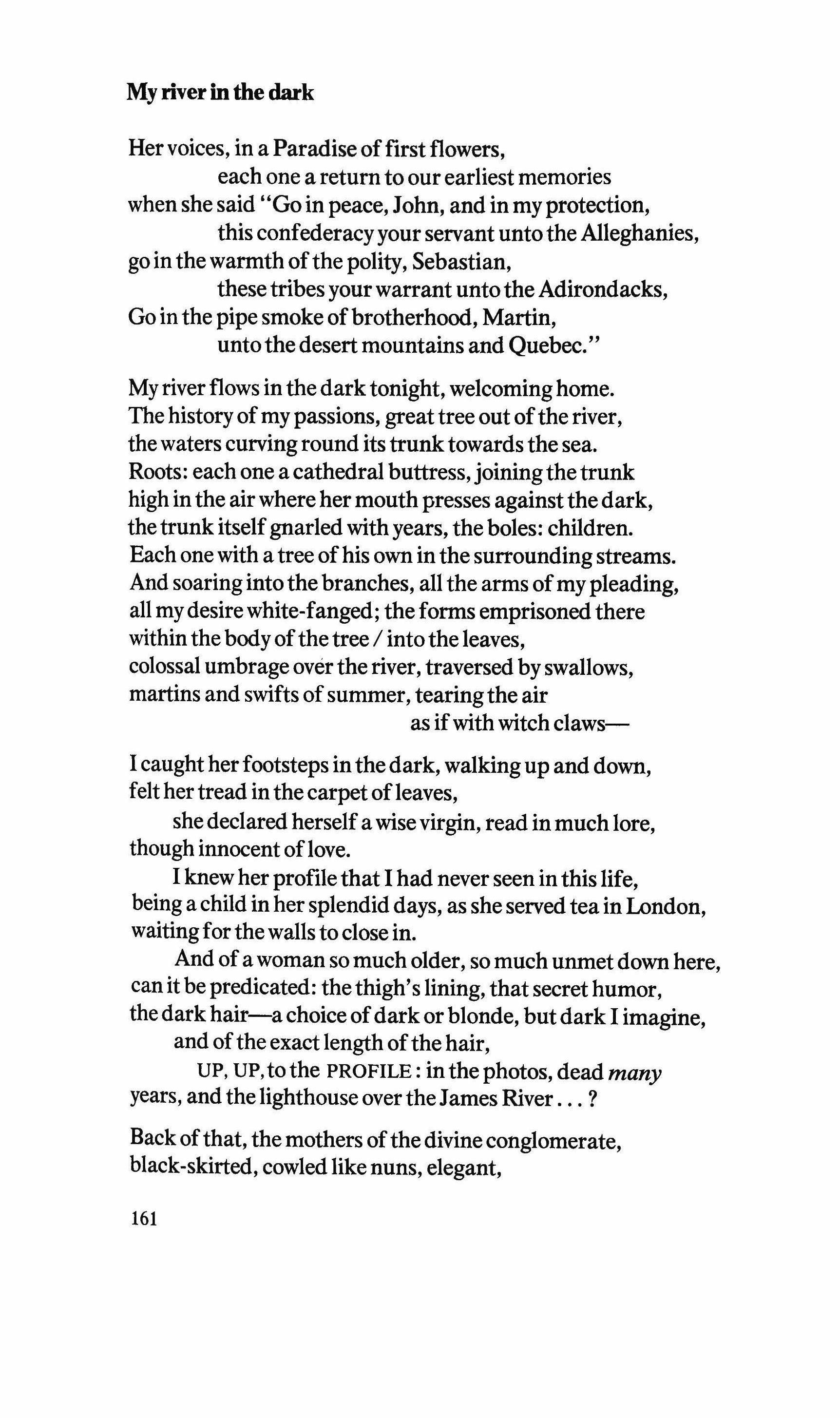 and a piquant railroad cut. We have lived near here all our short, totally recalledlife. The creek is lined with willow, clumps ofhemlock, and wild privet. This latter bush is always brittle from either fierce frost or malarial heat, shattering upon our thornytouch. It grows green and flexible only in ourforty-eight-hour springwhen the creekburgeons and makesthe copse impassable. Because oftheflooding we had always believed it safe fromdevelopment. But it was filled with homes now, longlowhomes oflannon stone and aluminum, sportingwrought-iron trellises, afleurdelis or American eagle on thefrontdoor, and garages with percale curtains inthewindows. It still floods over, nonetheless, and when the husbands come home on either of our springevenings, theirOldsmobiles throw a wake like Pfboats. The doors rise upon an electric signal, the curtained windows enfold and disappear into the roofline, the scarletbrake-lights reveal walls beadedwiththe sweat of the comatose. The housesjut from long,whiskey-darkpuddles-cork tile, bits ofcolloidal forest, and hundreds ofindestructible styrenetoys which spanthe generationsbobbingabout-toys older than mel Theystill have more moneythan we do.