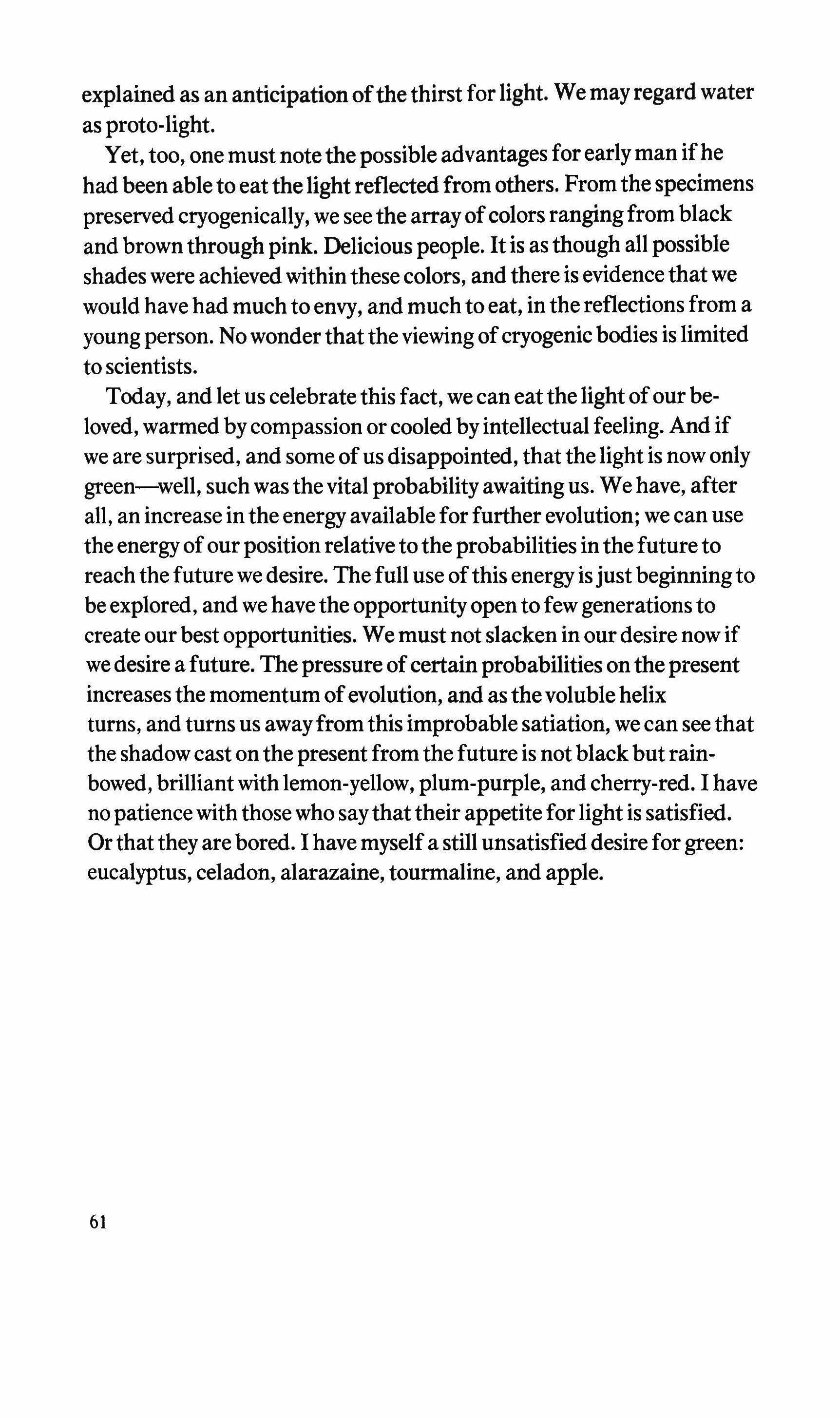 The point ofthiswhole discussion has been to suggestthatthe function ofcriticism at the presenttime is to provide a climate inwhich fiction's progression intothe future can itselfbe facilitated byuseful feedback. Ifthebest waythat fiction can regenerate a criticism of presentlife is through the construction ofmodels ofthefuture-and