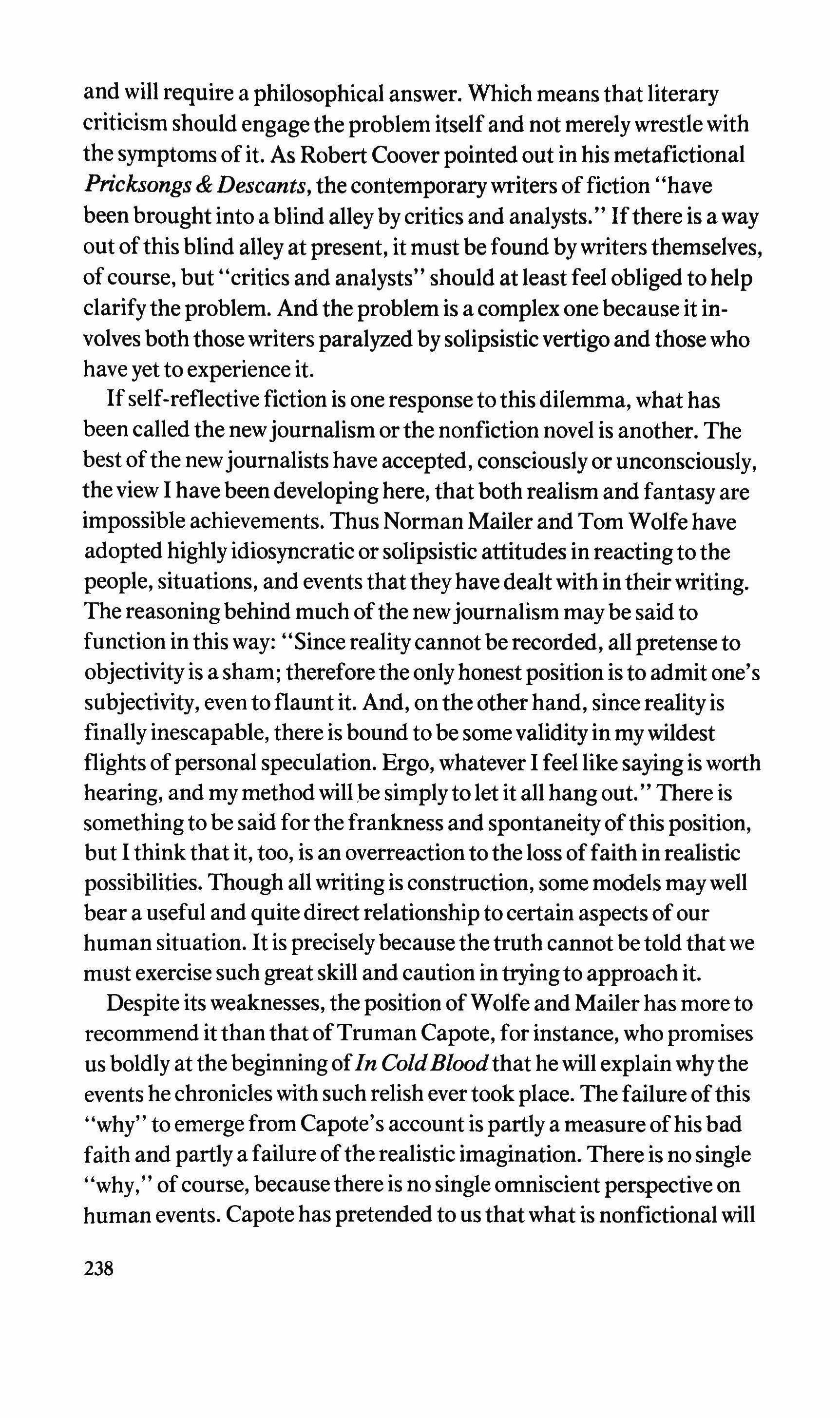 Despite its weaknesses, the position of Wolfe and Mailer has more to recommend itthan that ofTruman Capote, for instance, who promises us boldly at the beginning ofIn ColdBloodthat he will explainwhythe events he chronicles with such relish ever took place. The failure ofthis "why" to emerge from Capote's account is partly a measure ofhis bad faith and partly a failure ofthe realistic imagination. There is no single "why," of course, because there is no single omniscient perspective on human events. Capote has pretended to us that what is nonfictional will