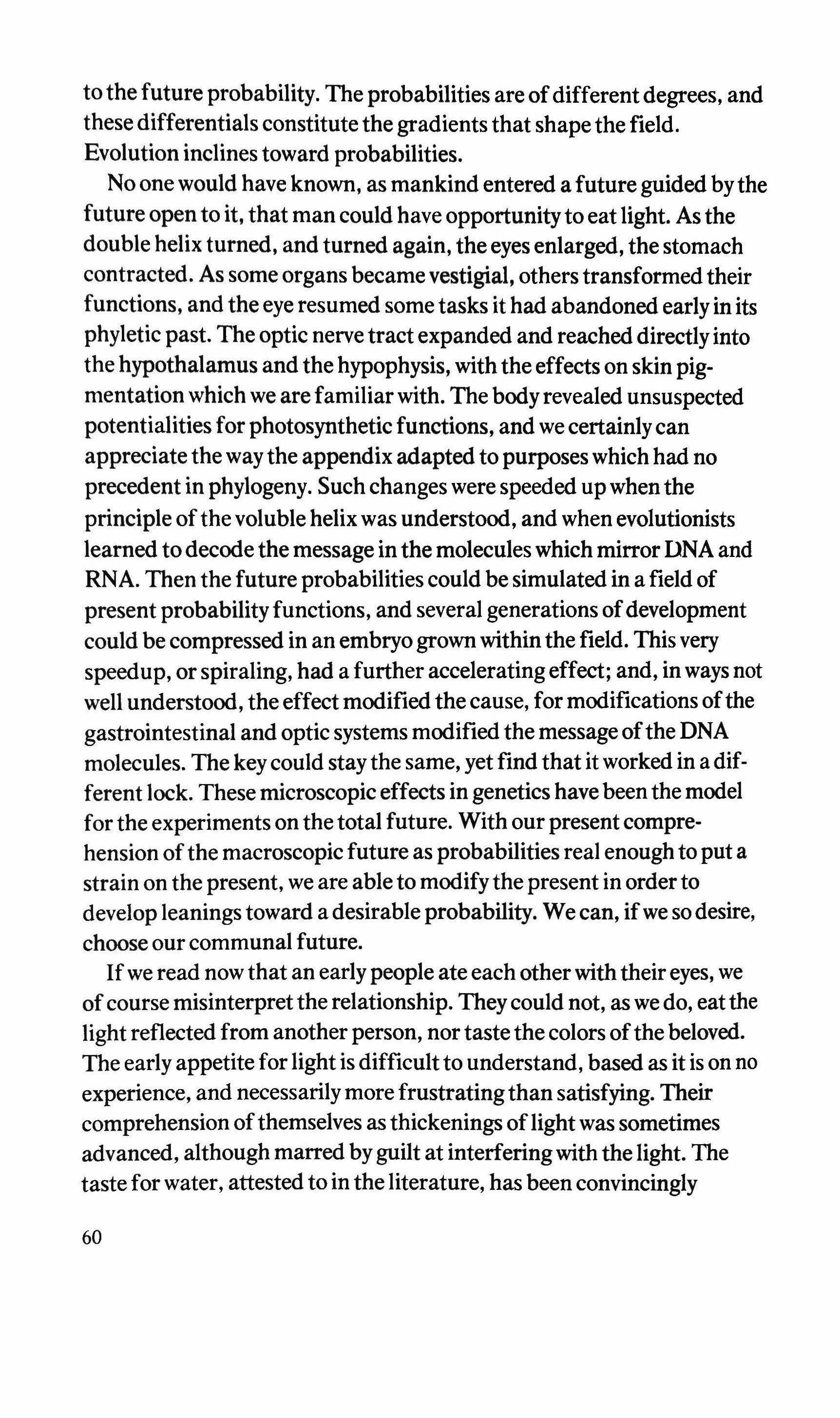 Man exists in a system beyond his control but not beyond his power to rearrange. The fall of man is neither a myth from pre.history nor an event at the beginning of human time. It Is a process that has been occurring for centuries, and It is not so much a fall into knowledge as into power-the power to work great changes in ourselves and our immediate environment, the power to destroy our planet in various ways, slowly or quickly, or to maintain it and our life upon it for some time. On various levels of activity, man's ability to exert his power in sell-destructive ways exceeds the ability of his feed-back systems to correct his behavior. The great failures of our government in recent years have been failures of imagination. What we need in all areas of life is more sensitive and vigorous feedback. The role of a properly structuralist imagination will of necessitybe futuristic.It will inform mankind of tbe consequences of actions not yet taken. But it must not merely inform, it must make us feel the consequences of those actions, feel them in our hearts and our viscera. The structuralist imagination must help us to live in the future so that we can indeed continue to live in the future. And this task, this great task, as it makes itself felt, will work its changes in the system of literature. New forms will arise, must arise, if man Is to continue.