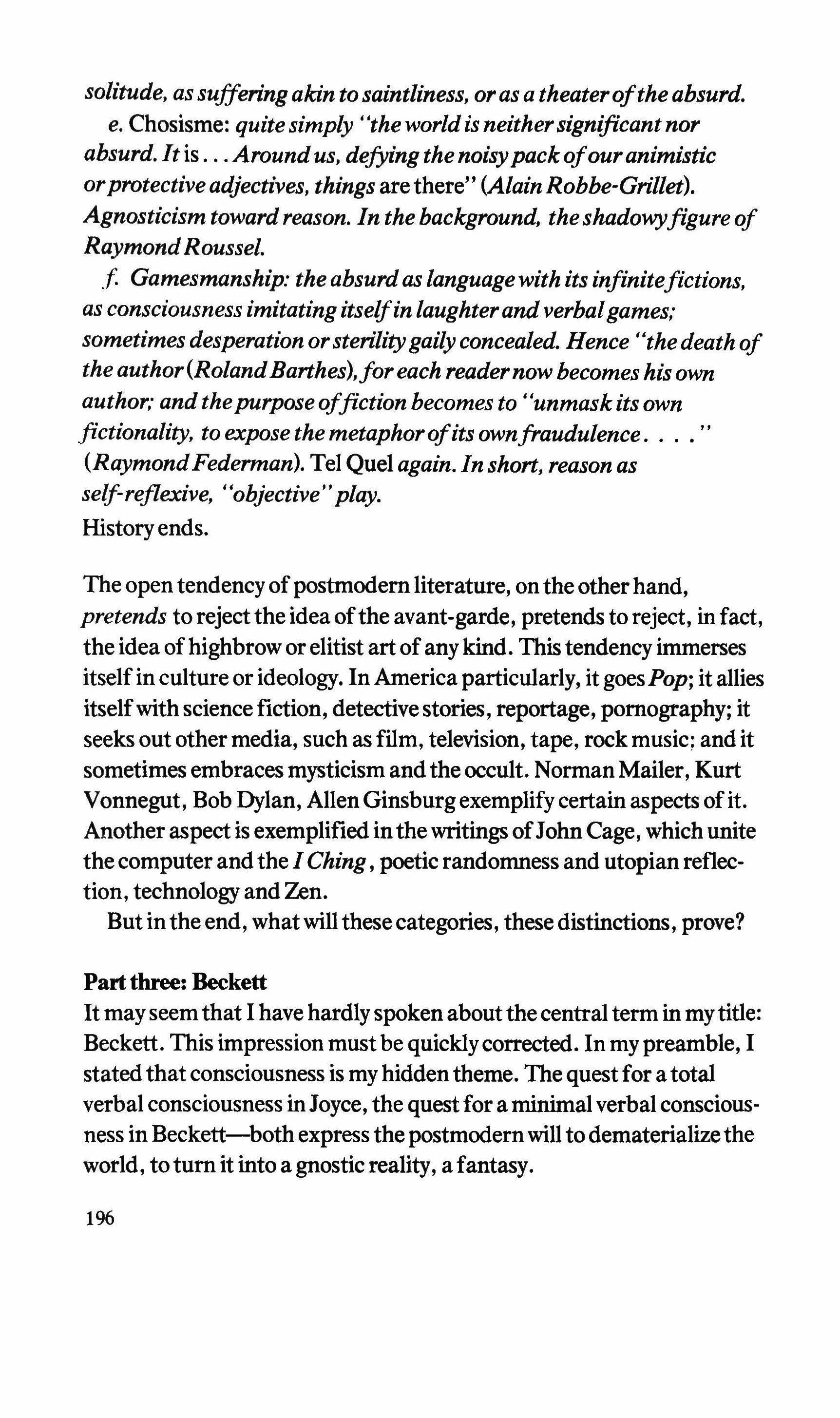 Some writers and critics have seen both sides ofthe fictional dilemma clearly. They know that reality can be neither captured nor escaped, and theirresponse has been to redefine the esthetic act itself and argue that all works ofthe imagination are plagiaristic. The acceptance ofthis view bywriters leads to the production ofwhat has been called selfreflectivefiction, or metafiction-a fiction which, if it is "about" anything, is about the possibilities and impossibilities offiction itself, as in works like Barth'sLost in theFunhouseor Gass's WillieMasters' Lonesome Wife. It also leads to the production ofwhat might be called anticriticism-acriticism which denies the traditional critical imperativeswithout quite acceptingthe responsibilities offiction. This anticriticism is widelypracticed at present by such formidablefigures as Susan Sontag and Ihab Hassan, as well as a host of lesser folk. It often involves a good deal ofcutting and pasting, which is the critic's timid version ofthe writer's bold plagiarism. What we have here is a classic case ofloss offaith attended by abnegation ofresponsibilities. Everyone is expressinghimselfbycopying everyone else, and, naturally, no one is listening. Nor is this situation to be dealt with by a few brisk exhortations. It is a philosophical problem