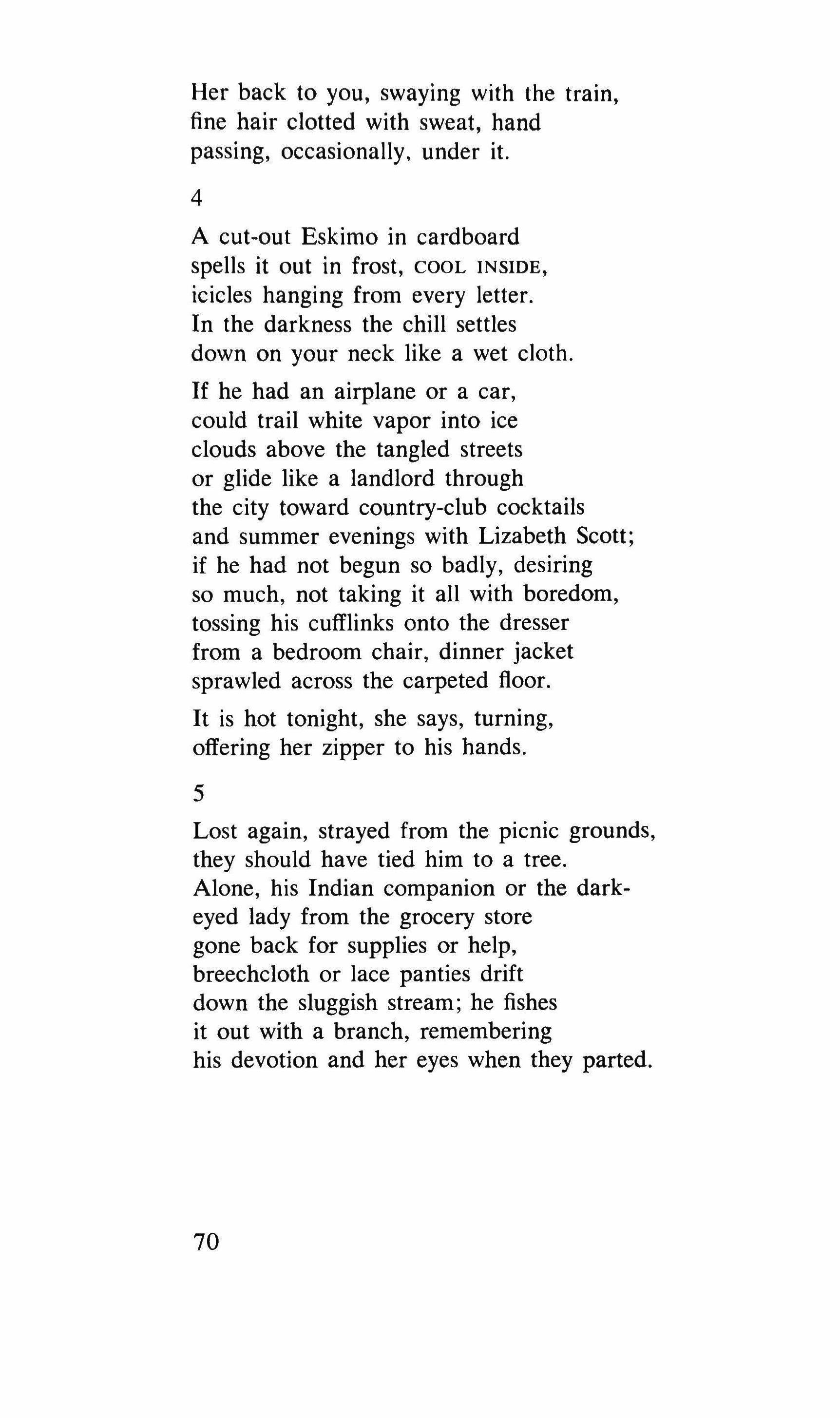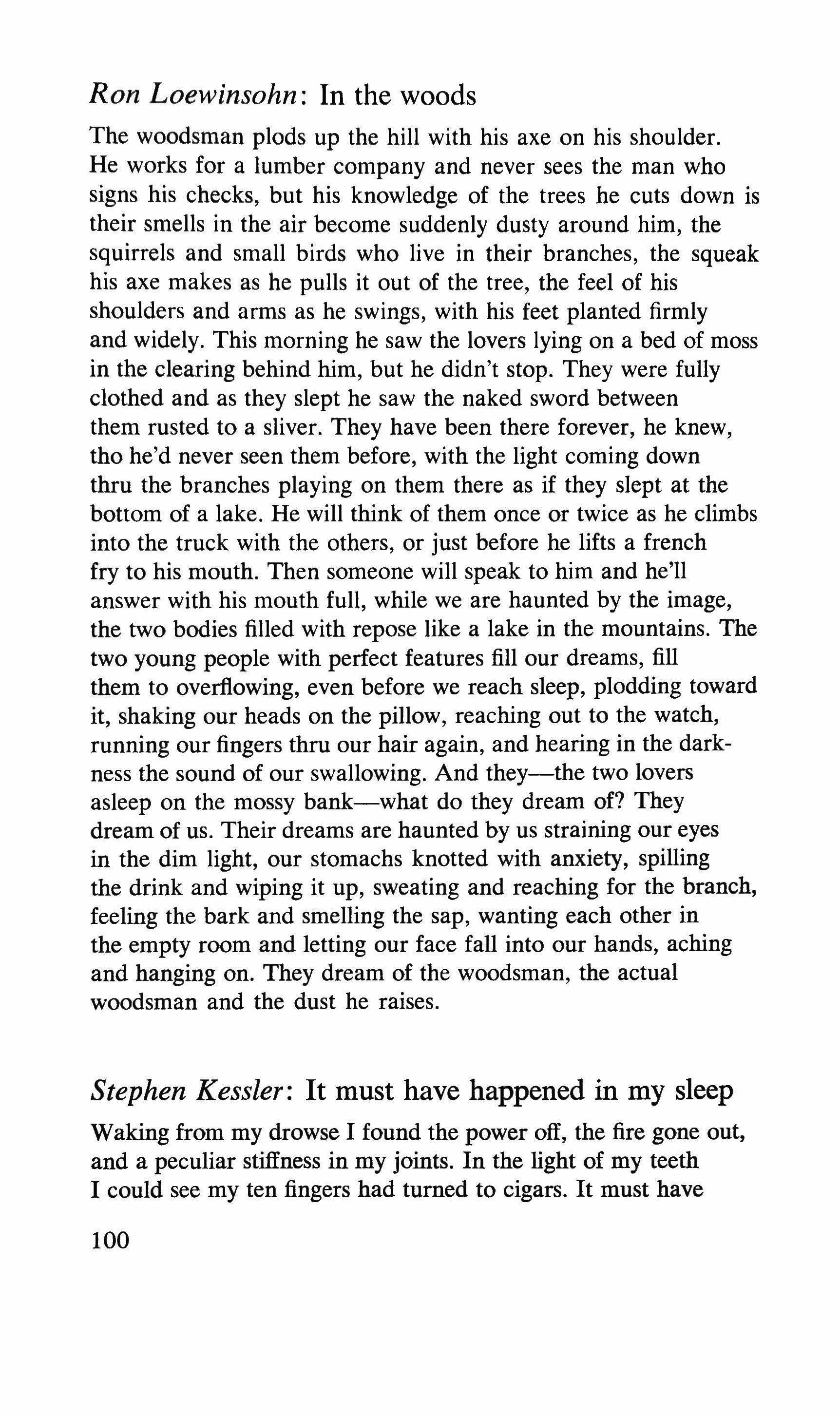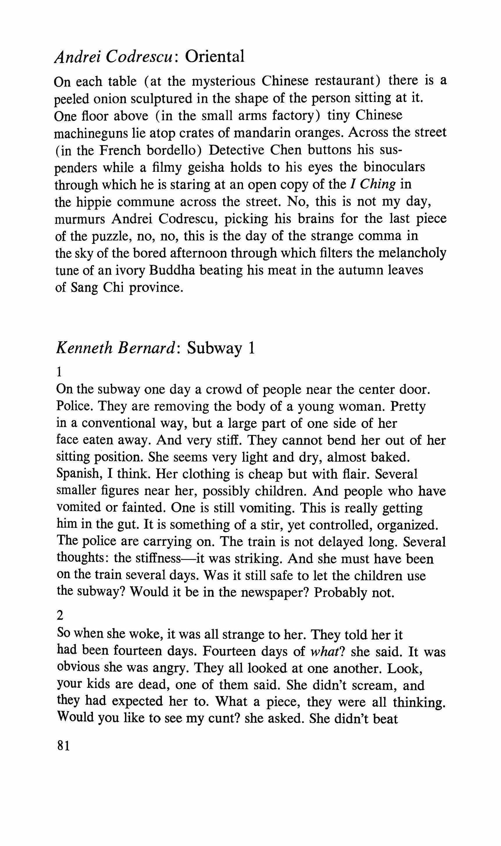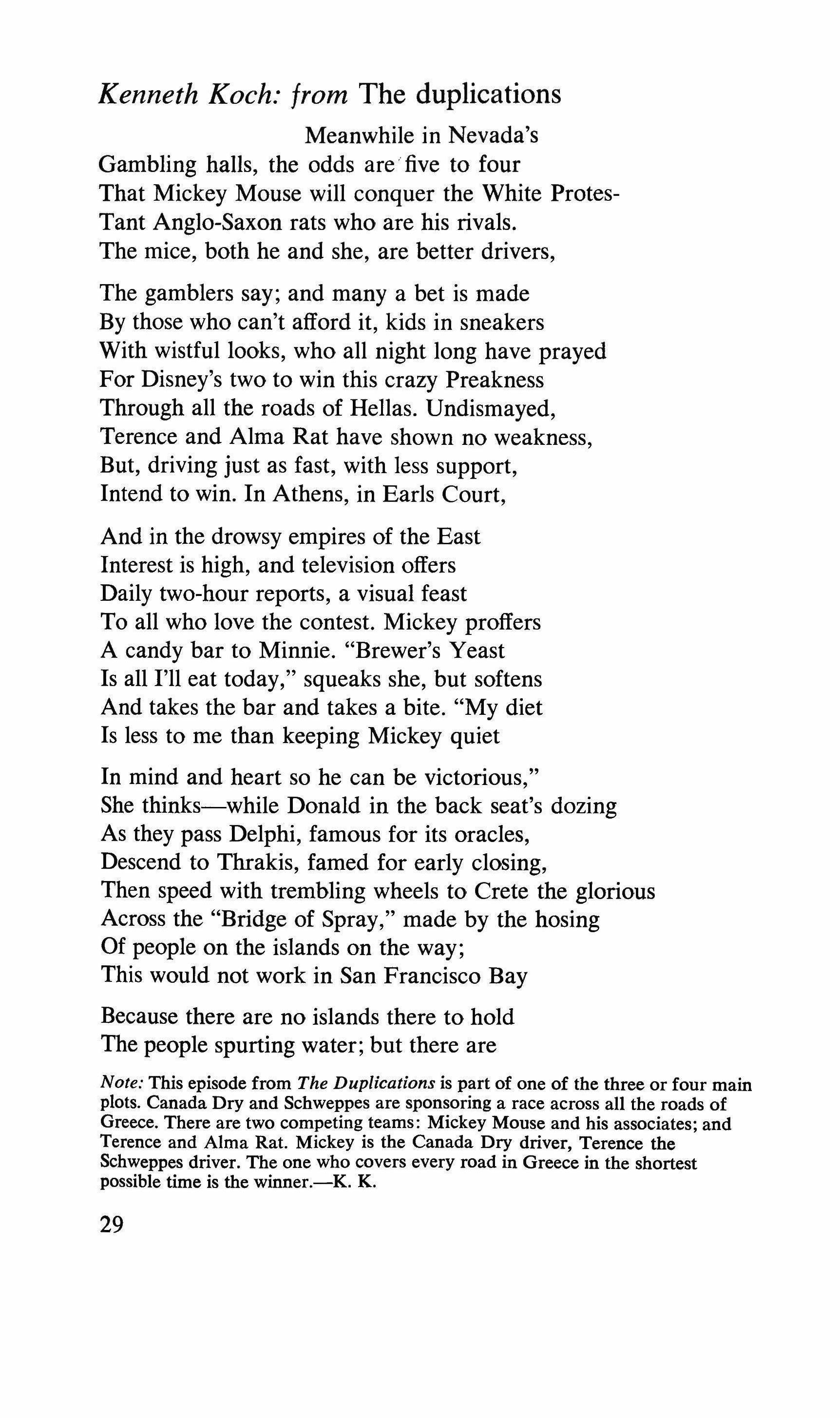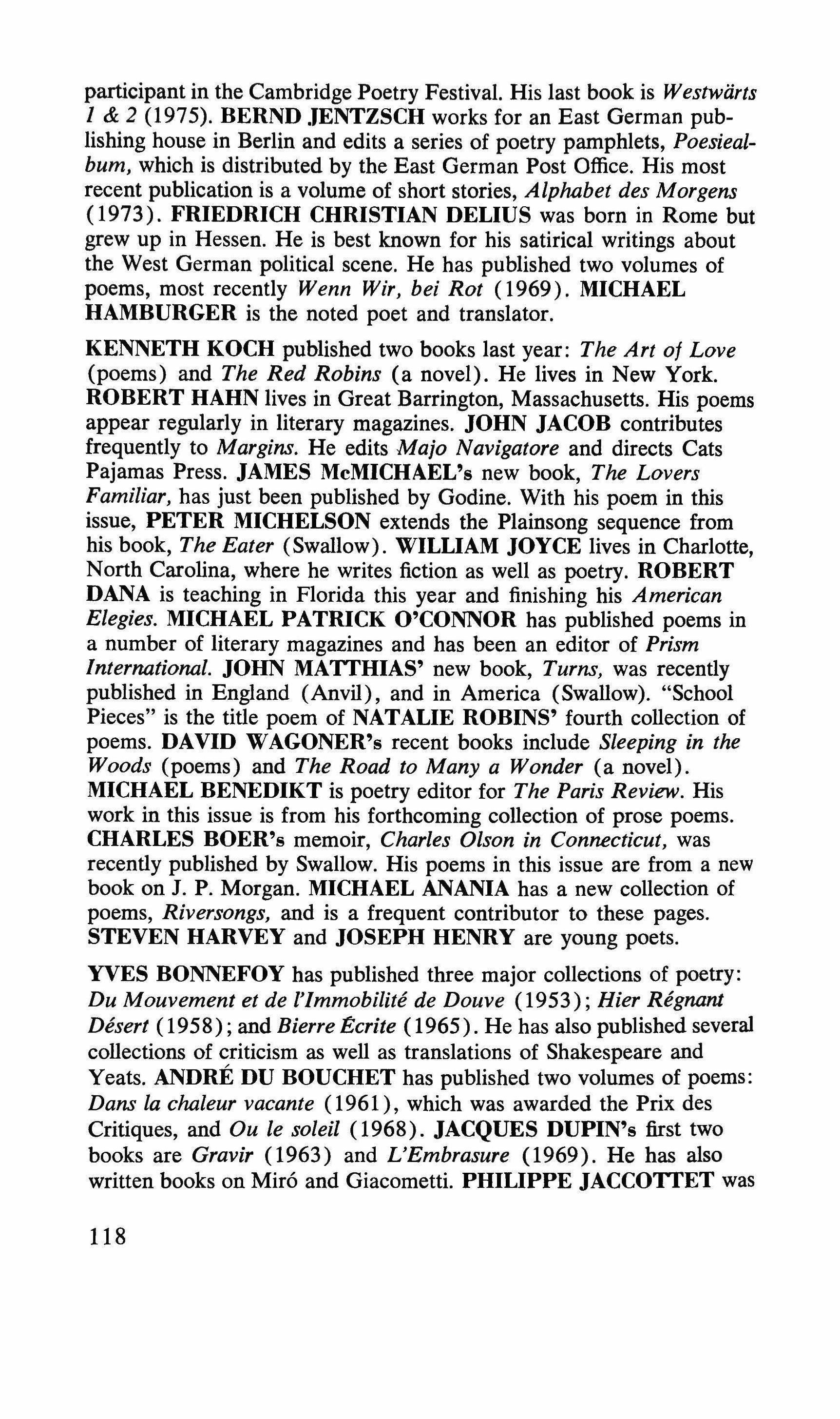 KENNETH KOCH published two books last year: The Art of Love (poems) and The Red Robins (a novel). He lives in New York. ROBERT HAHN lives in Great Barrington, Massachusetts. His poems appear regularly in literary magazines. JOHN JACOB contributes frequently to Margins. He edits Majo Navigatore and directs Cats Pajamas Press. JAMES McMICHAEL's new book, The Lovers Familiar, has just been published by Godine. With his poem in this issue, PETER MICHELSON extends the Plainsong sequence from his book, The Eater (Swallow). WILLIAM JOYCE lives in Charlotte, North Carolina, where he writes fiction as well as poetry. ROBERT DANA is teaching in Florida this year and finishing his American Elegies. MICHAEL PATRICK O'CONNOR has published poems in a number of literary magazines and has been an editor of Prism International. JOHN MATTHIAS' new book, Turns, was recently published in England (Anvil), and in America (Swallow). "School Pieces" is the title poem of NATALIE ROBINS' fourth collection of poems. DAVID WAGONER's recent books include Sleeping in the Woods (poems) and The Road to Many a Wonder (a novel).