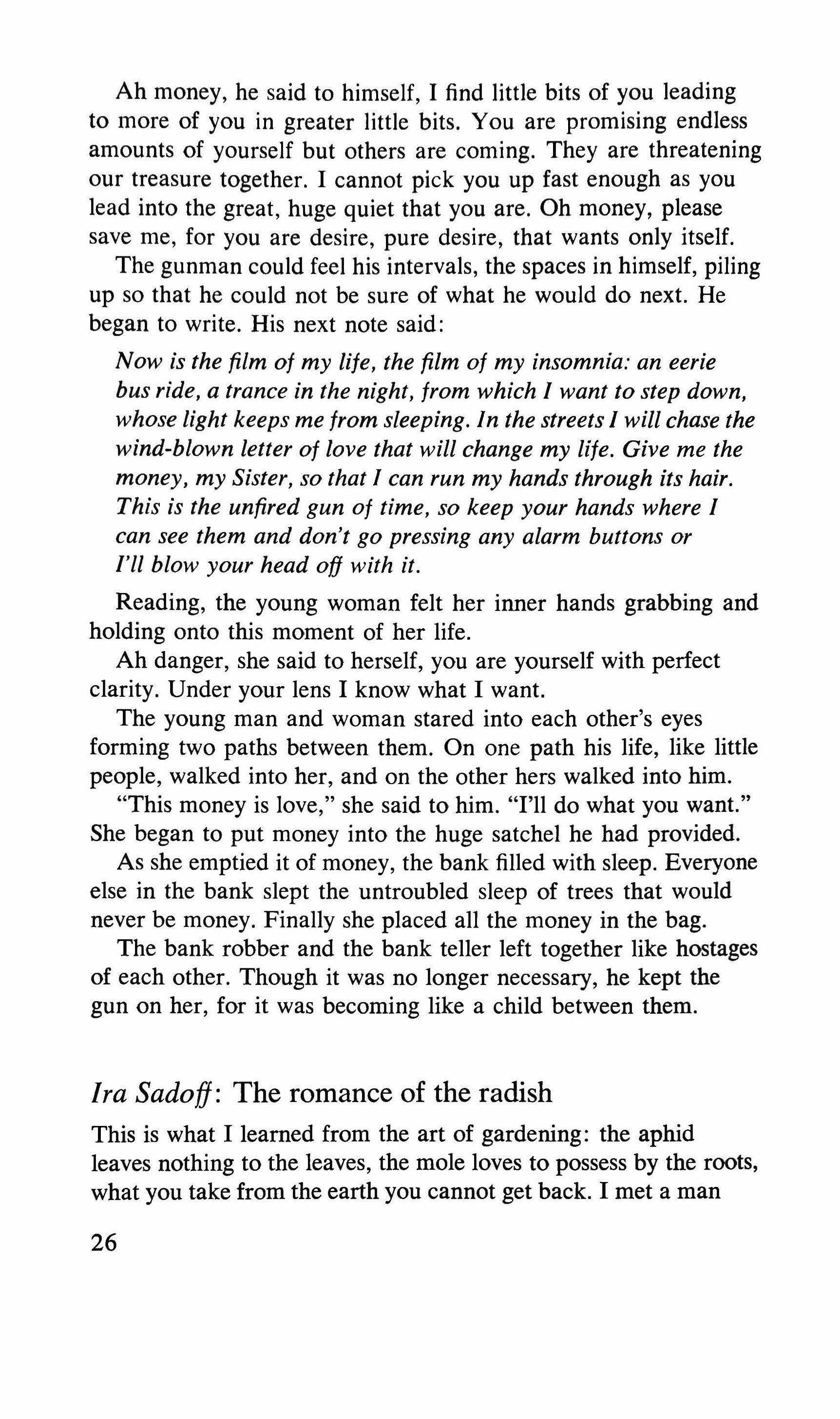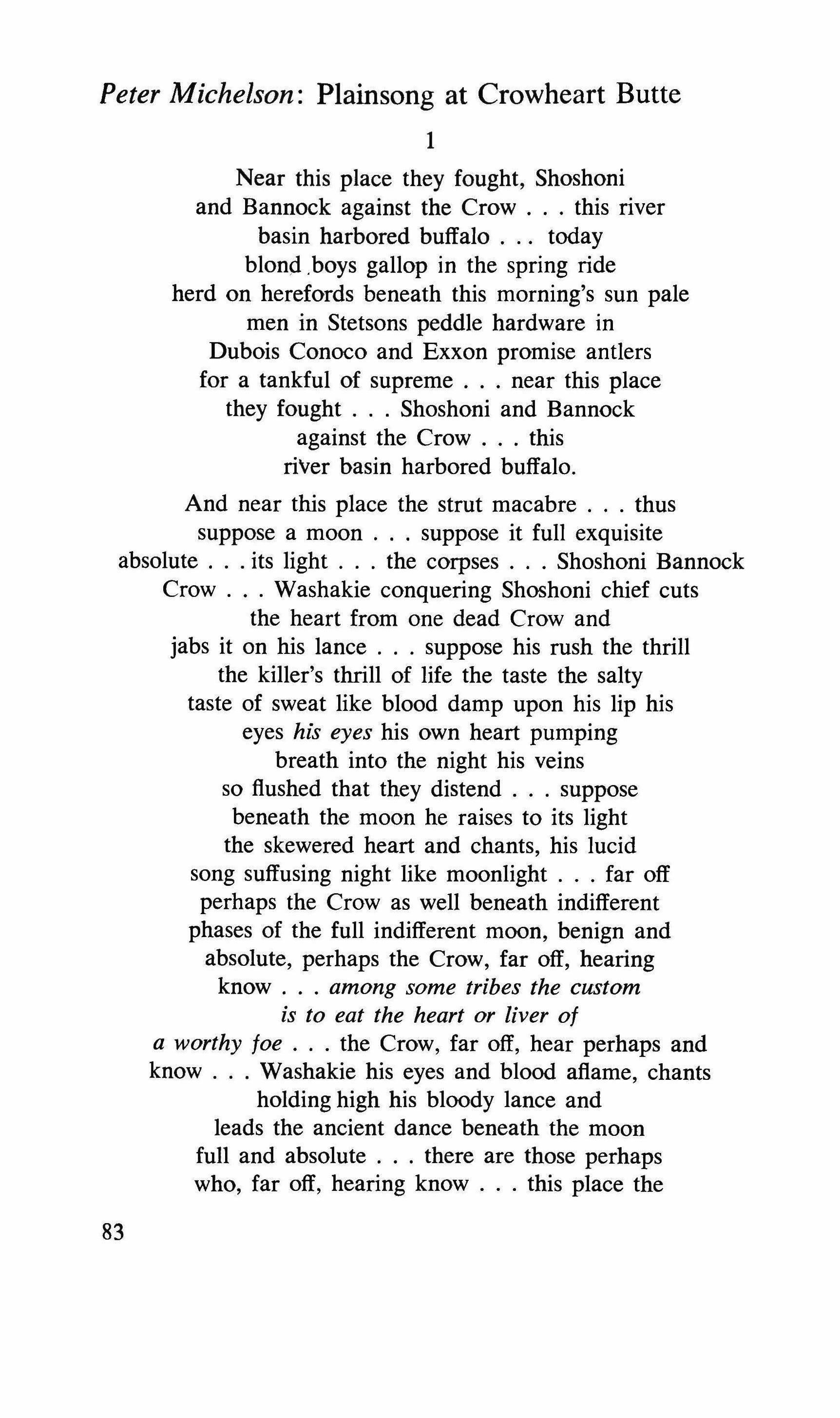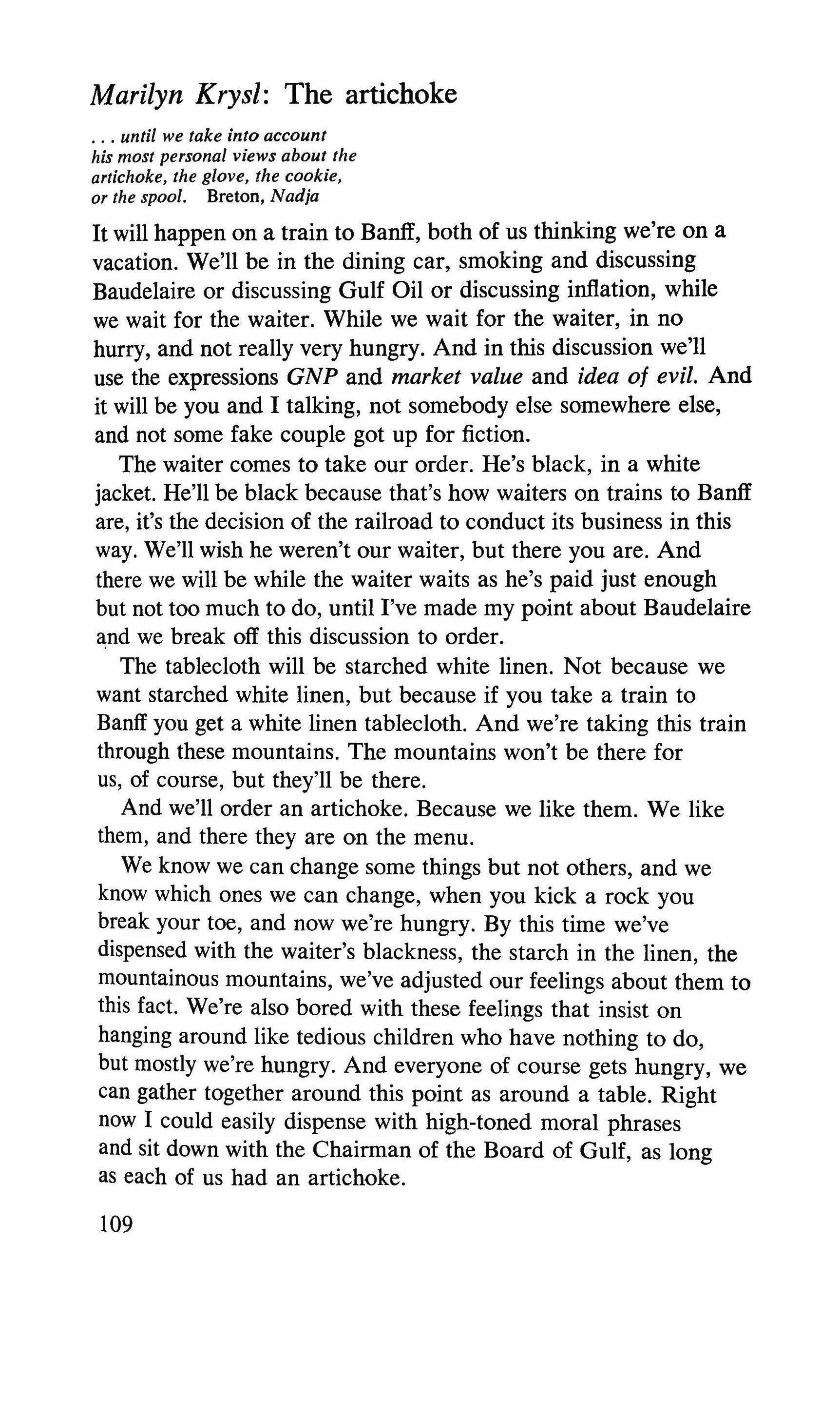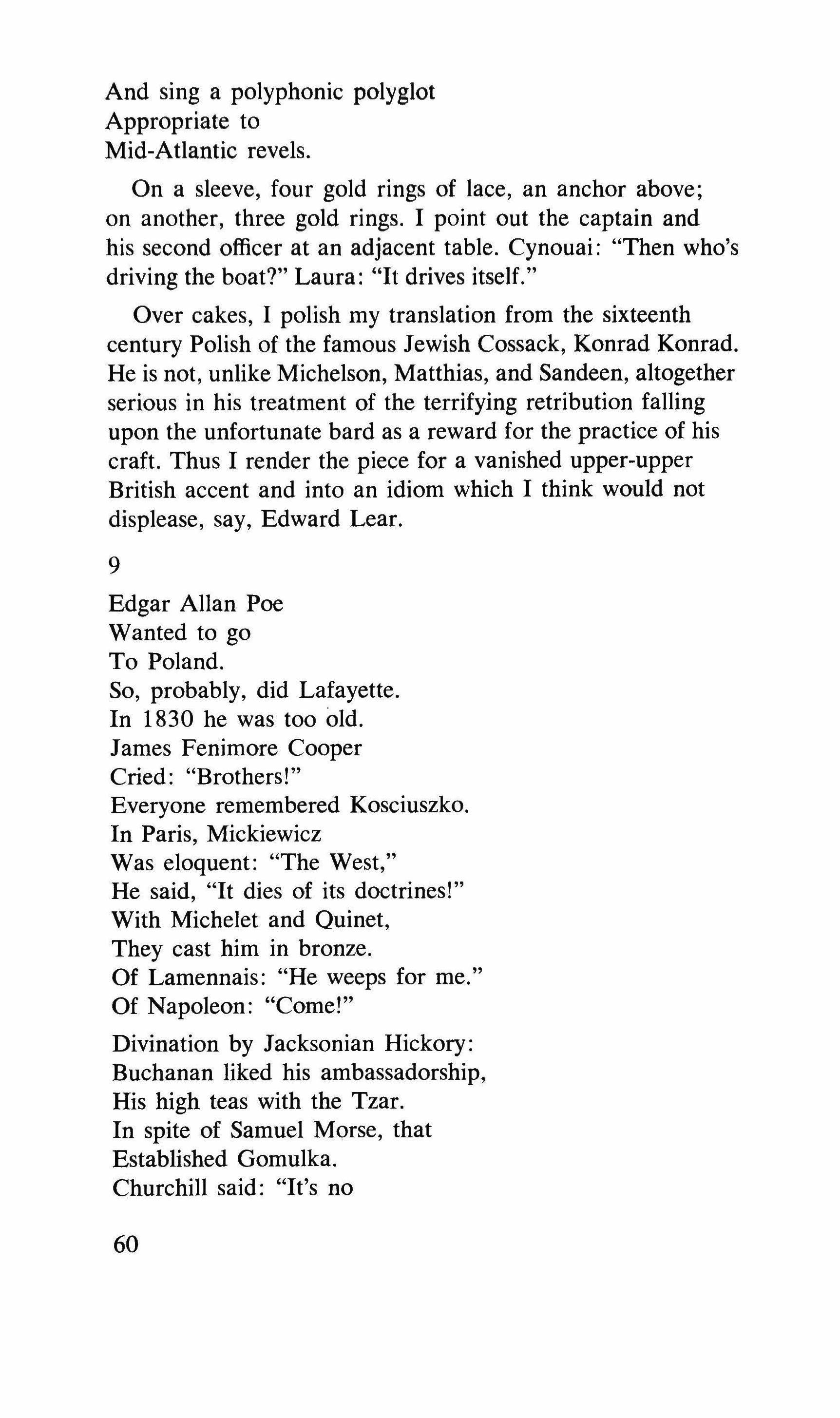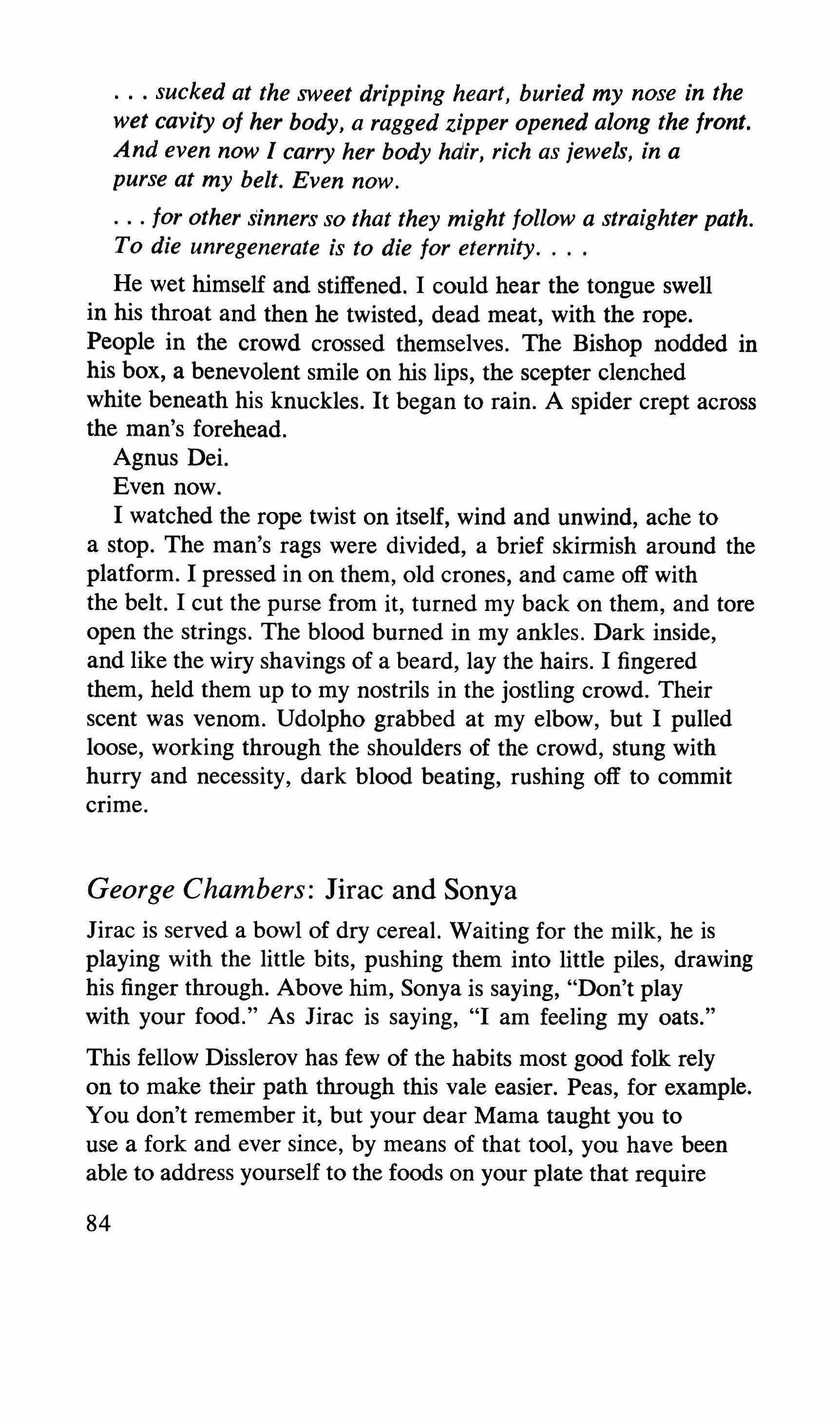 KENNETH KOCH published two books last year: The Art of Love (poems) and The Red Robins (a novel). He lives in New York. ROBERT HAHN lives in Great Barrington, Massachusetts. His poems appear regularly in literary magazines. JOHN JACOB contributes frequently to Margins. He edits Majo Navigatore and directs Cats Pajamas Press. JAMES McMICHAEL's new book, The Lovers Familiar, has just been published by Godine. With his poem in this issue, PETER MICHELSON extends the Plainsong sequence from his book, The Eater (Swallow). WILLIAM JOYCE lives in Charlotte, North Carolina, where he writes fiction as well as poetry. ROBERT DANA is teaching in Florida this year and finishing his American Elegies. MICHAEL PATRICK O'CONNOR has published poems in a number of literary magazines and has been an editor of Prism International. JOHN MATTHIAS' new book, Turns, was recently published in England (Anvil), and in America (Swallow). "School Pieces" is the title poem of NATALIE ROBINS' fourth collection of poems. DAVID WAGONER's recent books include Sleeping in the Woods (poems) and The Road to Many a Wonder (a novel).
