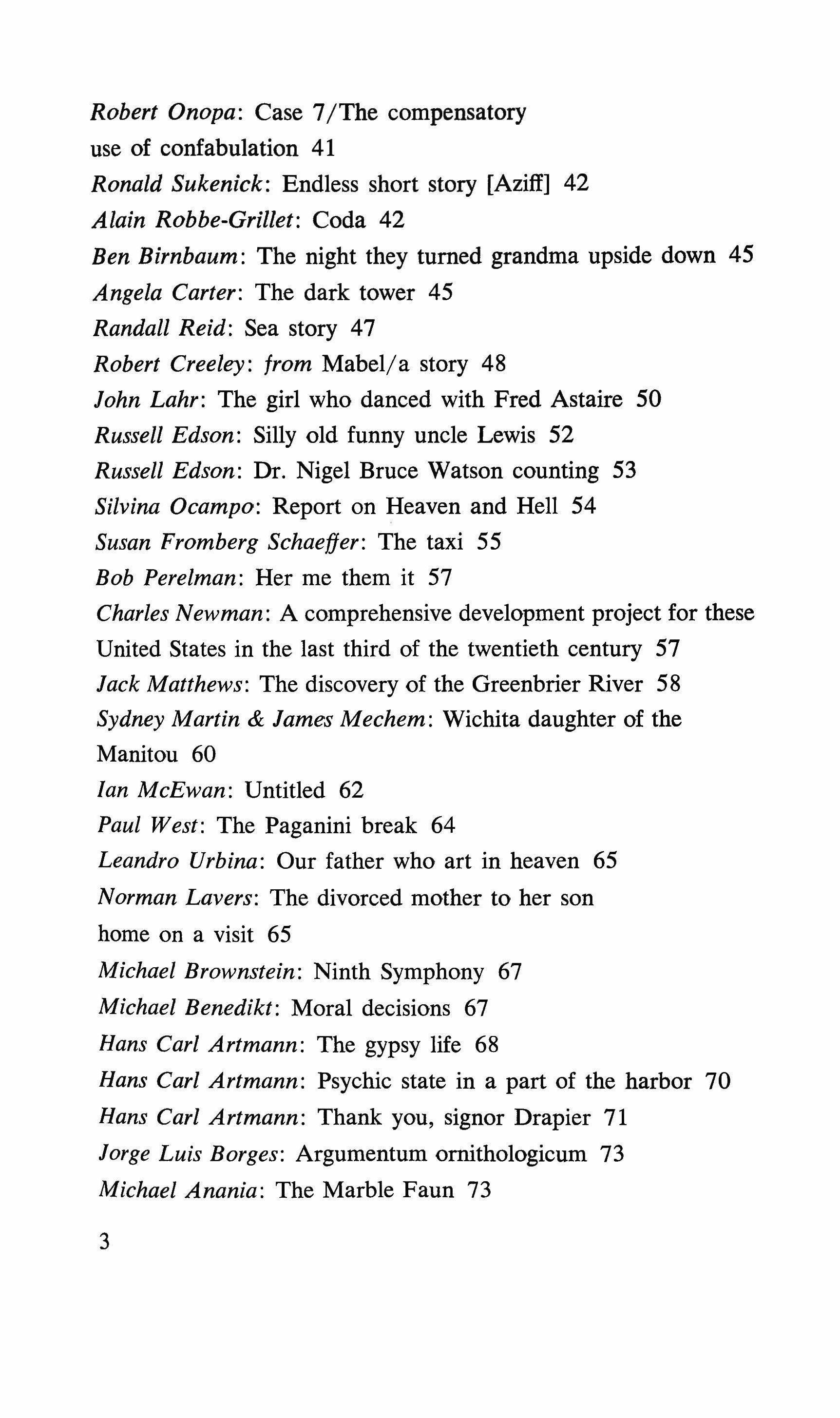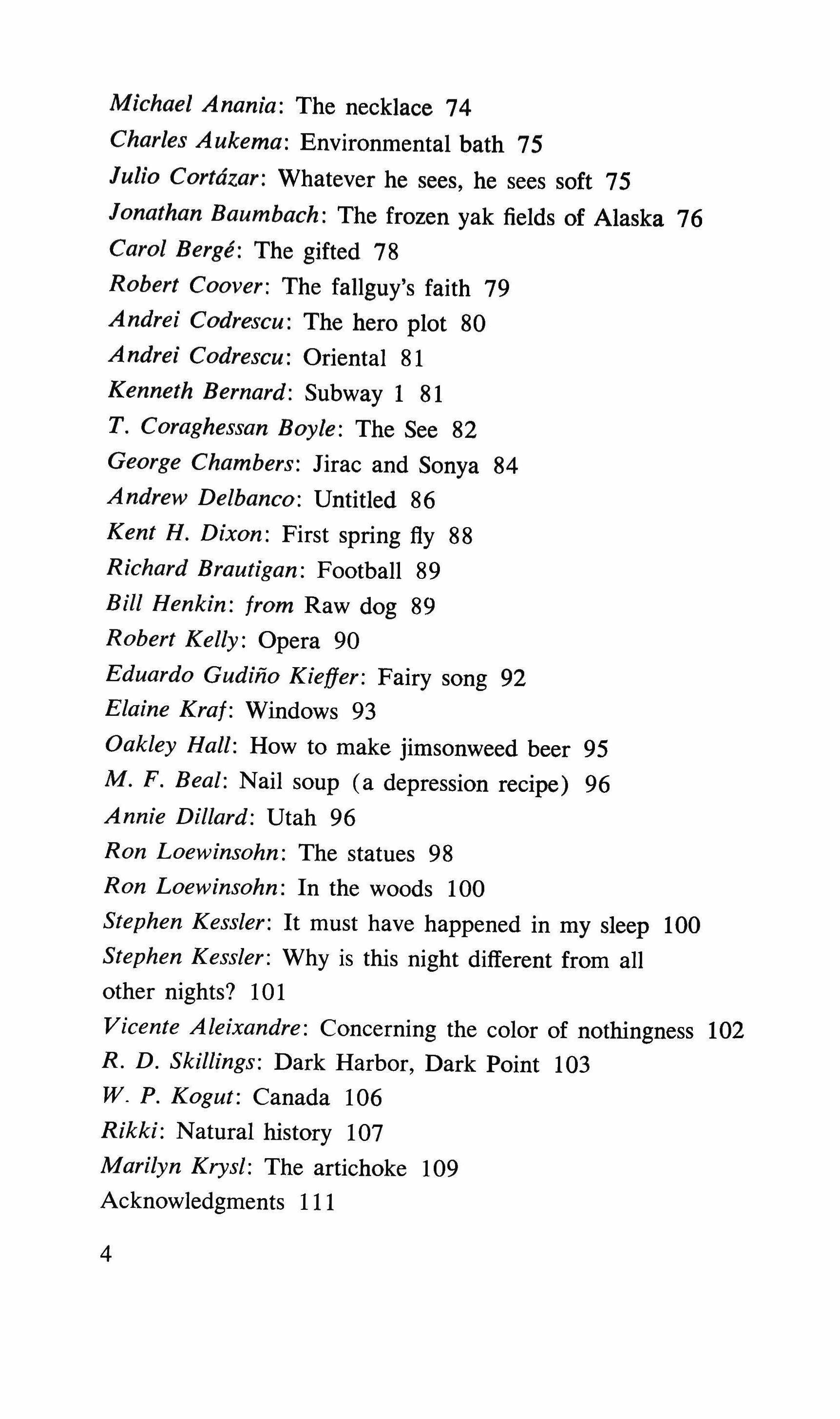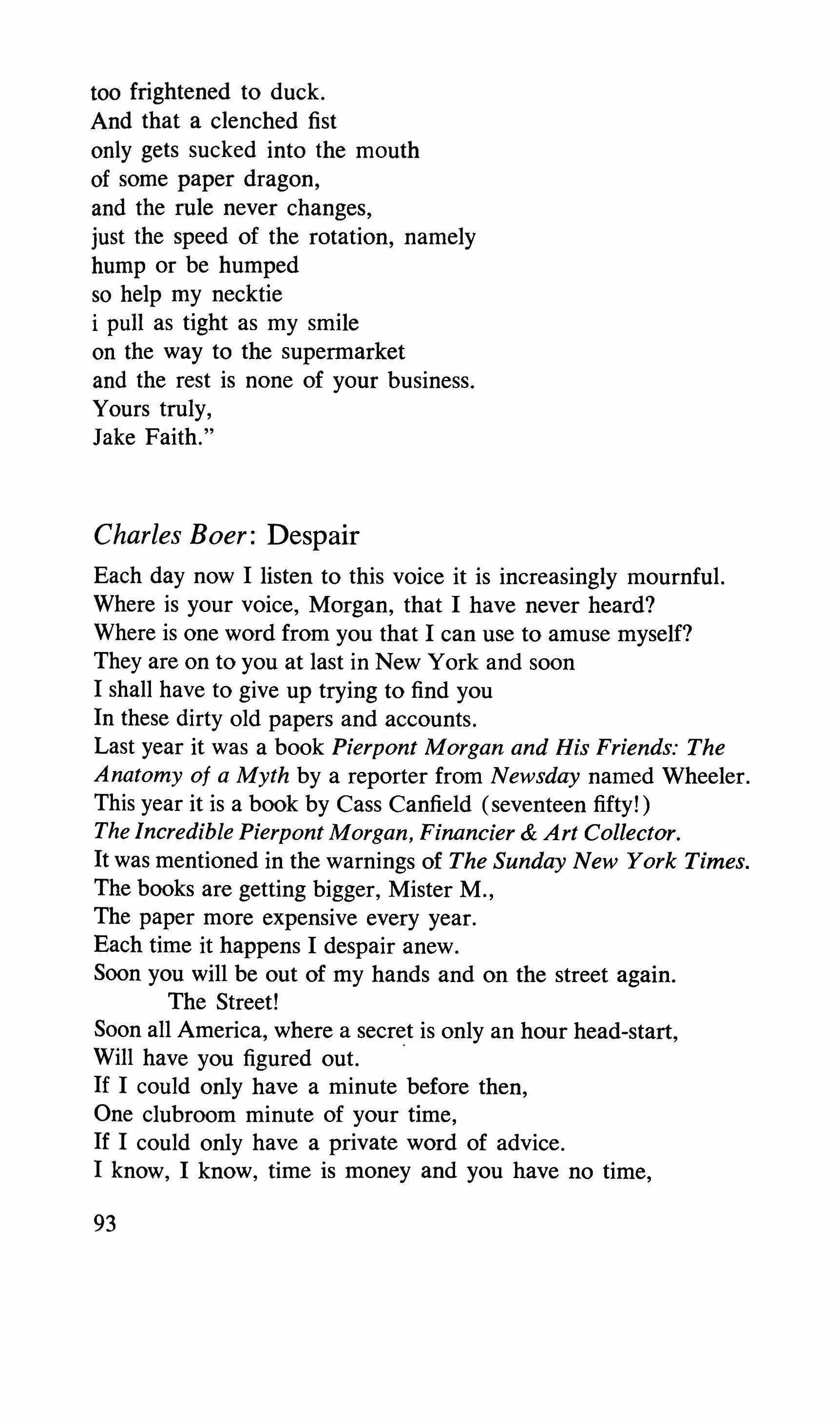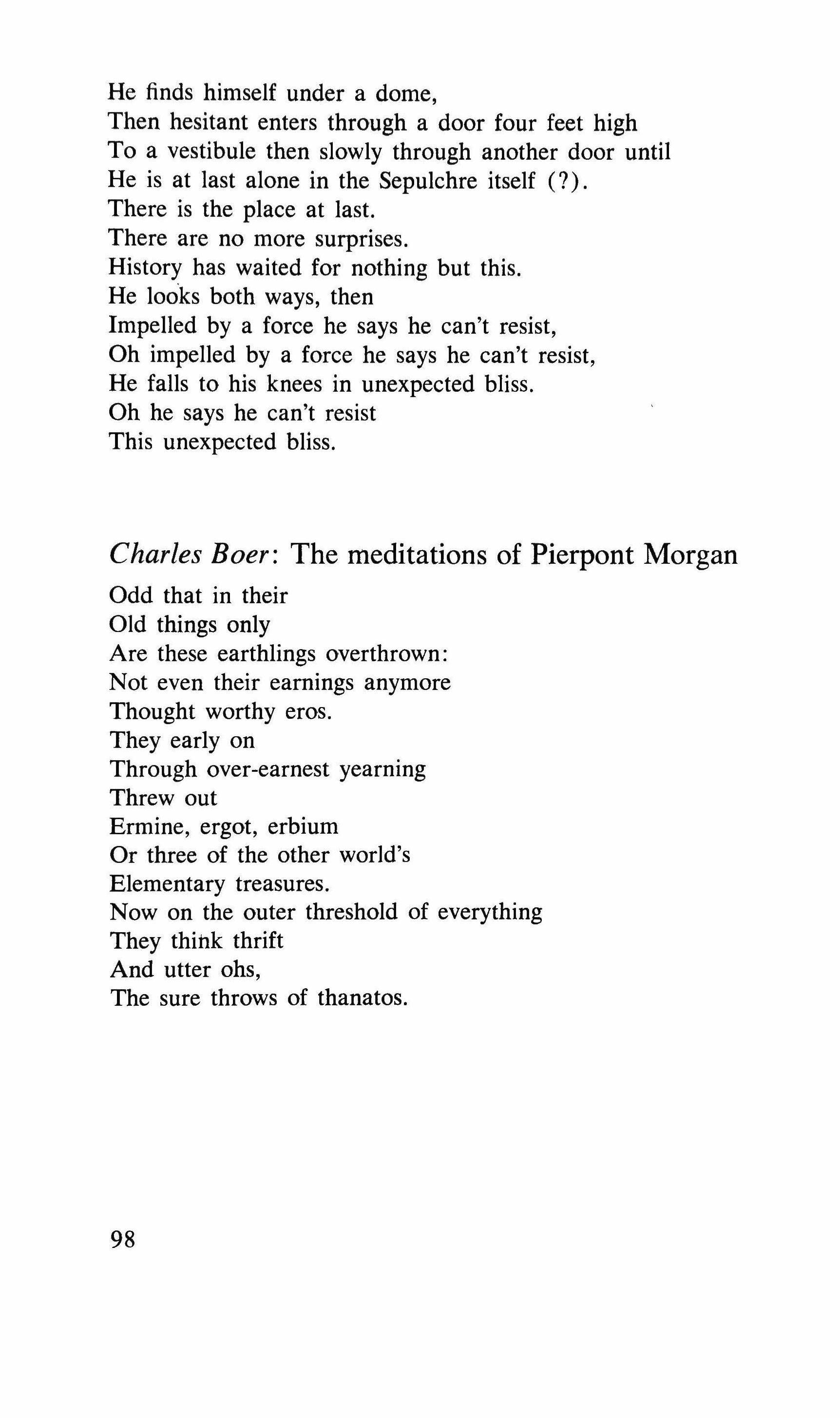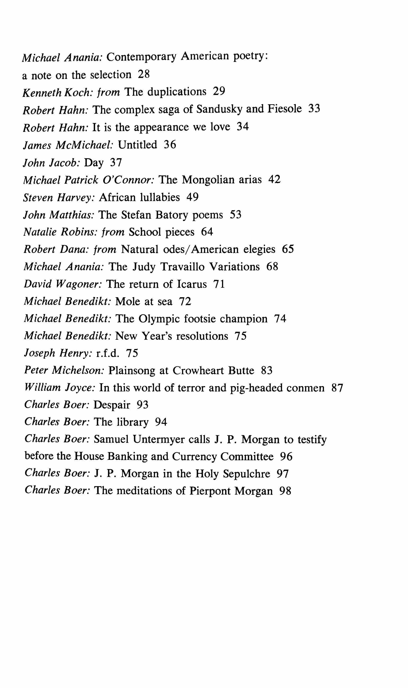 MICHAEL BENEDIKT is poetry editor for The Paris Review. His work in this issue is from his forthcoming collection of prose poems. CHARLES BOER's memoir, Charles Olson in Connecticut, was recently published by Swallow. His poems in this issue are from a new book on J. P. Morgan. MICHAEL ANANIA has a new collection of poems, Riversongs, and is a frequent contributor to these pages. STEVEN HARVEY and JOSEPH HENRY are young poets.