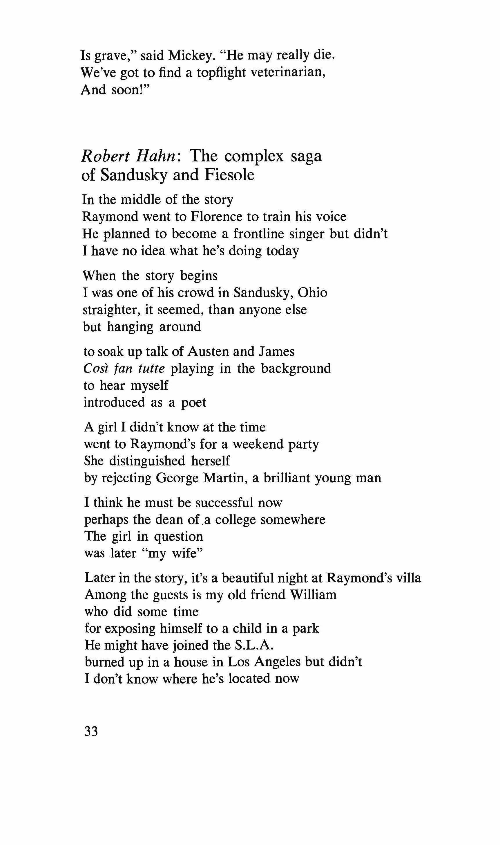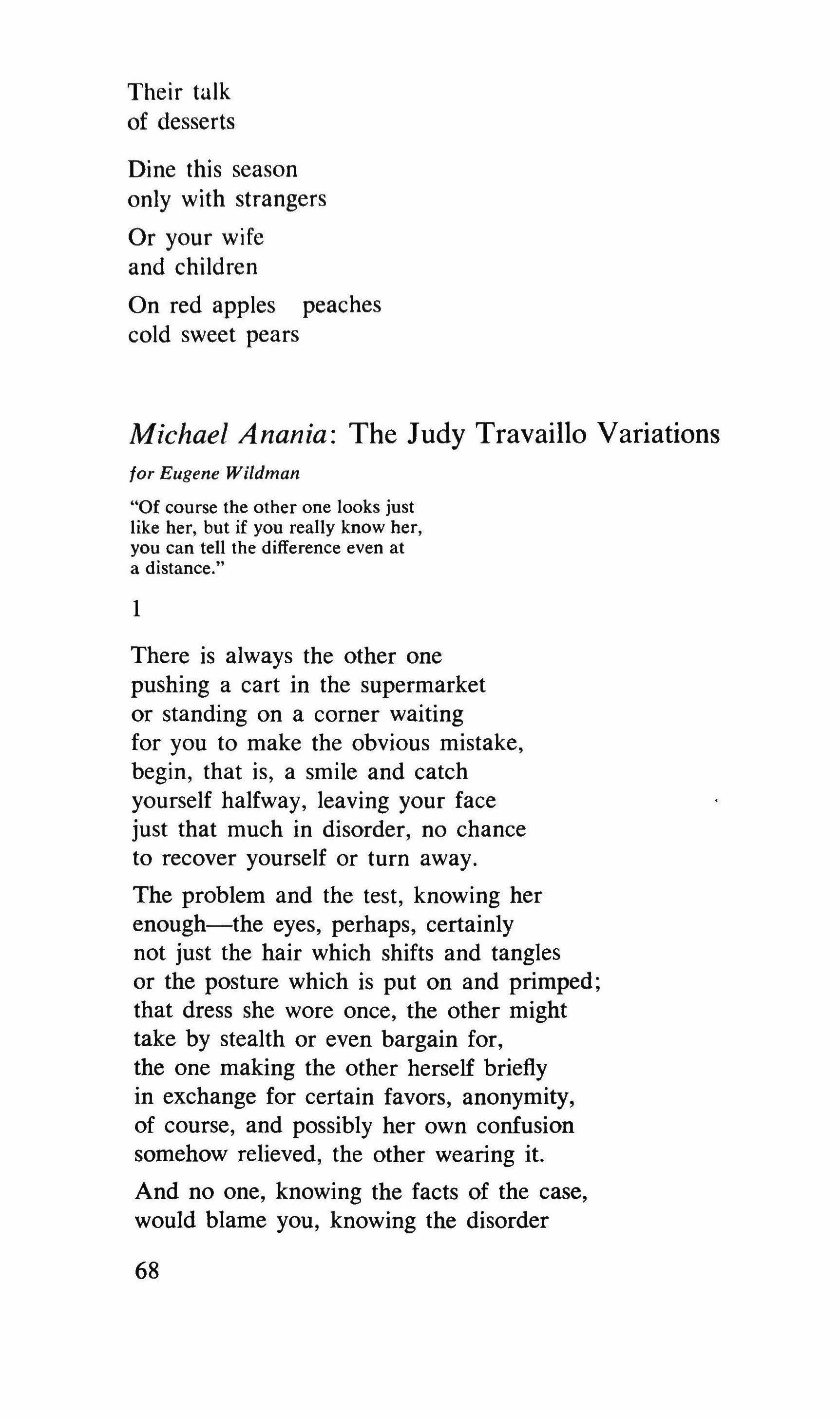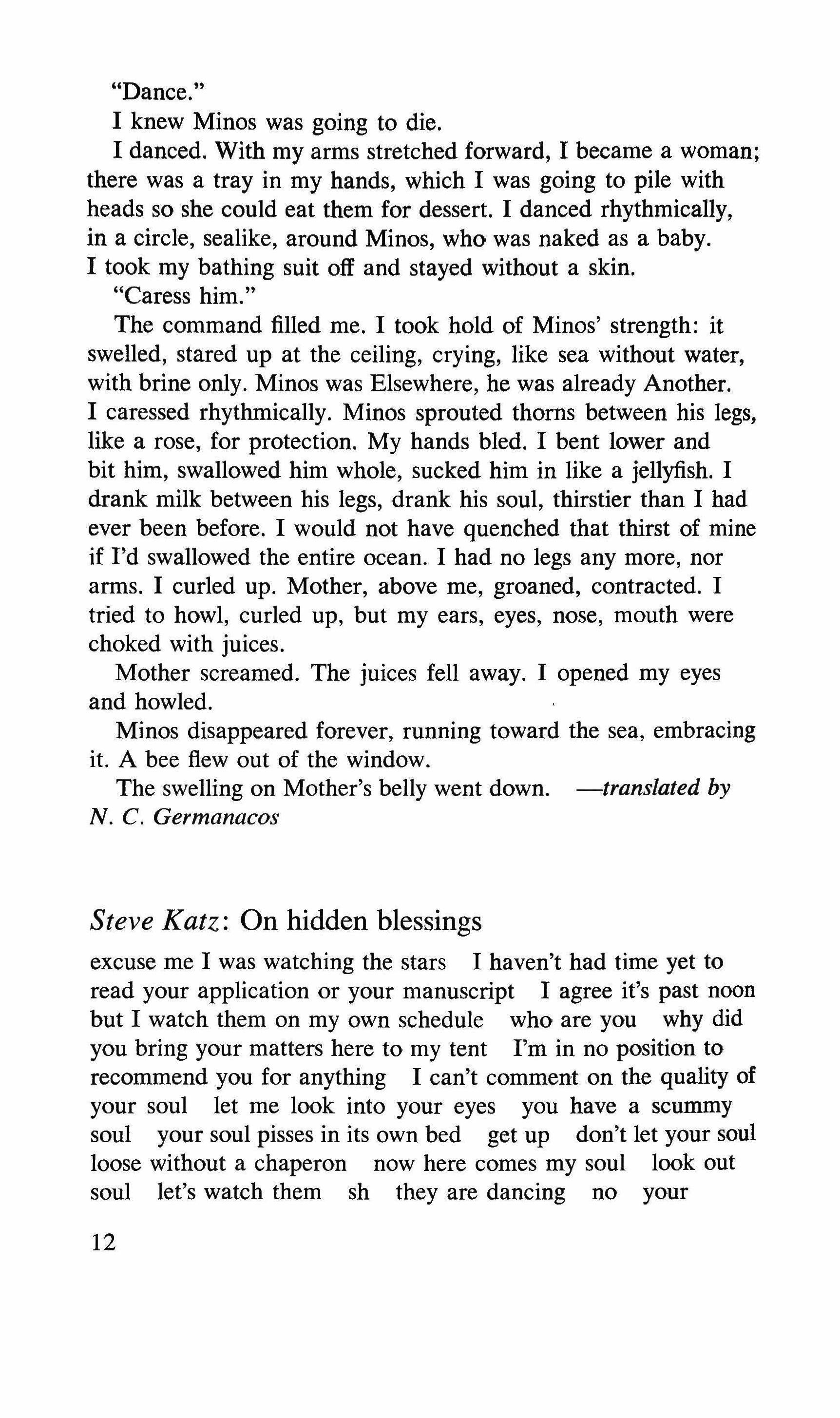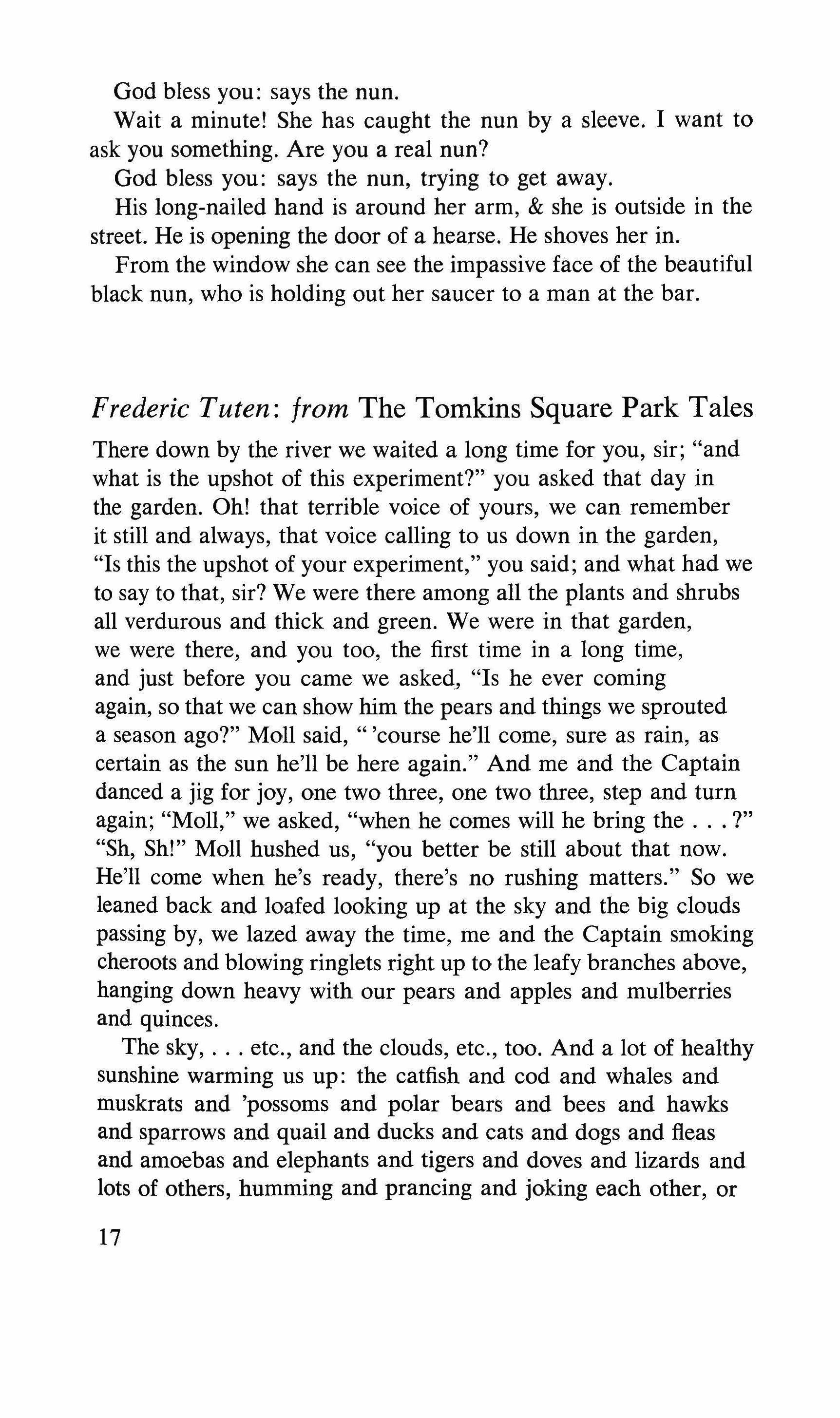 MICHAEL BENEDIKT is poetry editor for The Paris Review. His work in this issue is from his forthcoming collection of prose poems. CHARLES BOER's memoir, Charles Olson in Connecticut, was recently published by Swallow. His poems in this issue are from a new book on J. P. Morgan. MICHAEL ANANIA has a new collection of poems, Riversongs, and is a frequent contributor to these pages. STEVEN HARVEY and JOSEPH HENRY are young poets.