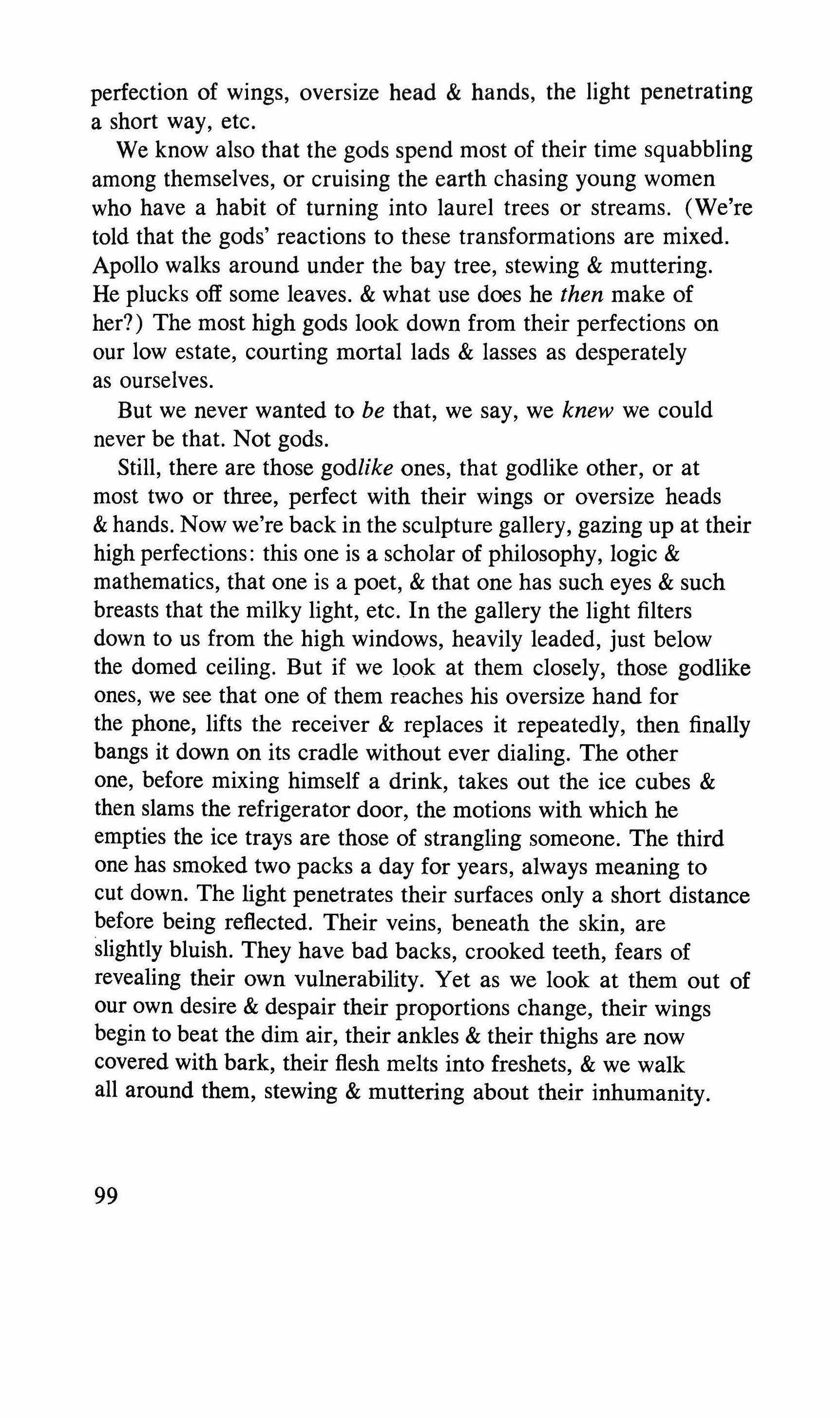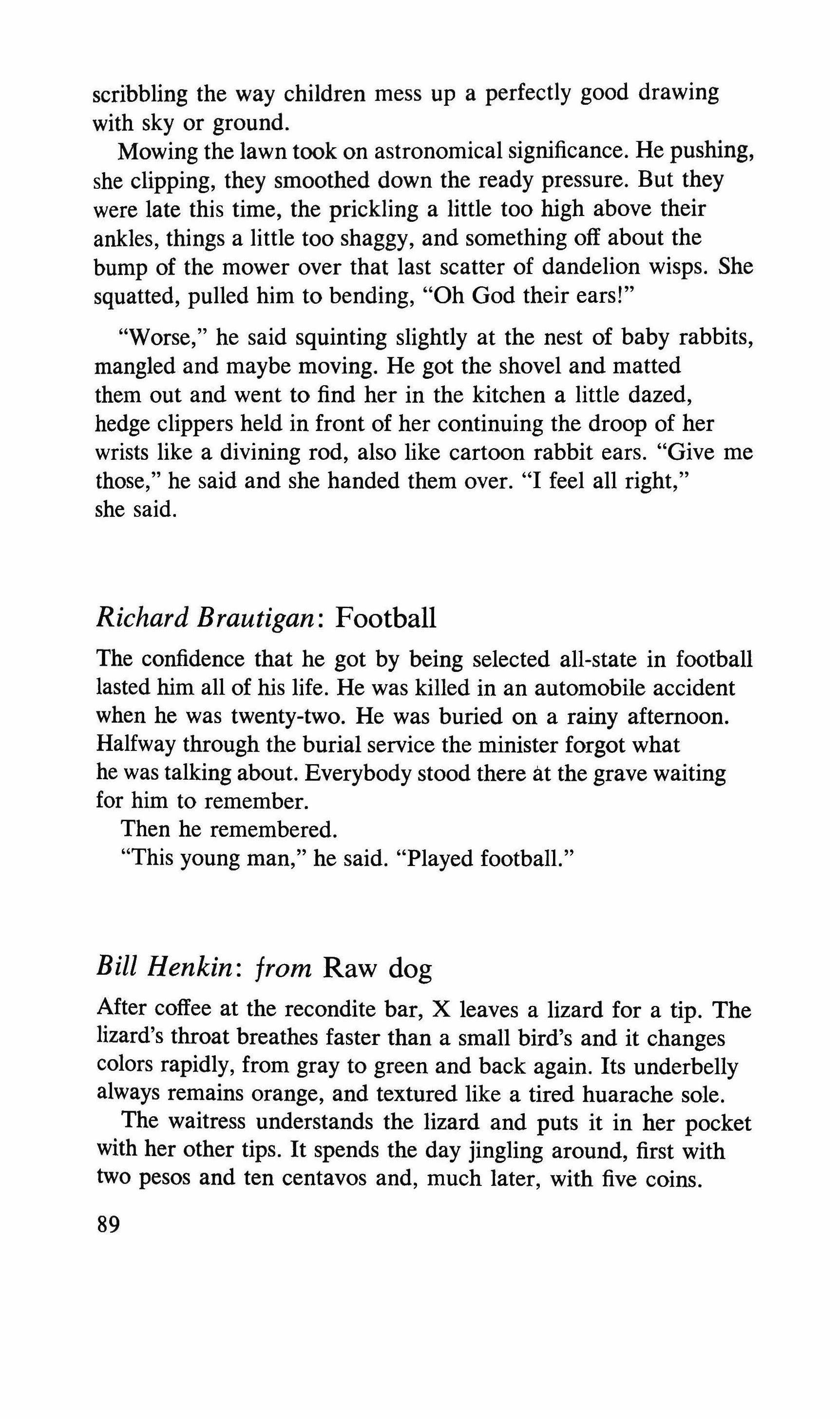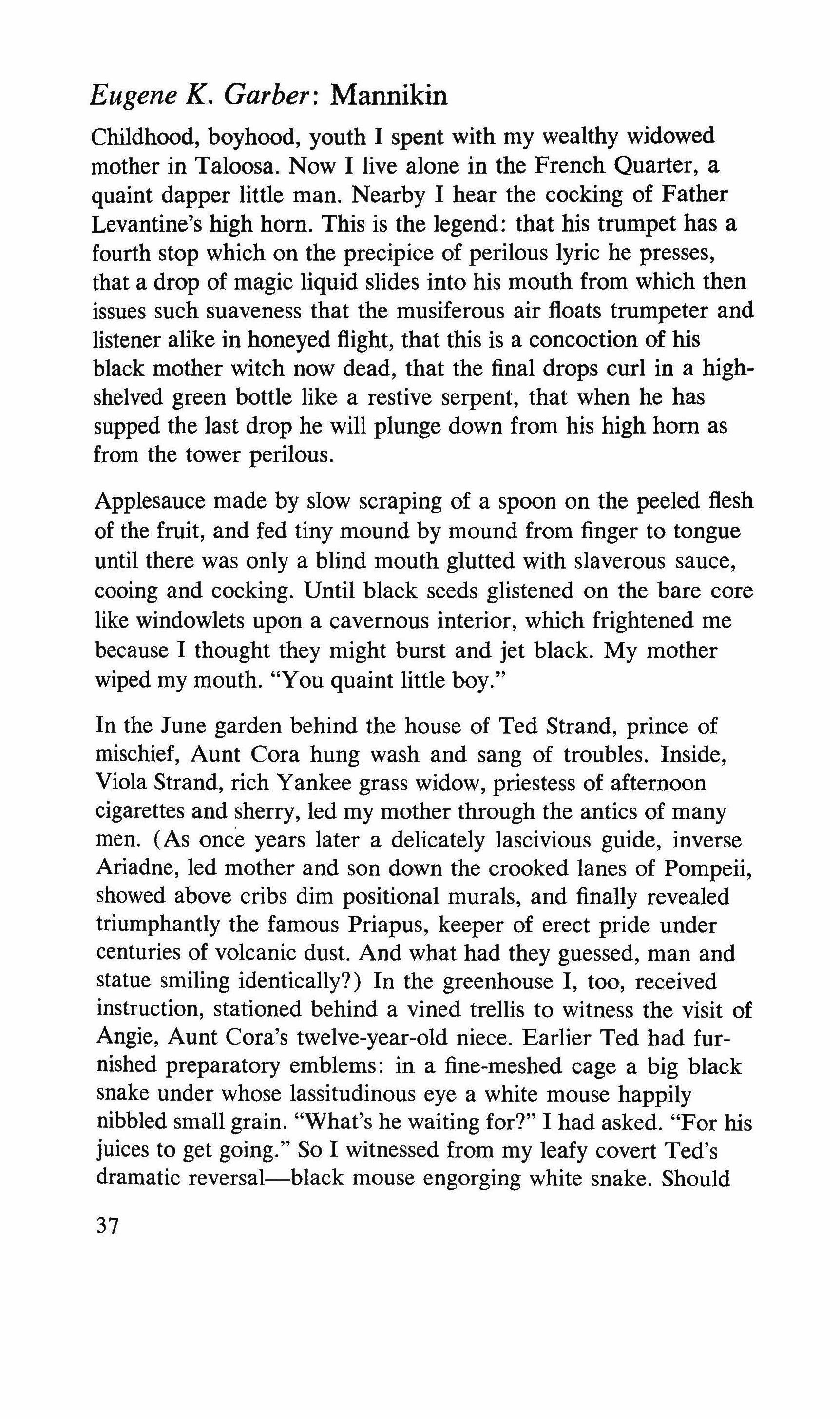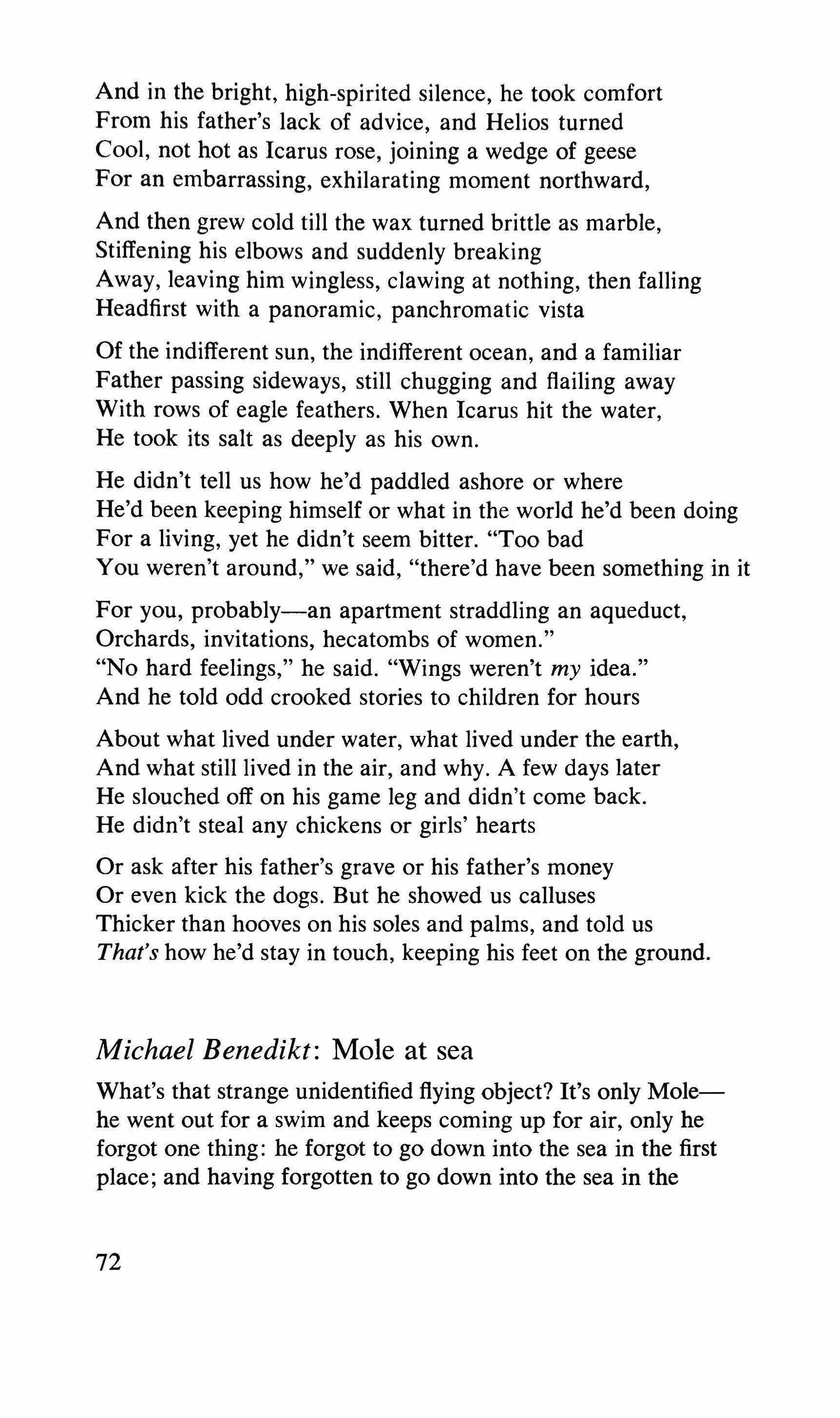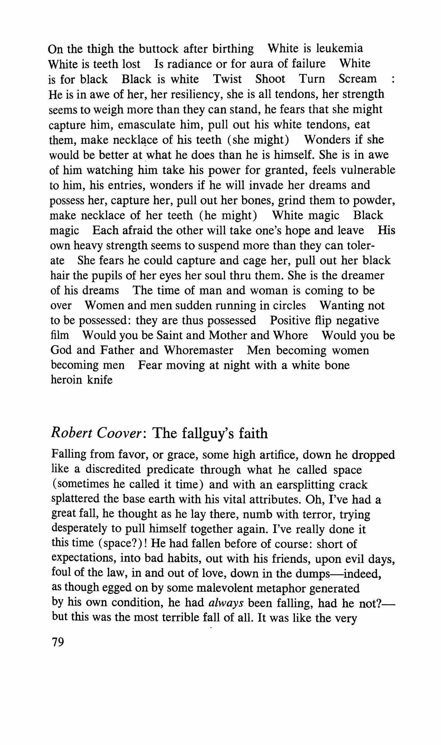 MICHAEL BENEDIKT is poetry editor for The Paris Review. His work in this issue is from his forthcoming collection of prose poems. CHARLES BOER's memoir, Charles Olson in Connecticut, was recently published by Swallow. His poems in this issue are from a new book on J. P. Morgan. MICHAEL ANANIA has a new collection of poems, Riversongs, and is a frequent contributor to these pages. STEVEN HARVEY and JOSEPH HENRY are young poets.