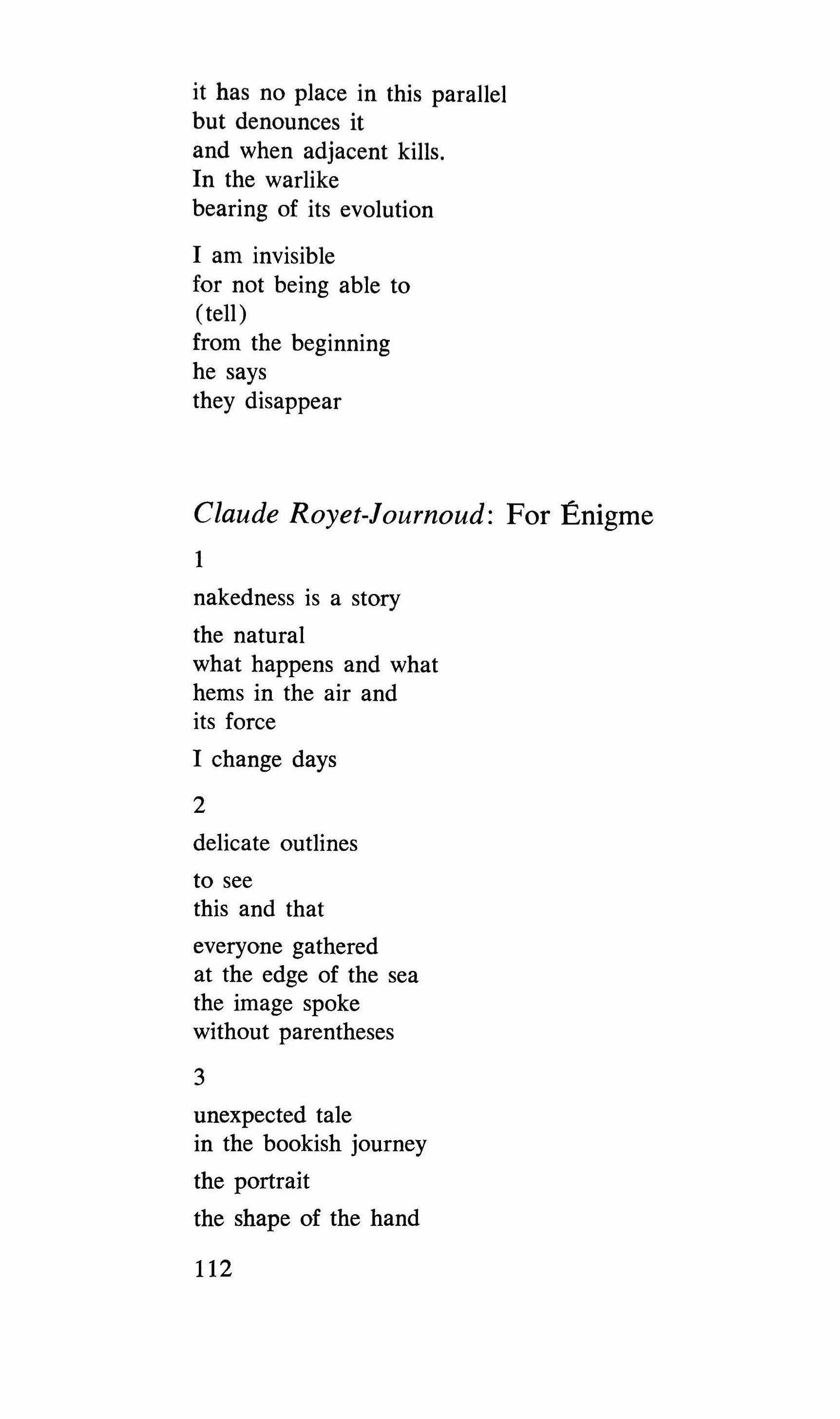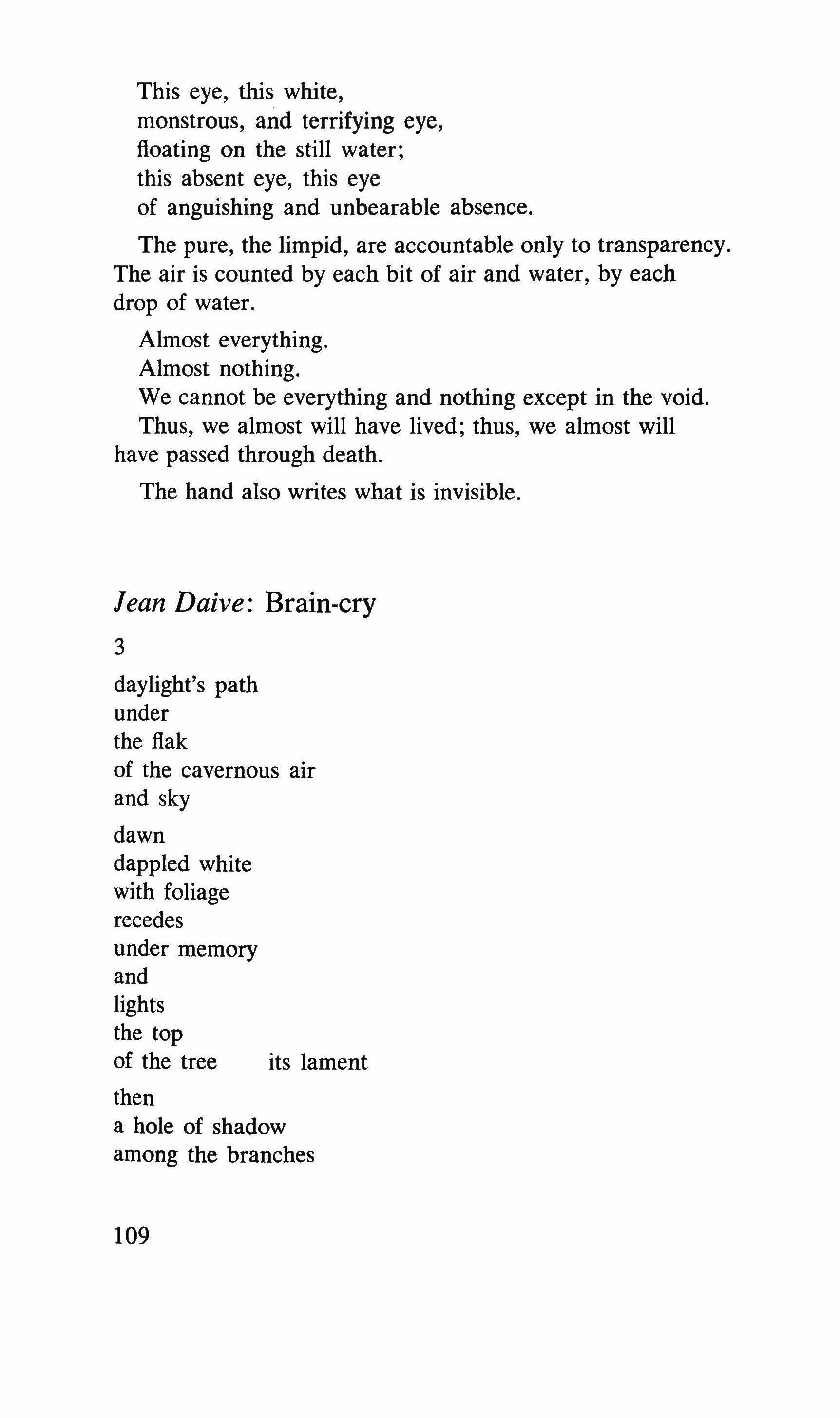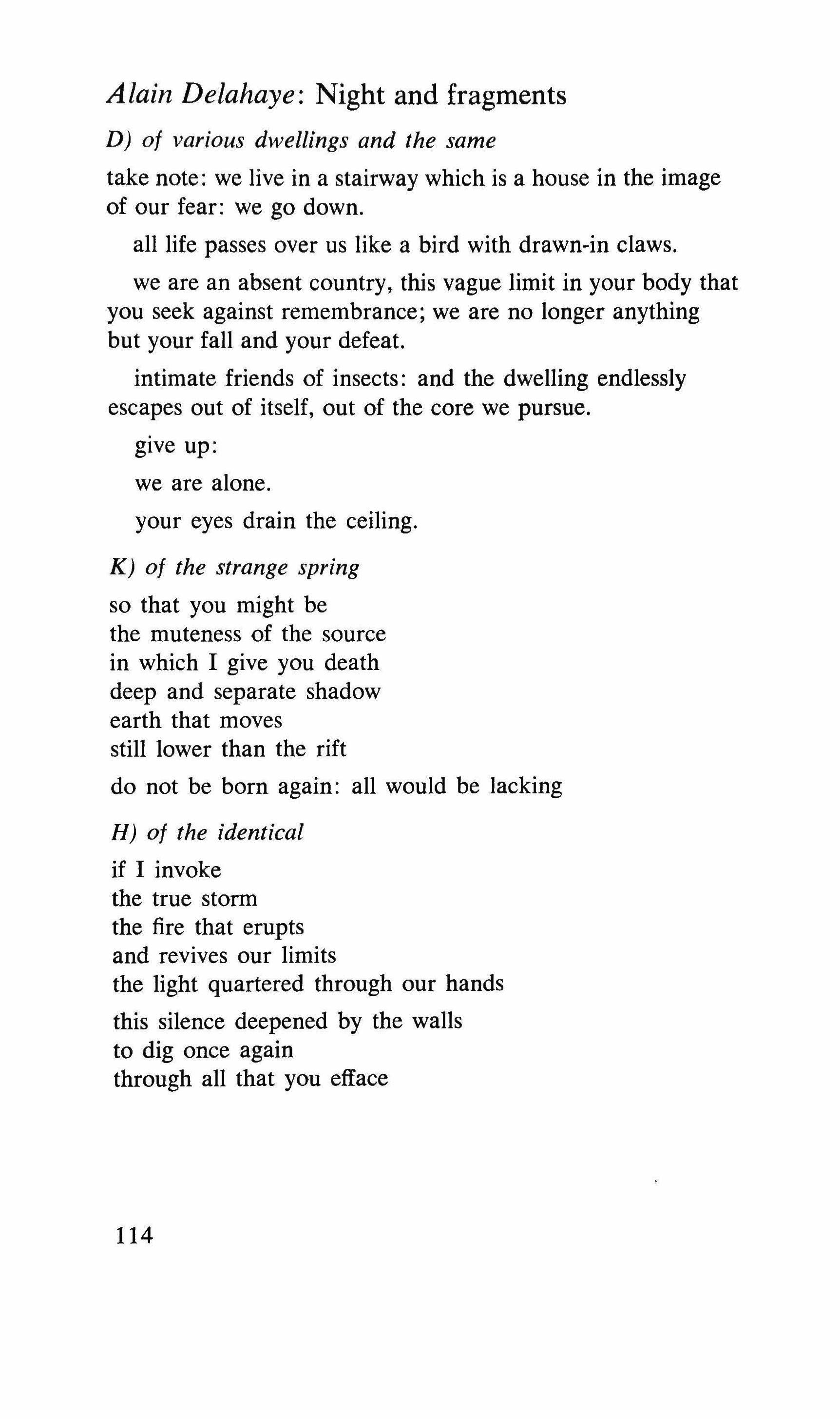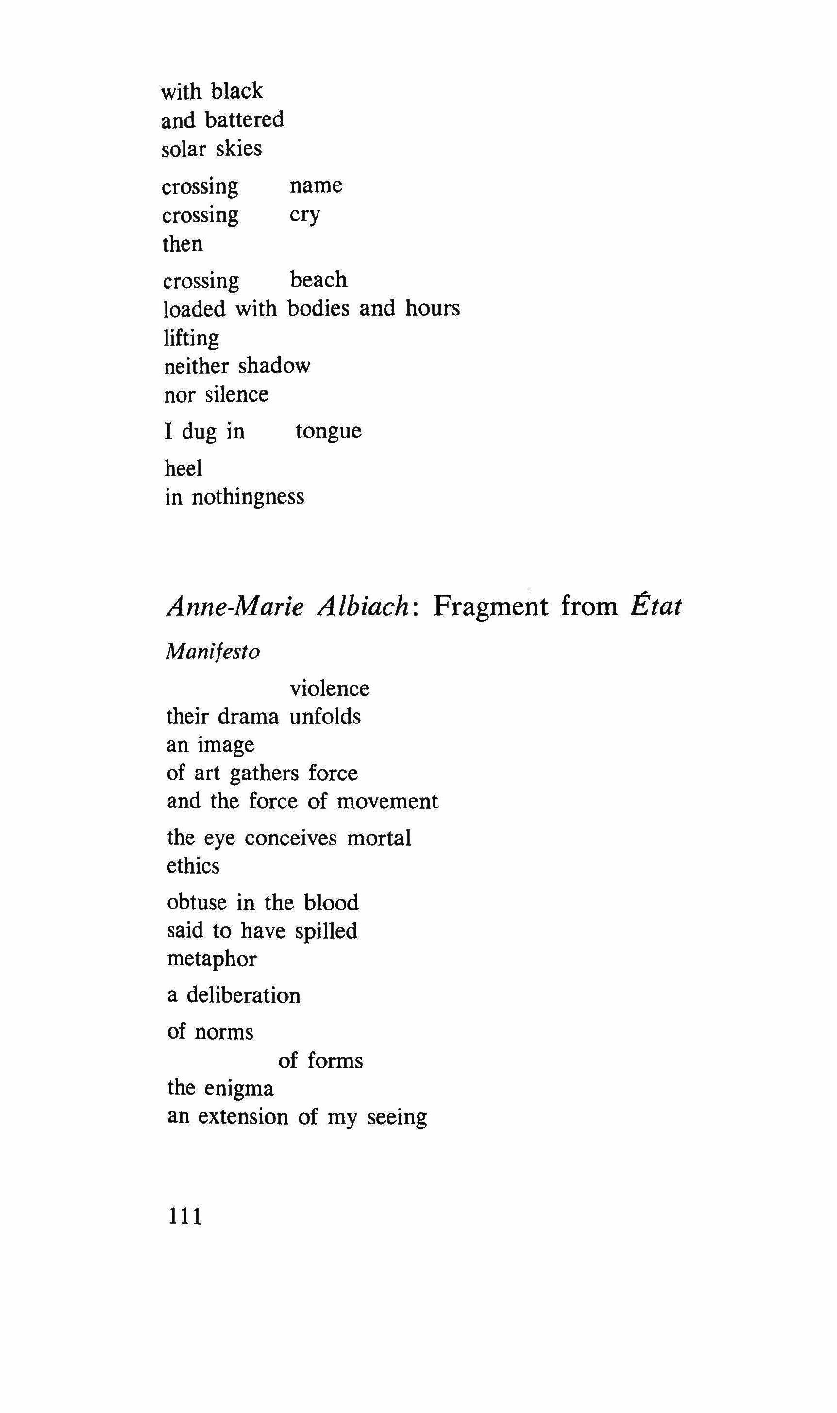 born in Switzerland. His books include Airs (1967) and Lecons (1968). He is also known for his translations of Holderlin, Rilke, Musil, Ungaretti, and others. ROGER GIROUX died in 1974. He published only one volume of poems during his lifetime, L'arbre le temps, which received the Prix Max Jacobs in 1964. A large posthumous collection of his work is being planned. EDMOND JABES was born in Cairo but has lived in France since 1957. His collected poems appeared in 1959 under the title Ie bdtis ma demeure. Since then he has published seven volumes under the general title Le livre des questions: Le livre des questions I, II, III (1963,1964,1965); Yael (1967); Elya (1969); Aely (1972); and EI, ou le dernier livre (1973). He was awarded the Prix des Critiques in 1970. JEAN DAIVE has published several volumes of poems, including Decimale blanche (1967) and Fut bali (1973). He has also published translations of Paul Celan and Robert Creeley. ANNE·MARIE ALBIACH has published three volumes of poetry: Flammigere (1967), Btat (1971), and "B II" lineaires (1974), as well as translations of Louis Zukofsky, Frank O'Hara, and other American poets. CLAUDE ROYET·JOURNOUD has published two volumes of poems: Le Renversement (1972) and Ate (1974), as well as translations of George Oppen. ALAIN DELAHAYE's collection of poems is L'Eveil des Traversees (1971). He has published translations of W. S. Merwin, John Hawkes, and others. PHILIPPE DENIS published his collection of poems, Cahier d'ombres, in 1974, and has published translations of Emily Dickinson. PAUL AUSTER is a poet and translator from New York, presently living in Canada.