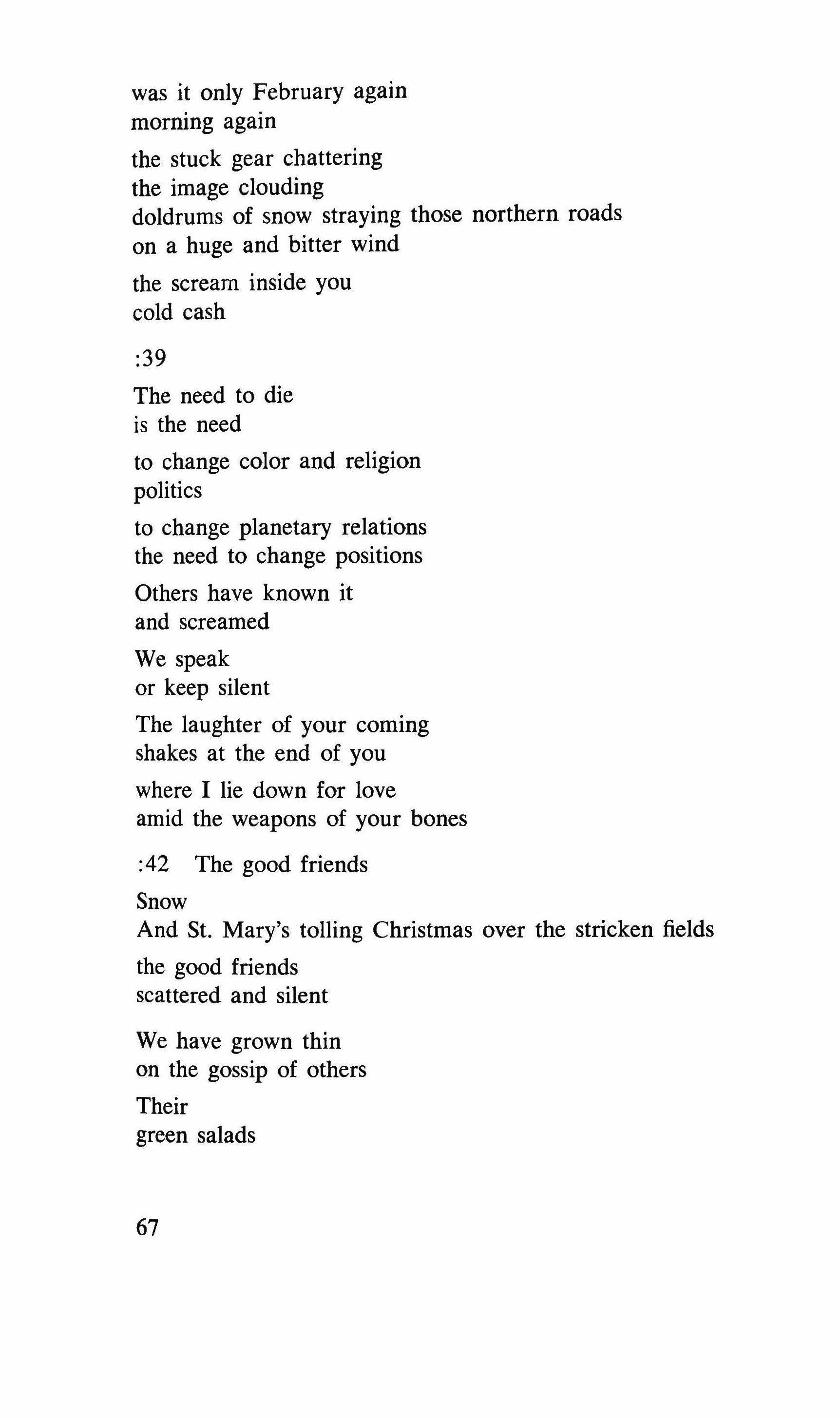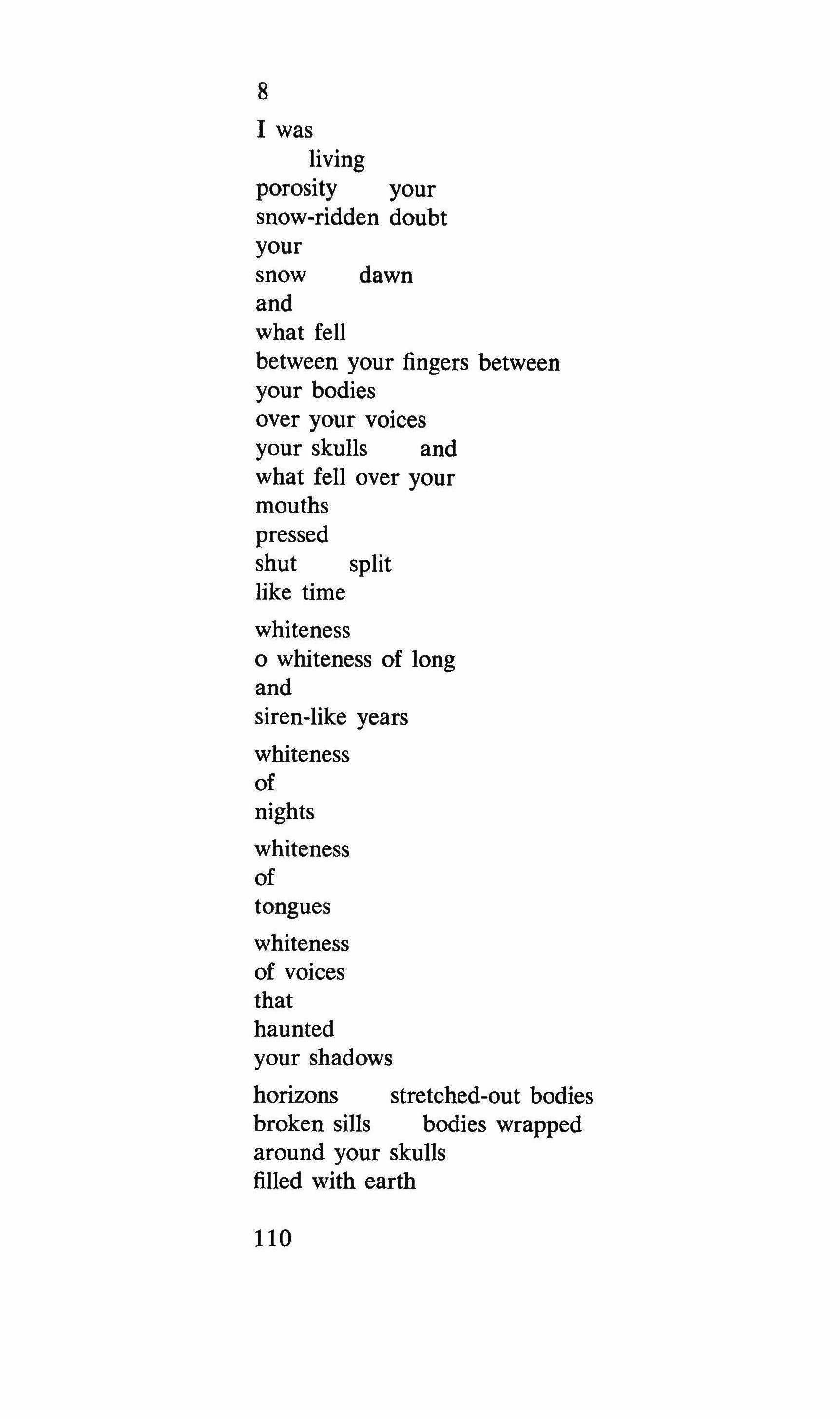 I was living porosity your snow-ridden doubt your snow dawn and what fell between your fingers between your bodies over your voices your skulls and what fell over your mouths pressed shut split like time whiteness o whiteness of long and siren-like years whiteness of nights whiteness of tongues whiteness of voices that haunted your shadows horizons stretched-out bodies broken sills bodies wrapped around your skulls filled with earth