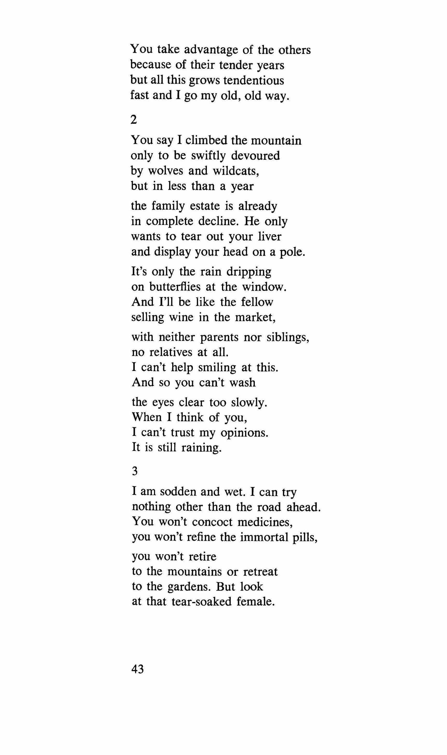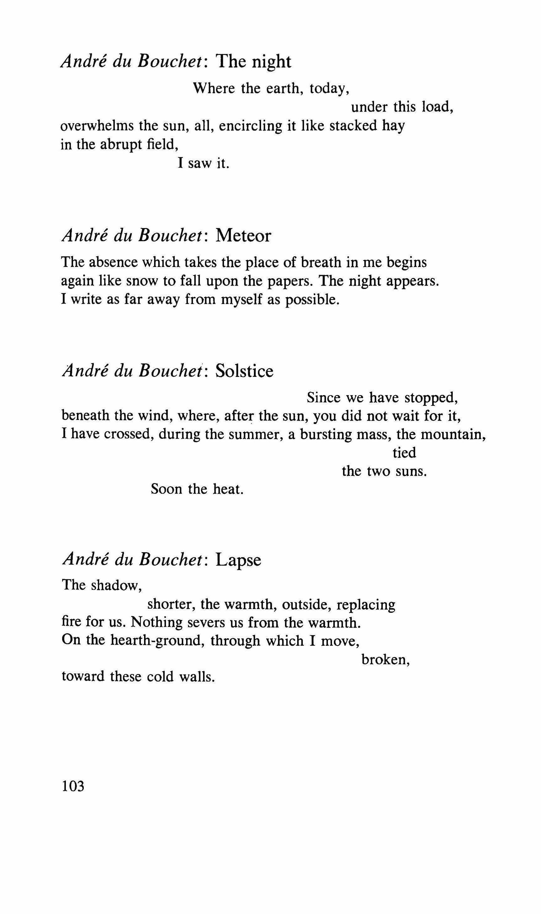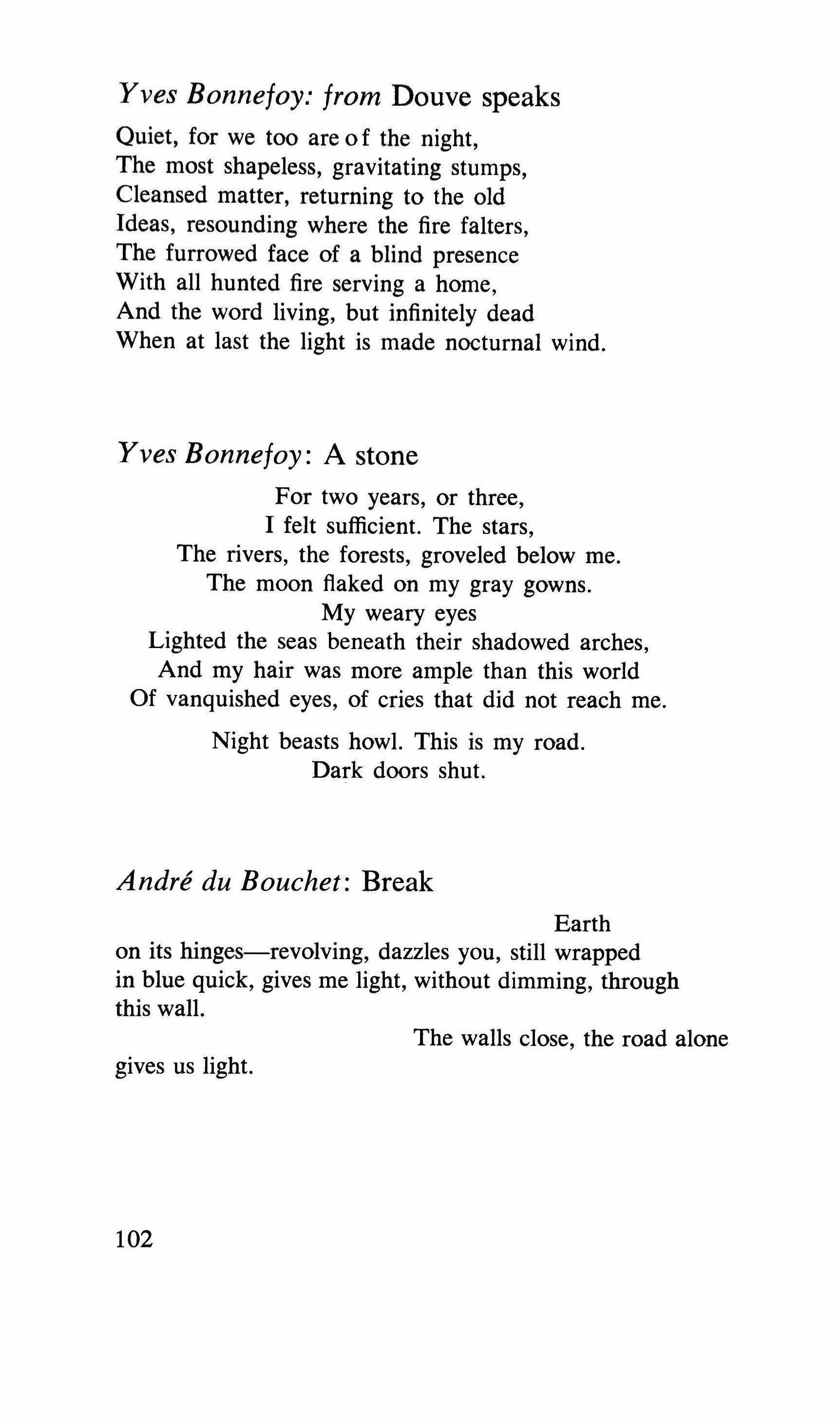 YVES BONNEFOY has published three major collections of poetry: Du Mouvement et de l'Immobllite de Douve (1953); Hier Regnant Desert (1958); and Bierre Ecrite (1965). He has also published several collections of criticism as well as translations of Shakespeare and Yeats. ANDRE DU BOUCHET has published two volumes of poems: Dans la chaleur vacante (1961), which was awarded the Prix des Critiques, and Ou Ie soleil (1968). JACQUES DUPIN's first two books are Gravir (1963) and L'Embrasure (1969). He has also written books on Miro and Giacometti. PHILIPPE JACCOTTET was