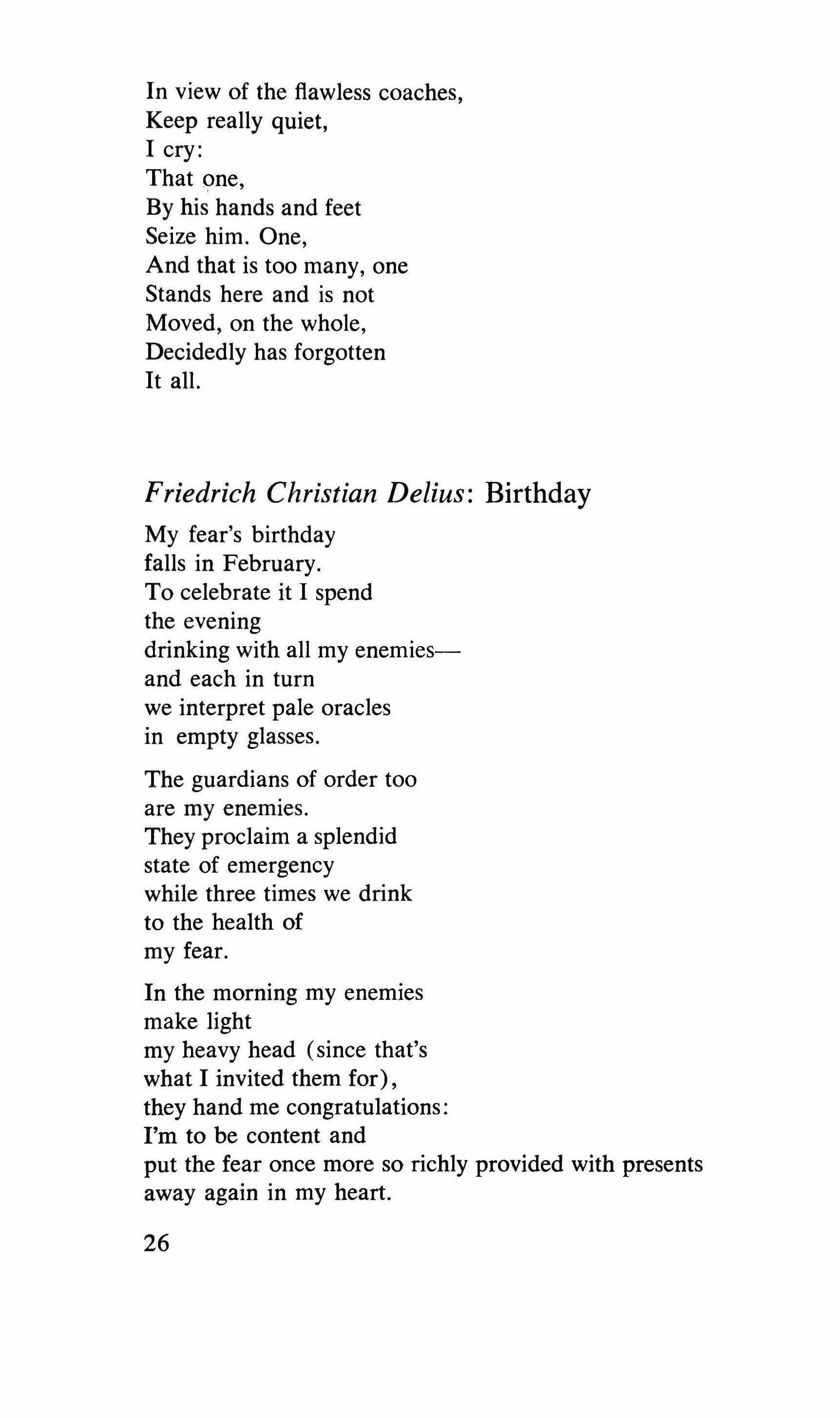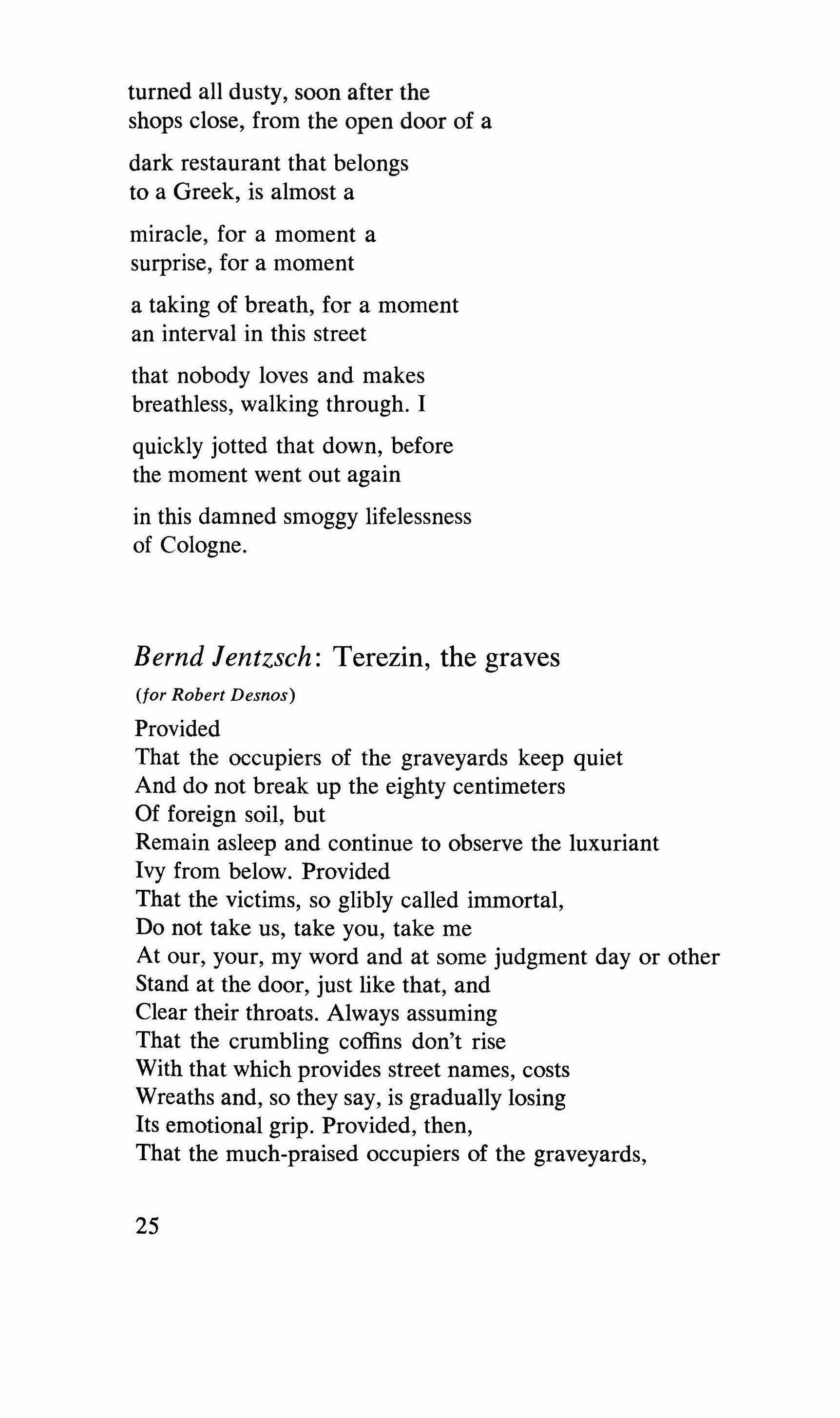 participant in the Cambridge Poetry Festival. His last book is Westwiirts 1 & 2 (1975). BERND JENTZSCH works for an East German publishing house in Berlin and edits a series of poetry pamphlets, Poesiealbum, which is distributed by the East German Post Office. His most recent publication is a volume of short stories, Alphabet des Morgens (1973). FRIEDRICH CHRISTIAN DELIUS was born in Rome but grew up in Hessen. He is best known for his satirical writings about the West German political scene. He has published two volumes of poems, most recently Wenn Wir, bei Rot (1969). MICHAEL HAMBURGER is the noted poet and translator.