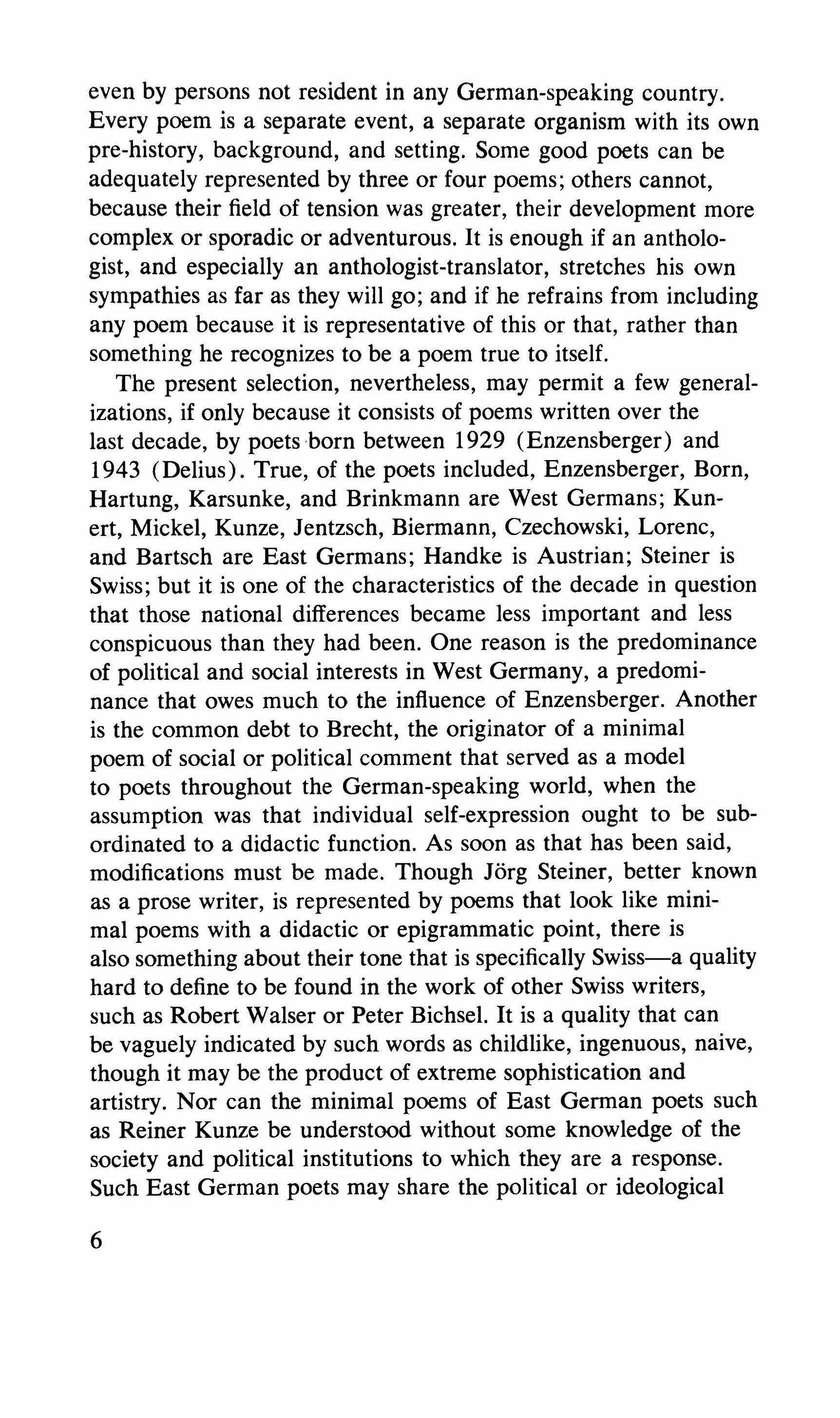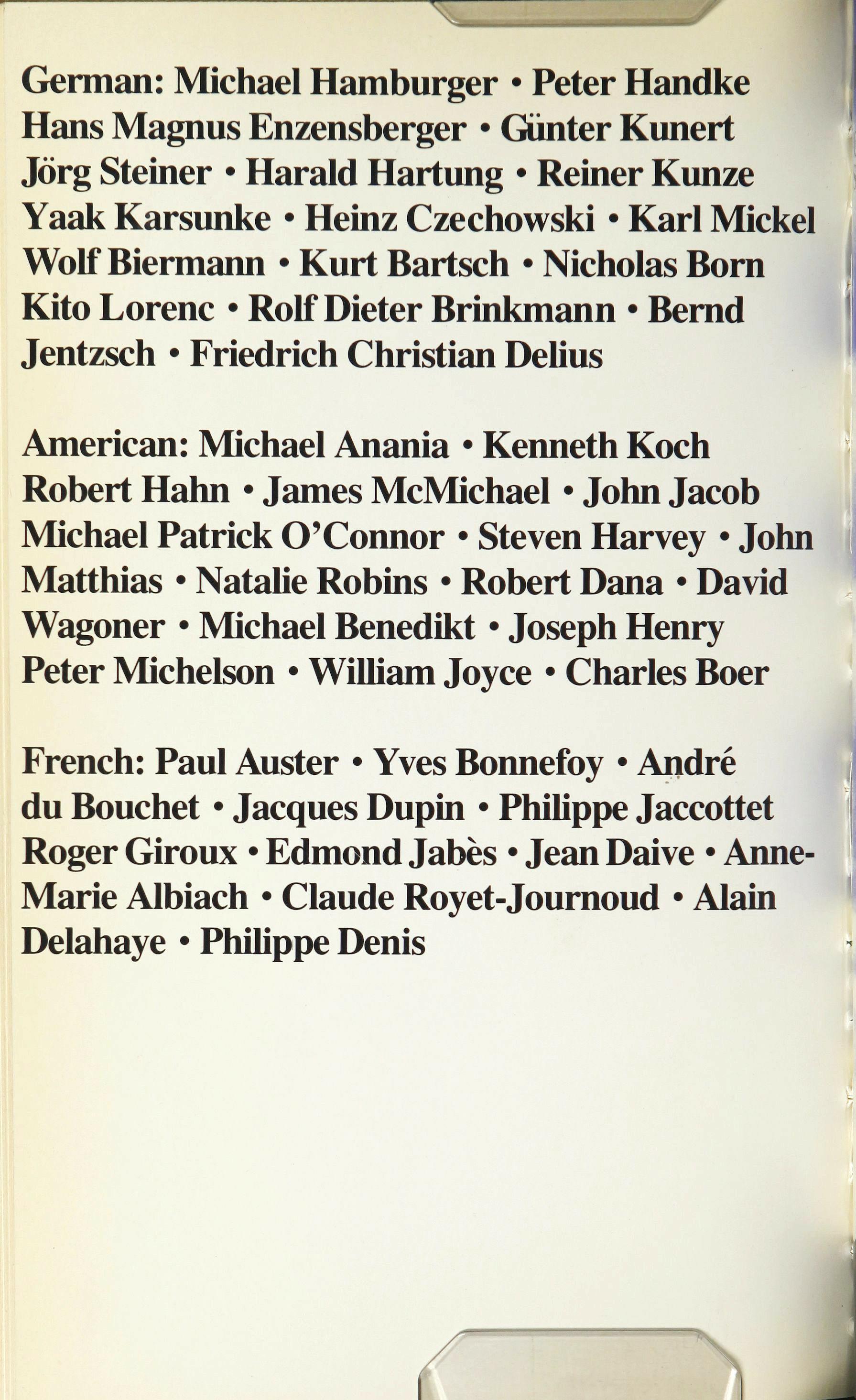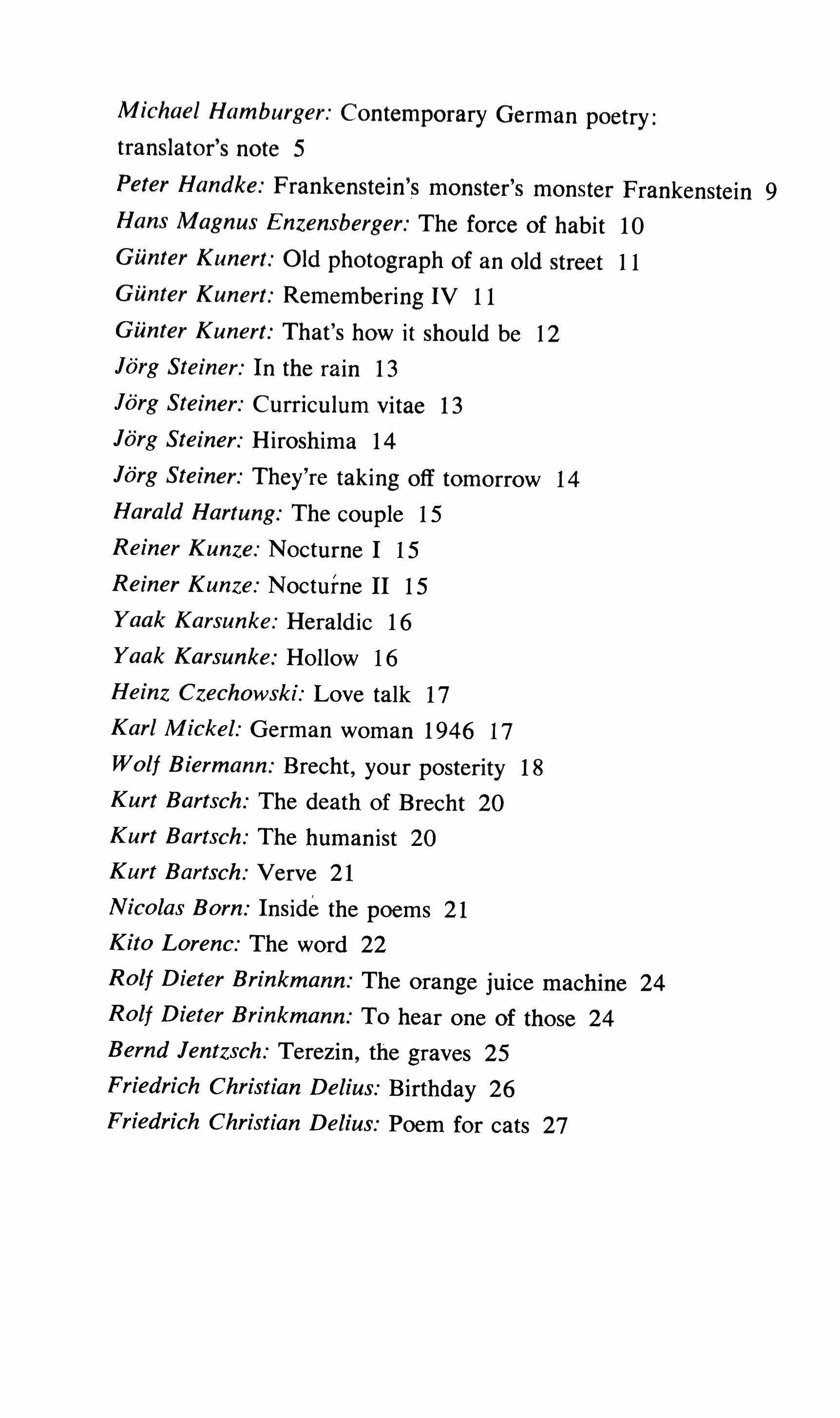 PETER HANDKE was born in Griffen, Carinthia (Austria), and now lives in Paris. Among his recent publications is a volume of poems, Als das Wlinschen Noch Geholien Hat (1974). HANS MAGNUS ENZENSBERGER grew up in Nuremberg, but has lived mainly in Berlin and Norway in recent years. A new collection of his poems about New York will appear soon. GUNrER KUNERT has published fiction and poetry as well as collections of prose poems and fables. He lives in East Berlin. JORG STEINER was born in Viel, Switzerland where he continues to live as a teacher and partner in an art gallery, His volume of poems, Der Schwartze Kasten, was published in 1965. HARALD HARTUNG now lives in East Berlin where he is active as a poet and literary critic. His most recent volume of poetry is Reichsbahngeliinde (1974).