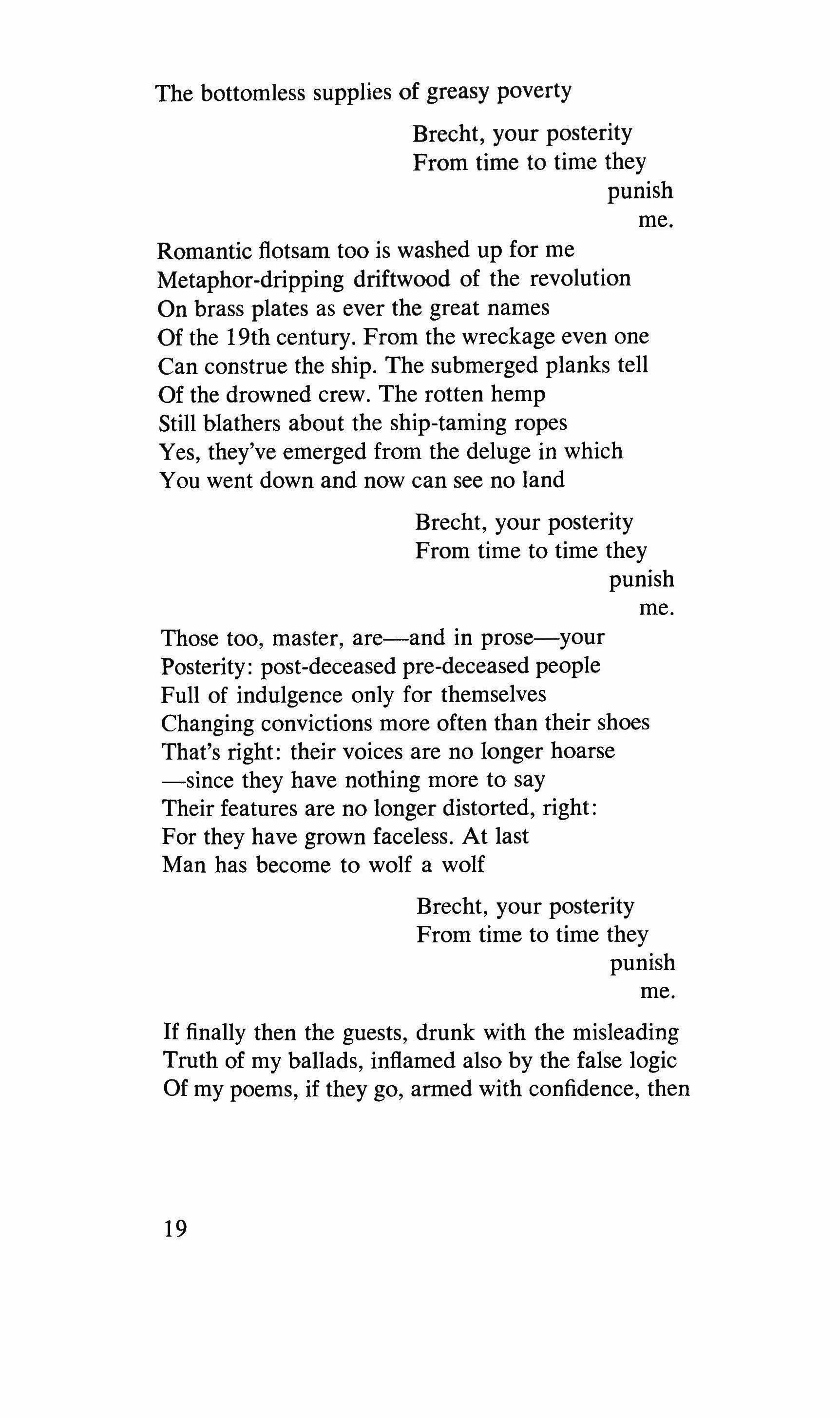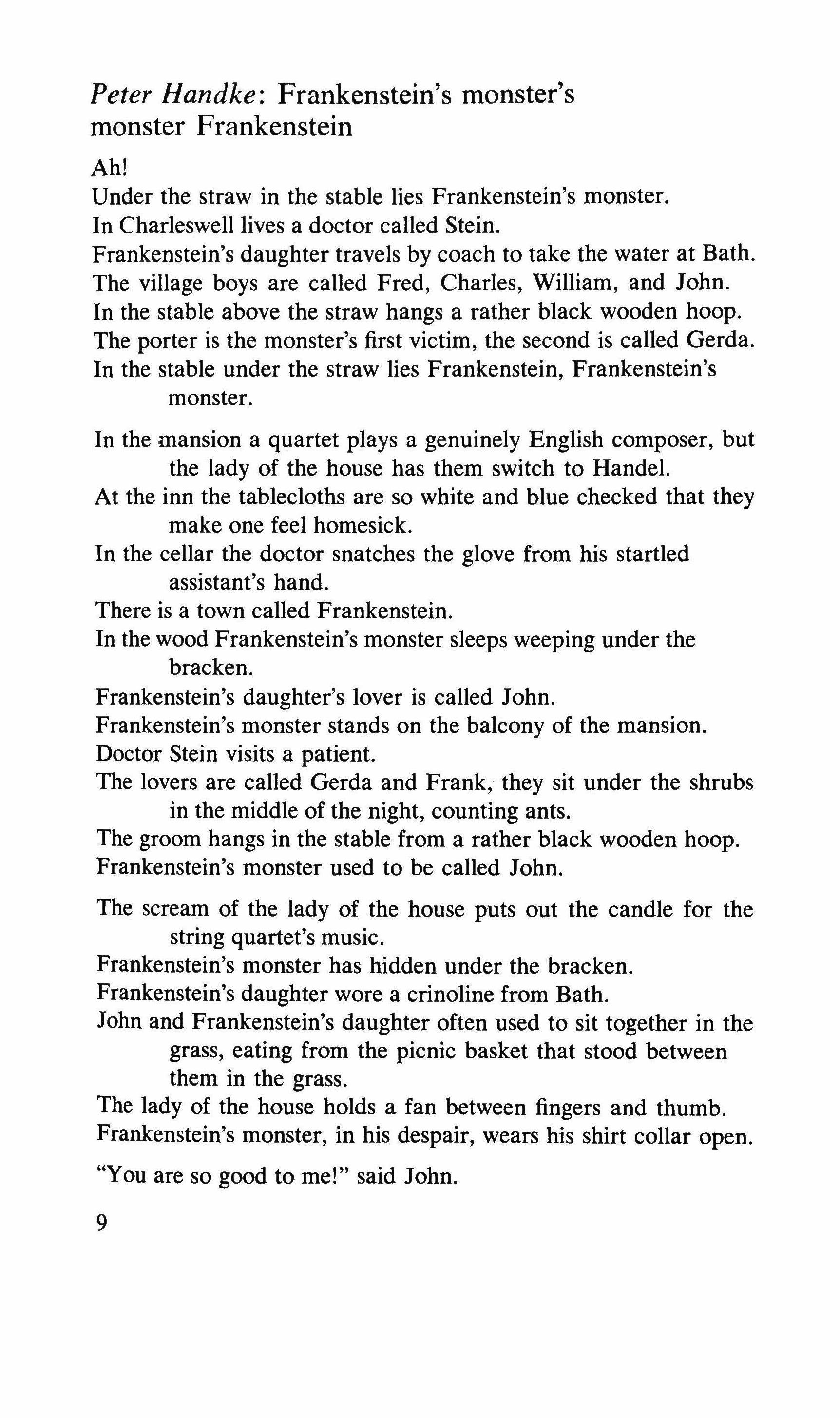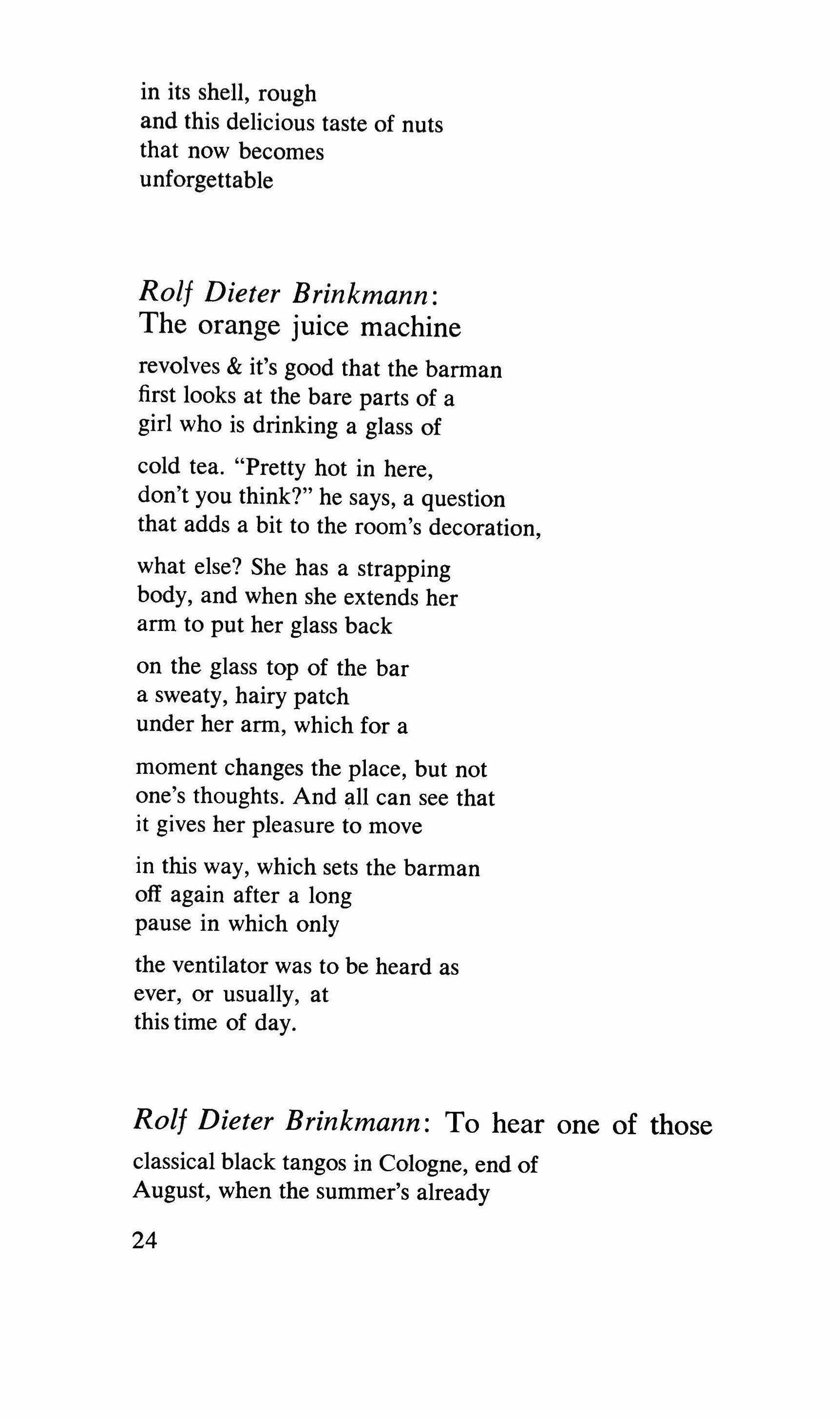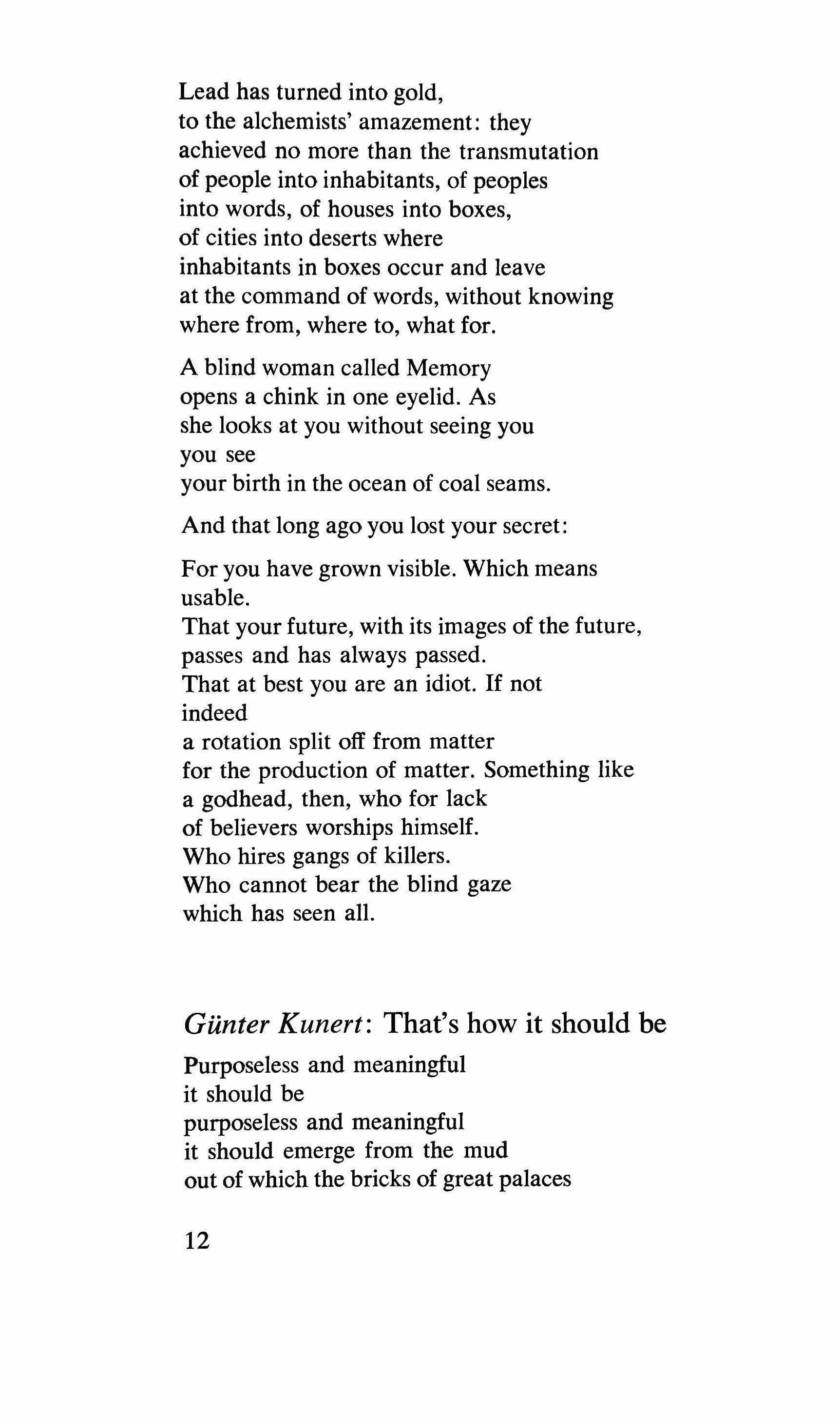 PETER HANDKE was born in Griffen, Carinthia (Austria), and now lives in Paris. Among his recent publications is a volume of poems, Als das Wlinschen Noch Geholien Hat (1974). HANS MAGNUS ENZENSBERGER grew up in Nuremberg, but has lived mainly in Berlin and Norway in recent years. A new collection of his poems about New York will appear soon. GUNrER KUNERT has published fiction and poetry as well as collections of prose poems and fables. He lives in East Berlin. JORG STEINER was born in Viel, Switzerland where he continues to live as a teacher and partner in an art gallery, His volume of poems, Der Schwartze Kasten, was published in 1965. HARALD HARTUNG now lives in East Berlin where he is active as a poet and literary critic. His most recent volume of poetry is Reichsbahngeliinde (1974).