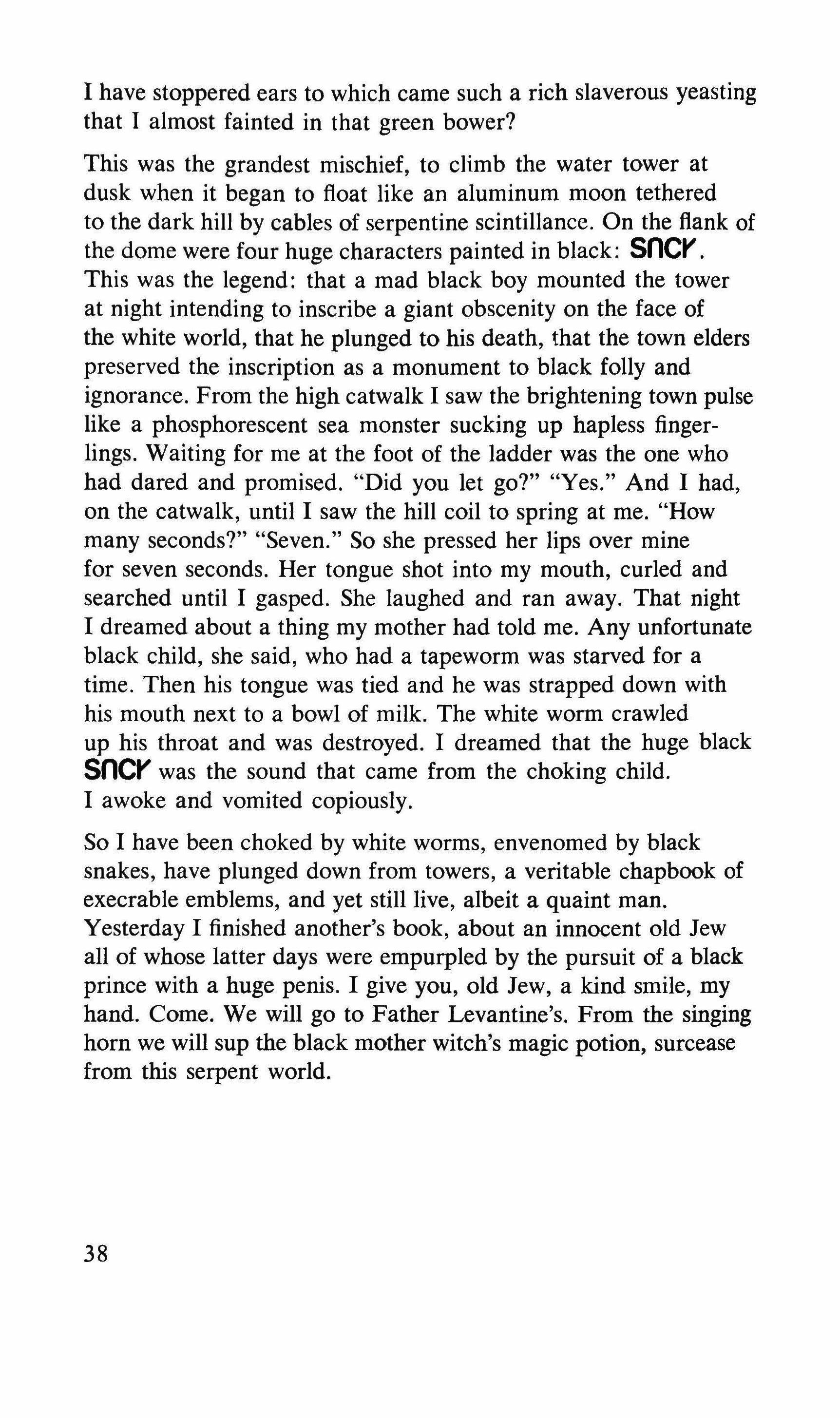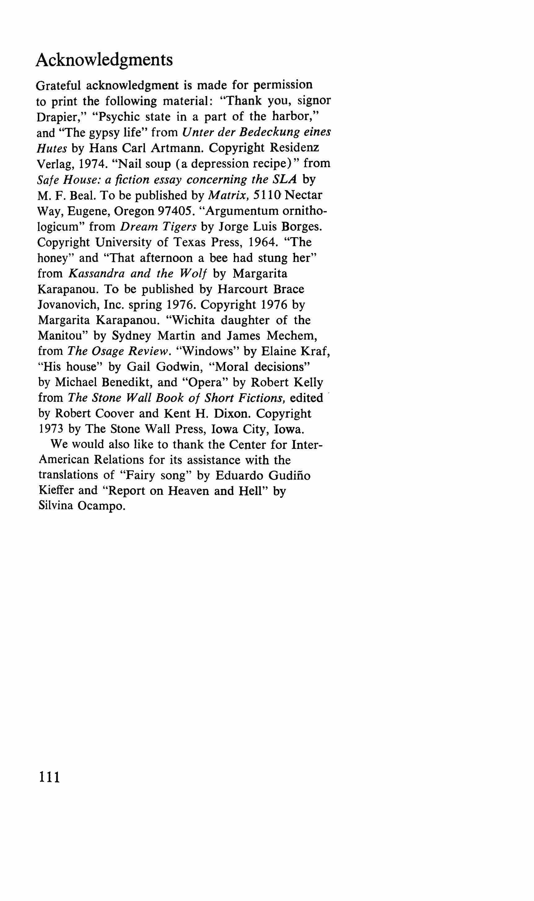 TriQuarterly is an international journal of arts, letters, and opinion published in the fall, winter, and spring at Northwestern University, Evanston, Illinois 60201. Subscription rates: One year $10.00; two years $15.00; three years $20.00. Foreign subscriptions $1.00 per year additional. Single copies usually $3.50. Back issue prices on request. Contributions, correspondence, and subscriptions should be addressed to TriQuarterly, University Hall 101, Northwestern University, Evanston, Illinois 60201. The editors invite submissions, but queries are strongly suggested. No manuscripts will be returned unless accompanied by a stamped, self-addressed envelope. All manuscripts accepted for publication become the property of TriQuarterly, unless otherwise indicated. Copyright © 1976 by TriQuarterly. All rights reserved. The views expressed in this magazine are to be attributed to the writers, not the editors or sponsors. Printed in the United States of America. Claims for missing numbers will be honored only within the fourmonth period after month of issue.