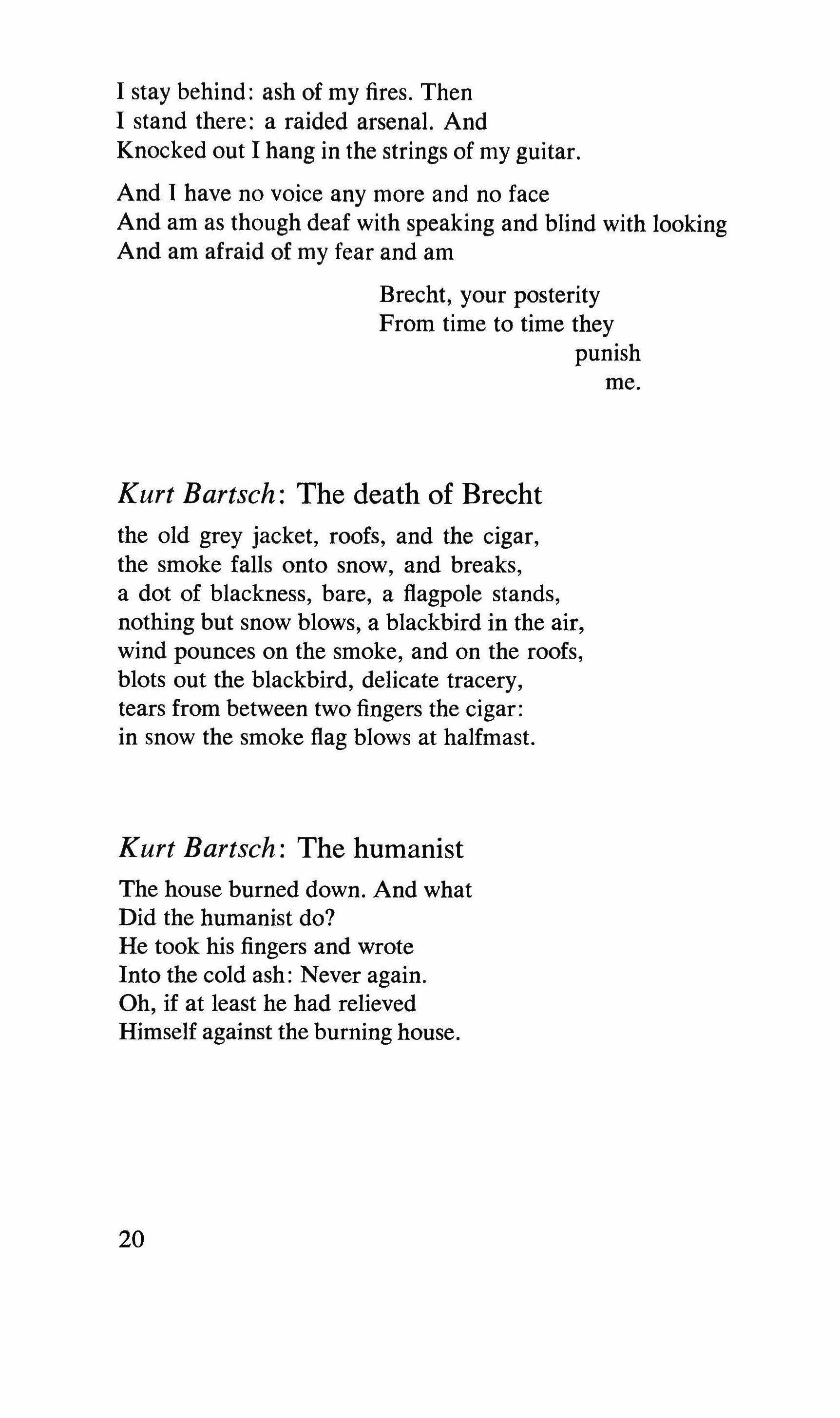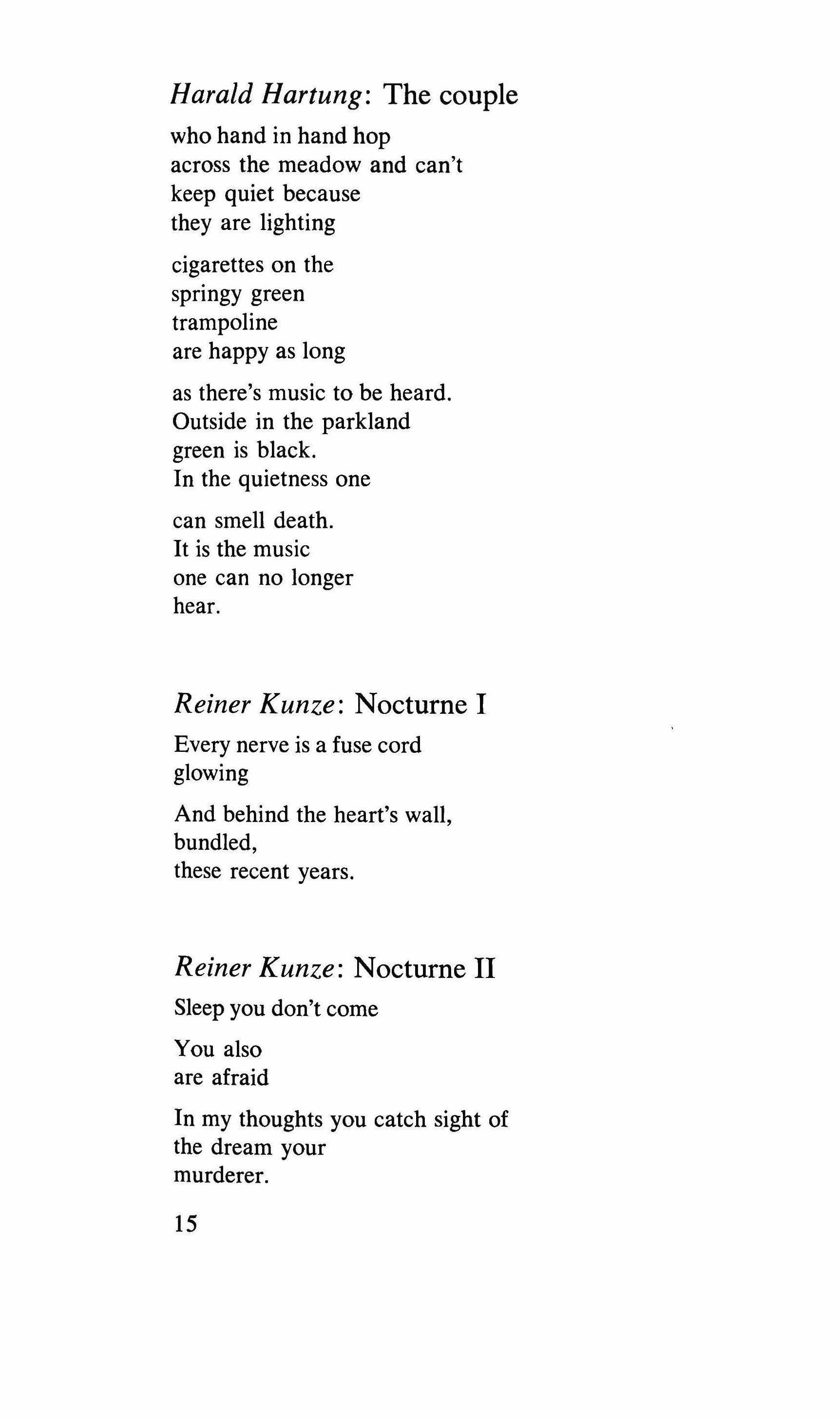 REINER KUNZE is the son of a miner. He has been a member of the faculty at Karl Marx University, a farm laborer, a factory worker, and a journalist. His Selected Poems was published in East Germany in 1973. YAAK KARSUNKE spent part of his childhood in Soviet Russia where his father managed an industrial concern established by the Germans. He has lived in East Berlin since 1949. His most recent volume of poetry is Reden Ausreden (1970). HEINZ CZECHOWSKI was born in Dresden. He is a draftsman by training but presently works as a reader for a publishing house in Halle: His volume of poems, Wasserjahrt, was published in 1967. KARL MICKEL was also born in Dresden. He is a lecturer in economics and lives in East Berlin. His first volume of poems was published in 1963. A second volume, Vita Nova Mea, was published in East Germany in 1966, and in West Germany in 1967. WOLF BIERMANN moved from West Germany to East Germany in 1953, where he studied philosophy and economics. He later worked with Brecht at the Berliner Ensemble. A popular performer of his own satirical songs and ballads, he has been forbidden to appear in public. His most recent volume of poems, Fur Meine Genossen, was published in 1972. KURT BARTSCH was born in Berlin and now lives in East Berlin. He has worked as a telephone operator, clerk, and truck driver's assistant. His publications include Zugluit, a volume of poems, and Die Lachmaschine, a collection of poems, songs, and a prose fragment. NICOLAS BORN worked at a variety of manual and clerical jobs before becoming a writer. He has published a novel and numerous translations of American poetry. His most recent book of poems is Das Auge des Entdeckers (1972). KITO LORENC is of Sorbian descent. He has studied Slavic languages and has worked for the Institute for Sorbian Research at Bautzen. A volume of his poems, Flurbereinigung, was published in 1973. ROLF DIETER BRINKMANN was born in Vechta in 1940. He died in April 1975, after being struck by an automobile in Cambridge, England, where he had been a